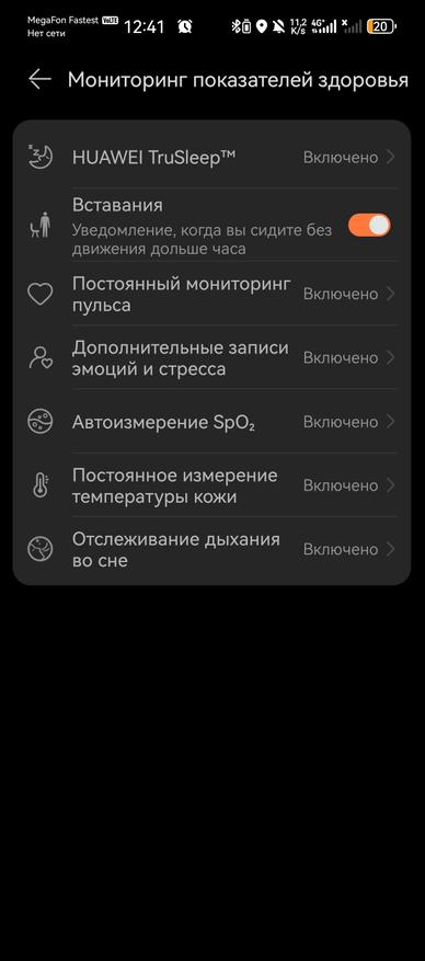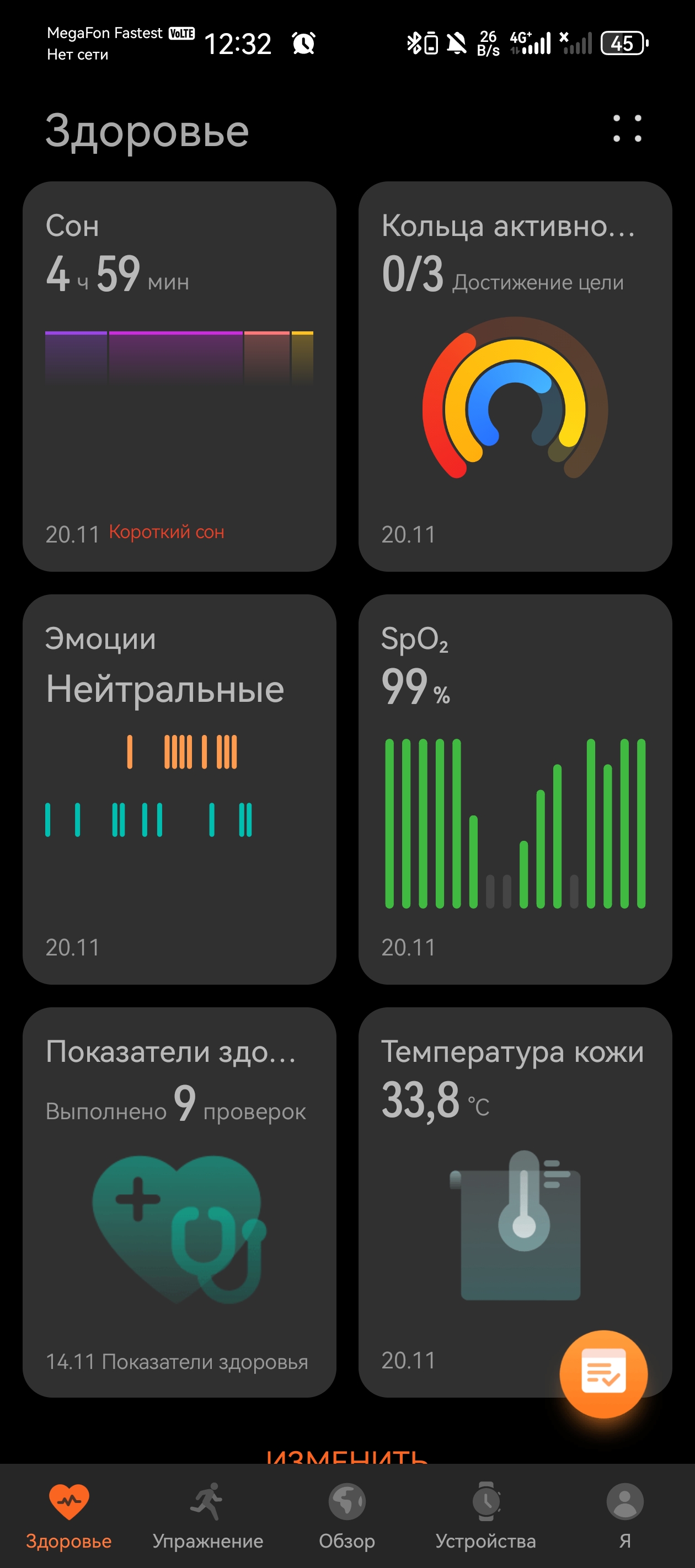 Рабочая область выглядит следующим образом. На главной вкладке находятся все показатели здоровья. В них надо перейти и далее провалиться в дополнительные, чтобы активировать их. Отдельно надо активировать «Эмоции». У меня получилось это сделать с часов. Другая информация — это температура кожи, записи тренировок, кислород в крови.