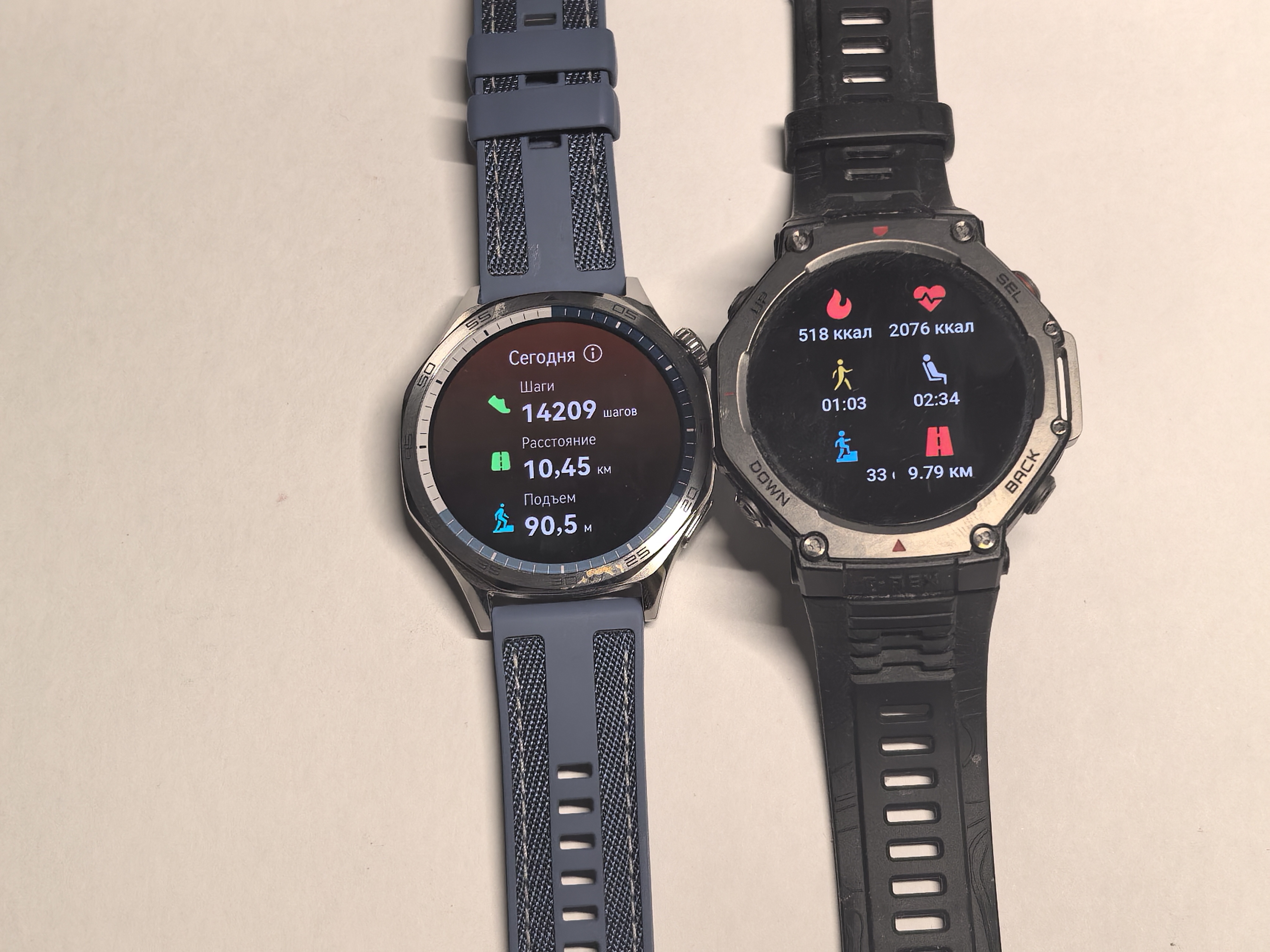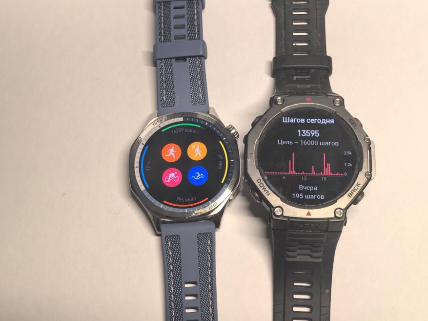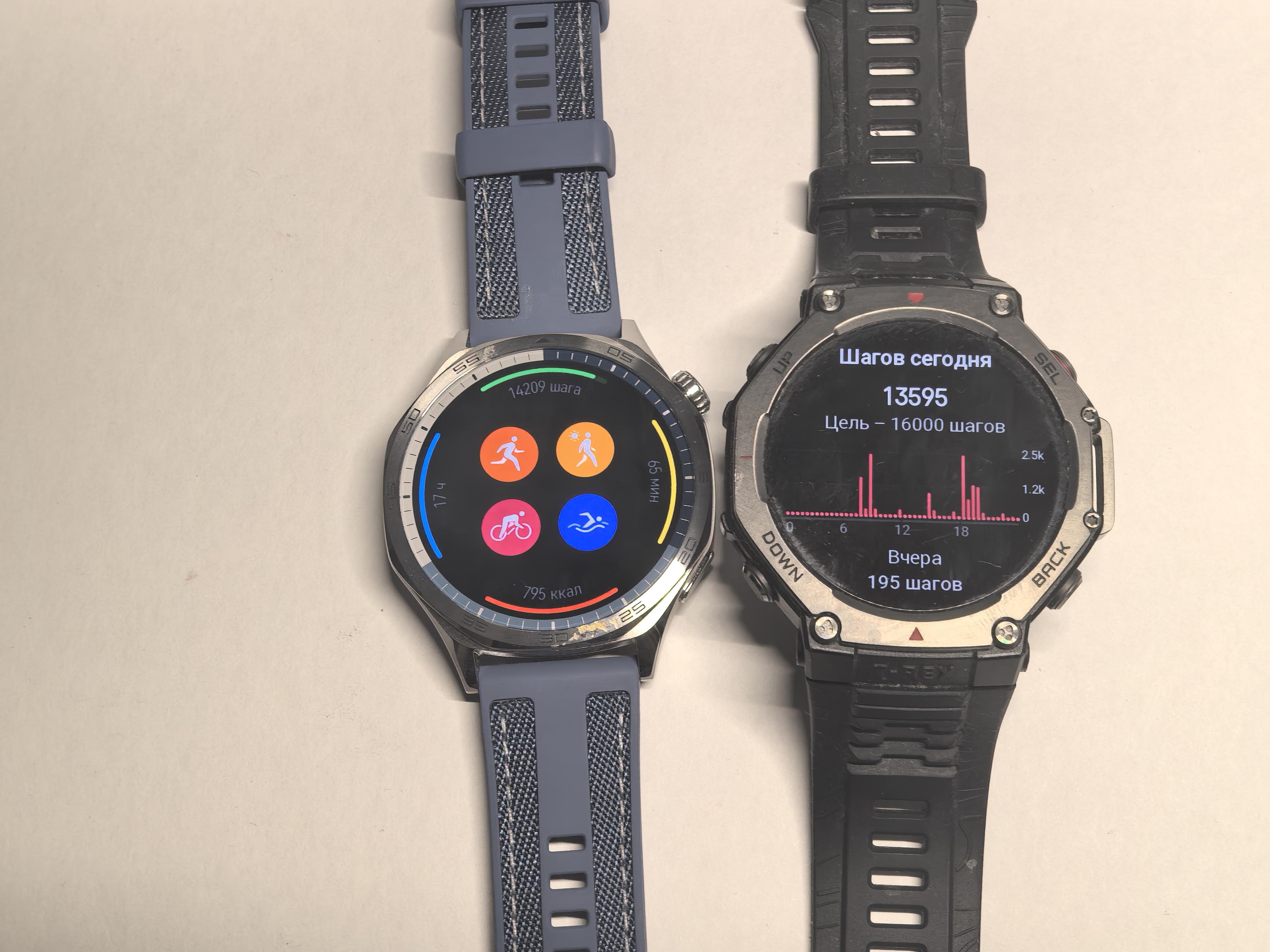 Сравнил данные по шагам с Amazfit T-Rex 3 за день. Результат у часов отличался, но не на много: у обозреваемых на 614 шагов и на 651 м больше, чем у вторых.