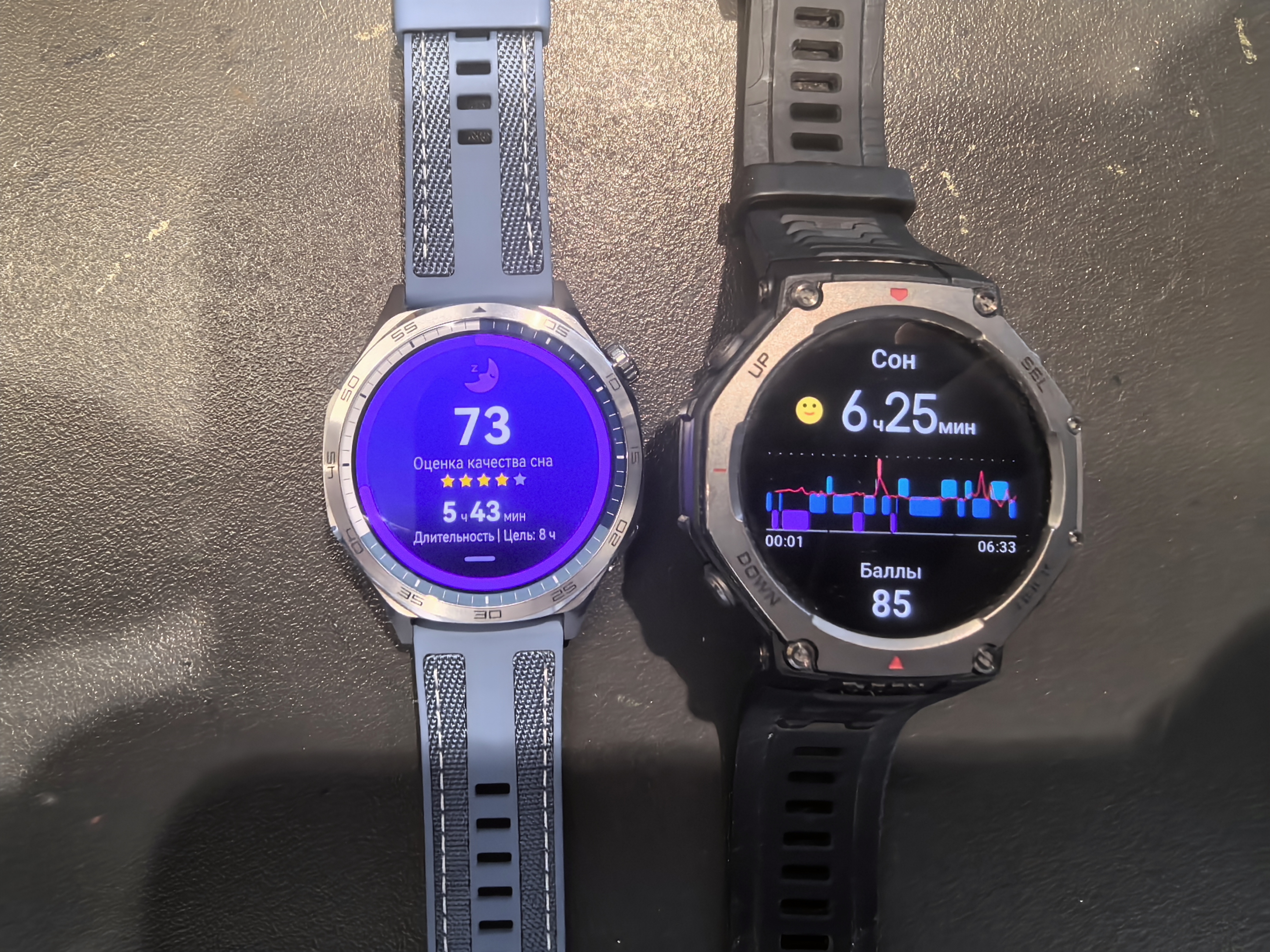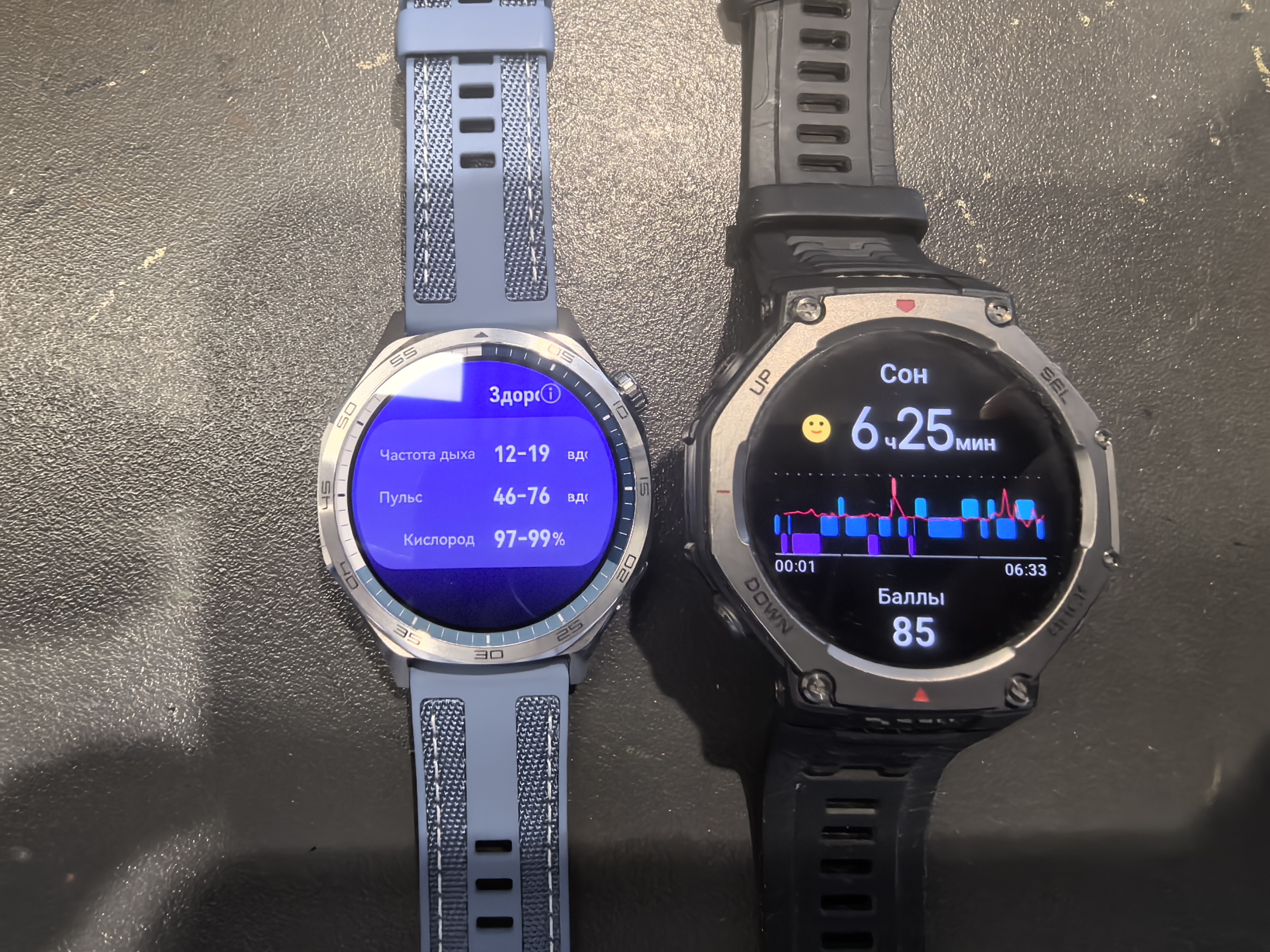 Фазы сна на часах примерно одинаковые: «Быстрый сон» на первых и «REM» на вторых — 1,3 ч и 1,6 ч; «Глубокий сон» и «Медленный сон» — 0,9 ч и 1,3 ч; «Лёгкий сон» и «Быстрый сон» — 3,7 ч и 3,5 ч; но во вторых нет «Бодрствования», а в первых оно длилось 0,7 ч. В результате я выспалась неплохо, что по результатам Watch GT 5 было оценено в 73 балла. Также во время сна считается уровень кислорода в крови, динамика пульса и частота дыхания. В часах Amazfit есть такие же оценки, но не в рамках вкладки сон, точнее не все в этой вкладке.