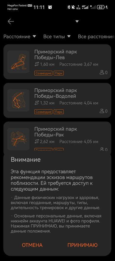 Как сказал во вступлении, в часах есть поддержка карт местности при занятии спортом. Было обновление, которое улучшает работу с ними. При обновлении системы на часах, на телефоне появляется сообщение с предложением включить Wi-Fi для ускорения передачи данных. Watch GT 5 официально не имеют Wi-Fi, но он в часах есть, как получается, только для передачи обновлений. По Bluetooth было бы потрачено много больше времени для загрузки их на часы.