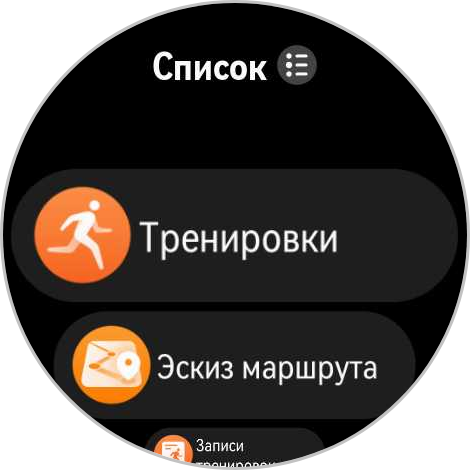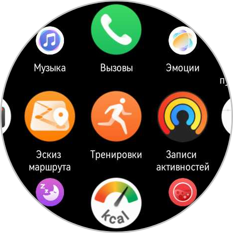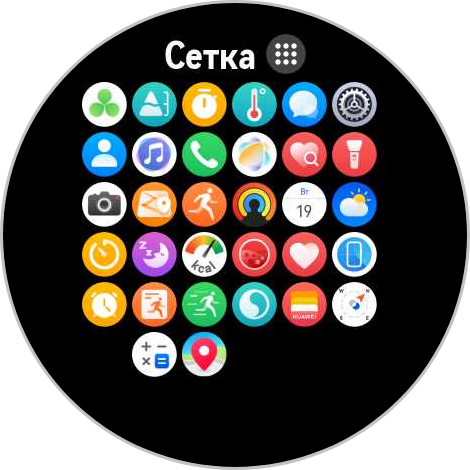 Доступ ко всем программам можно получить нажатием на верхнюю кнопку. Вид такого меню можно настроить из него, не прибегая к «Настройкам». Есть два варианта: сетка, список. Можно увеличить каждую иконку приложения так, что под ней появится ее название. Количество иконок в меню составляет 32 шт., что меньше, чем 34 шт. на HUAWEI Watch D2 (обзор здесь). У вторых нет «Эмоций», а у первых «Артериального давления» и «Артериальной жёсткости сосудов».