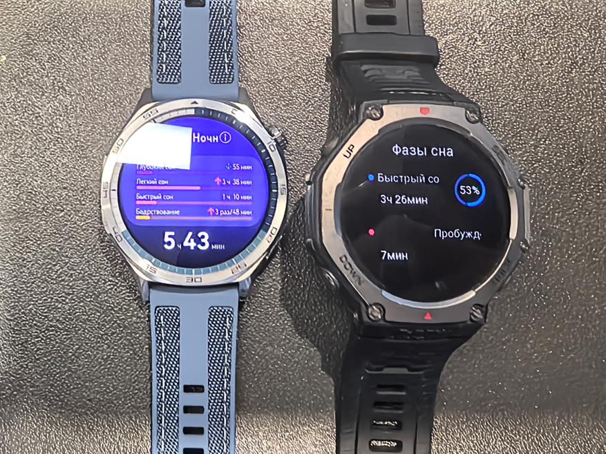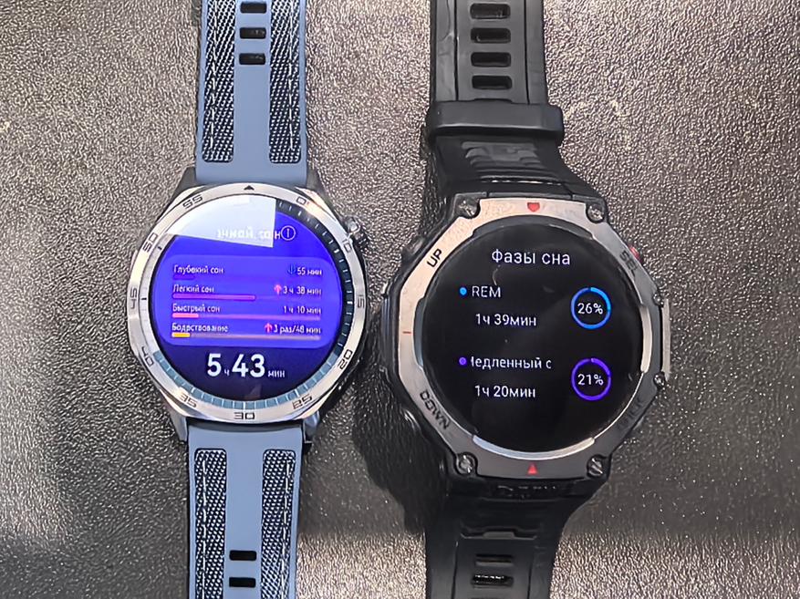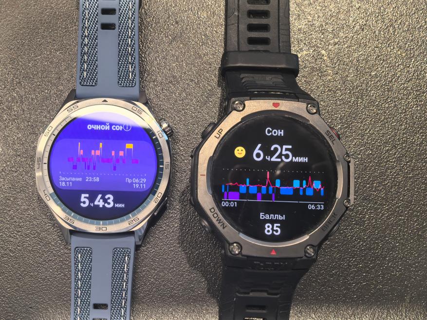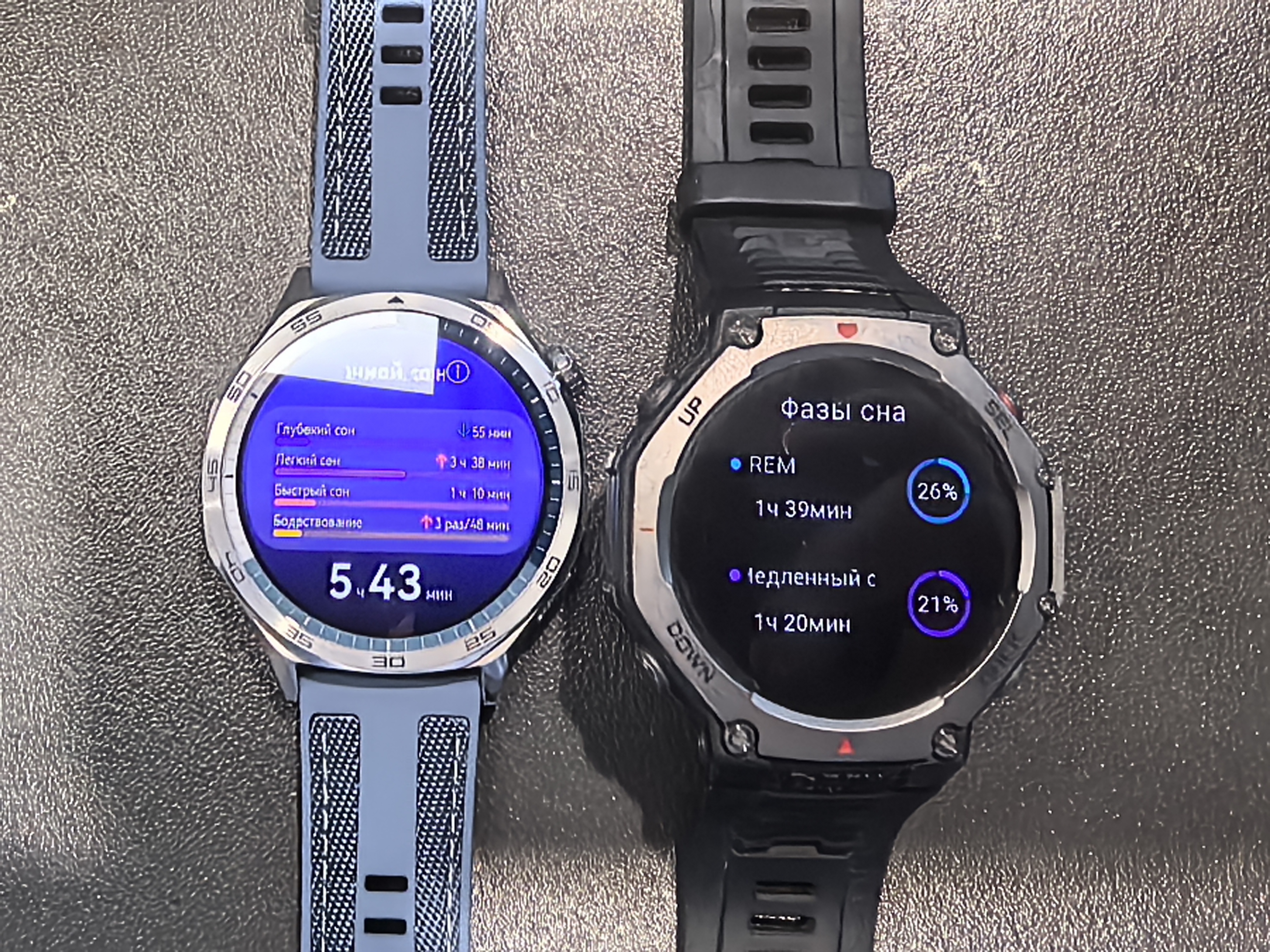 Сравнивал сон обозреваемых с двумя часами, но приведу результат только со вторыми — Amazfit T-Rex 3 — так как у первых (HUAWEI Watch D2) показания были близкими. Было интересно увидеть динамику сна с другим брендом. Как видно из сравнения, Amazfit не подсчитали длительное пробуждение. Поэтому по ним сон длился дольше.
