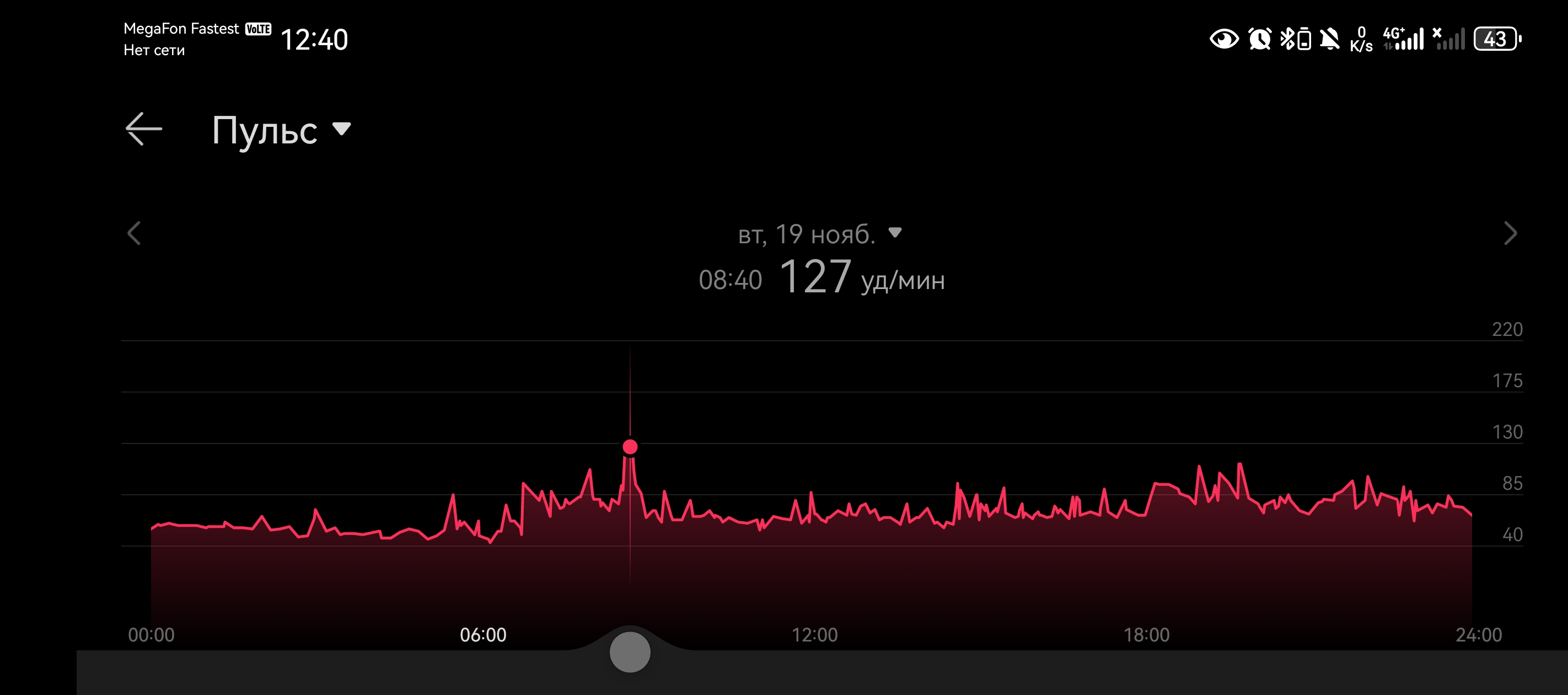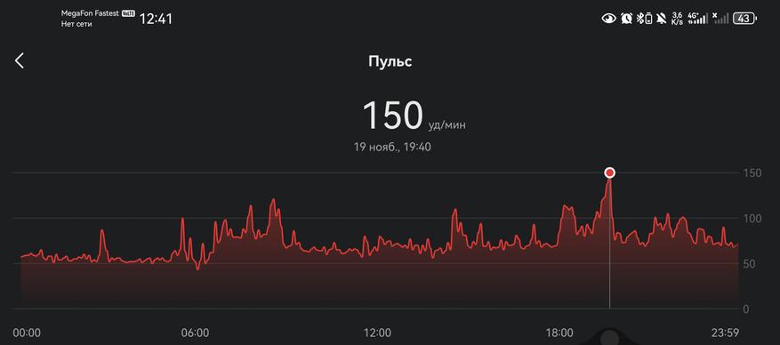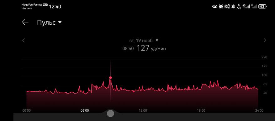 Ниже показал два графика пульса за день с обозреваемых и T-Rex 3. Как мне показалось с первого взгляда, вторые представили более правдоподобный результат, так как в период двух пиков вечером этого дня, в особенности в 19:40, я как раз был в небольшой тренировке. На снимке экрана Huawei Health верхняя граница графика больше, поэтому кажется, что данные другие. Они отличаются все равно от тех, что представлены из приложения Zepp. Такие отличия можно списать на нахождение двух часов на разных руках.
