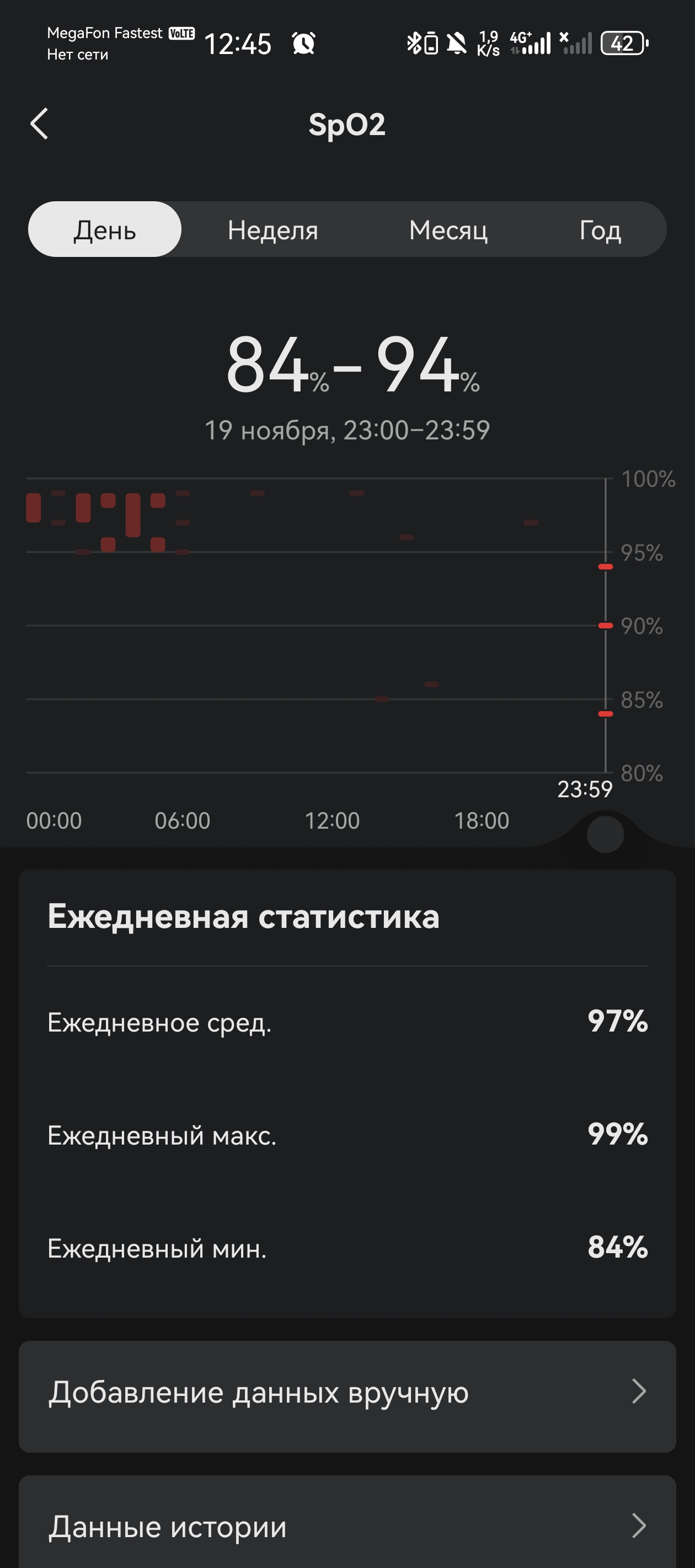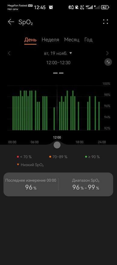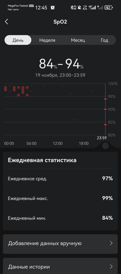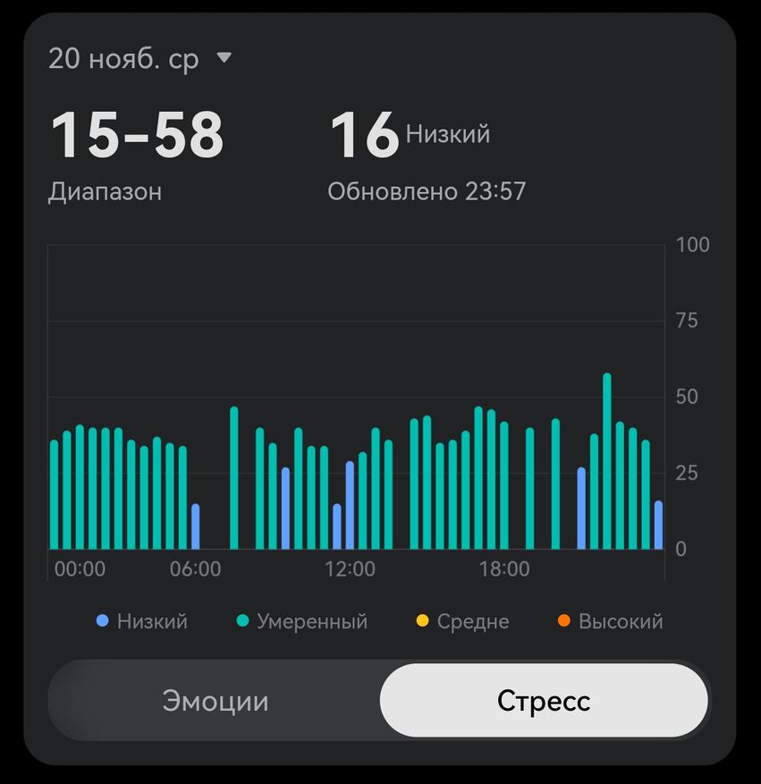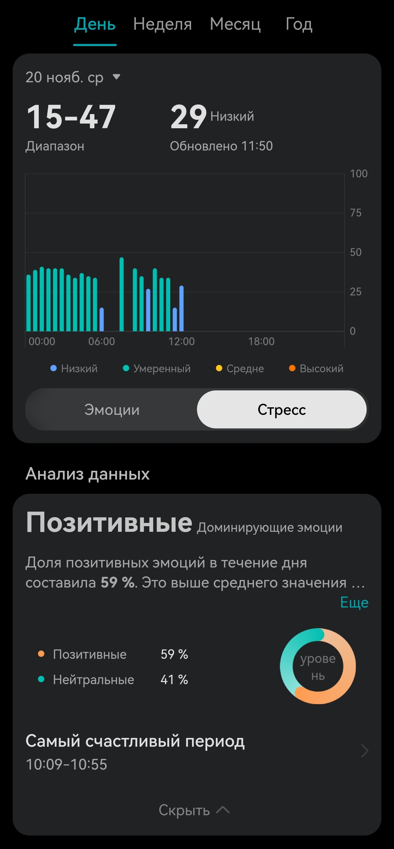 Ниже привел два скриншота показателей «Эмоций» и «Стресса». Можно наглядно сравнить динамику обоих. В моменты, когда было негативное настроение, часы не всегда описывали это, как, к примеру, в интервале с 18:00 до 19:00, высоким уровнем стресса. Он просто был повышенным, но в рамках. После этого периода настроение отмечено, как с переизбытком плохих эмоций. Фитнес-часы — это ни разу не медицинский инструмент, но в таких «развлекательных» опциях приятно находить параллели с действительностью. В названые периоды показатель «Стресса» вел себя монотонно, хотя по эмоциям видно, что должны были быть «просадки». Компании HUAWEI есть ещё куда усовершенствовать алгоритм, так как не все работает, как это есть на самом деле. Имеющийся опционал все равно лучше из тех, что у меня был с другими умными часами.