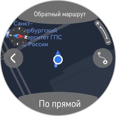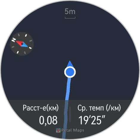 Во время занятий спортом с возможностью записи трека можно видеть карту передвижения. Скачать карты можно через Huawei Health. Подробнее про это рассказал в разделе «Приложение». Скриншоты экрана с маршрутом во время тренировок показал ниже. Касанием экрана можно передвигаться по карте, колесом прокрутки — изменять масштаб. Если коснуться экрана один раз, то в нижней части будет показано пройденное расстояние и средний темп. Для построения обратного маршрута надо нажать кнопку справа на экране. Можно выбрать, как возвращаться, или по прямой, или по своему маршруту.