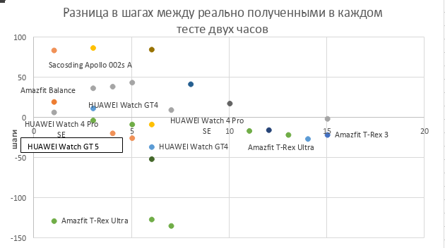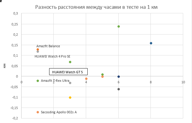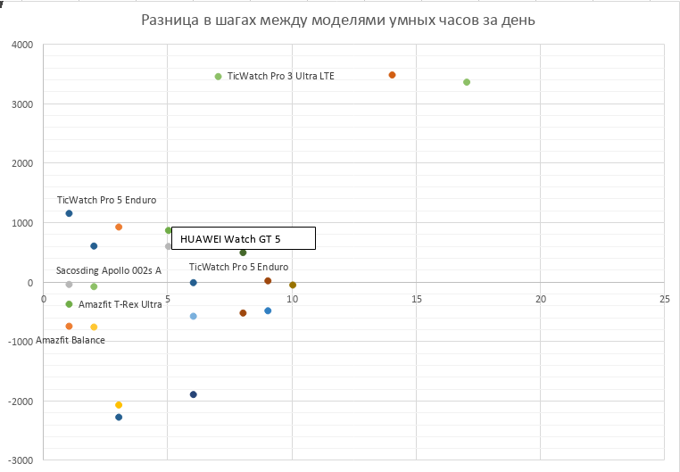 Привел график подобных сравнений ниже (отметить все точки не получилось, так как заменитель Microsoft Office отказался это делать). Точки на графике показывают разницу умных часов относительно других, с которыми я их сравнивал,