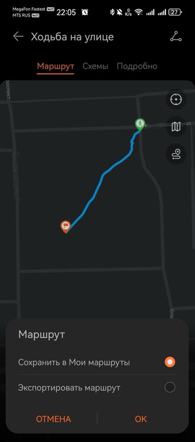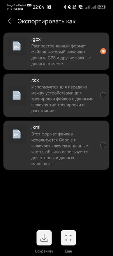 После окончания тренировки в Huawei Health будет возможность не только просмотреть про нее информацию, но и выгрузить маршрут. Доступны три разрешения — .gpx, .tcx, .kml. Такие возможности — прямая отсылка к спортивным часам Amazfit, Garmin и других.