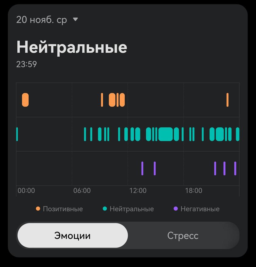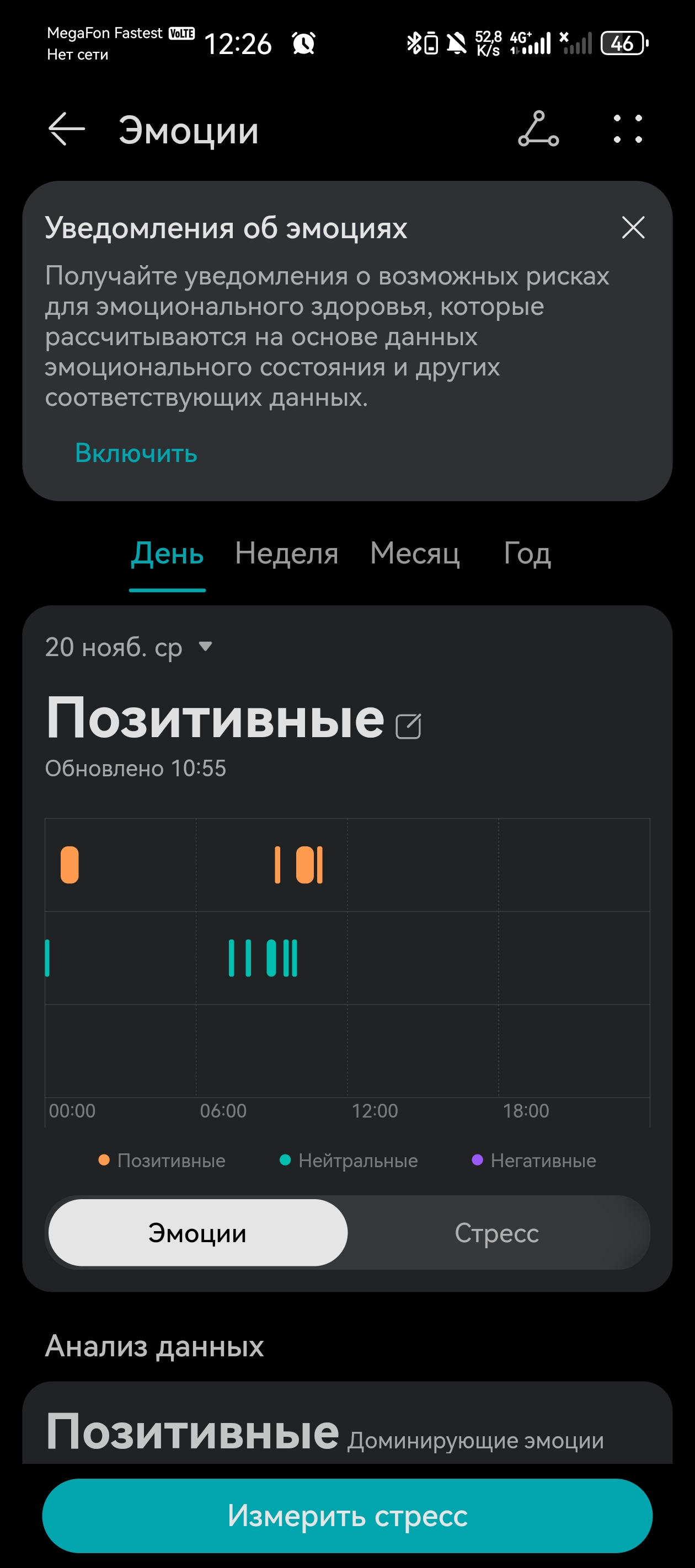 Как понимаю, пока данная опция не доступна даже на недавних HUAWEI Watch D2, не говоря уже о прошлых моделях. Как по мне, она получилась интересной и не бесполезной. К вечеру эмоции бывают и в негативной зоне, что соответствует действительности (особенно, если это вечер воскресенья). Бывает периоды нейтрального и повышенного эмоционального фона. Это примерно вписывается в мои ощущения. Мне такая метрика здоровья кажется отнюдь не лишней.