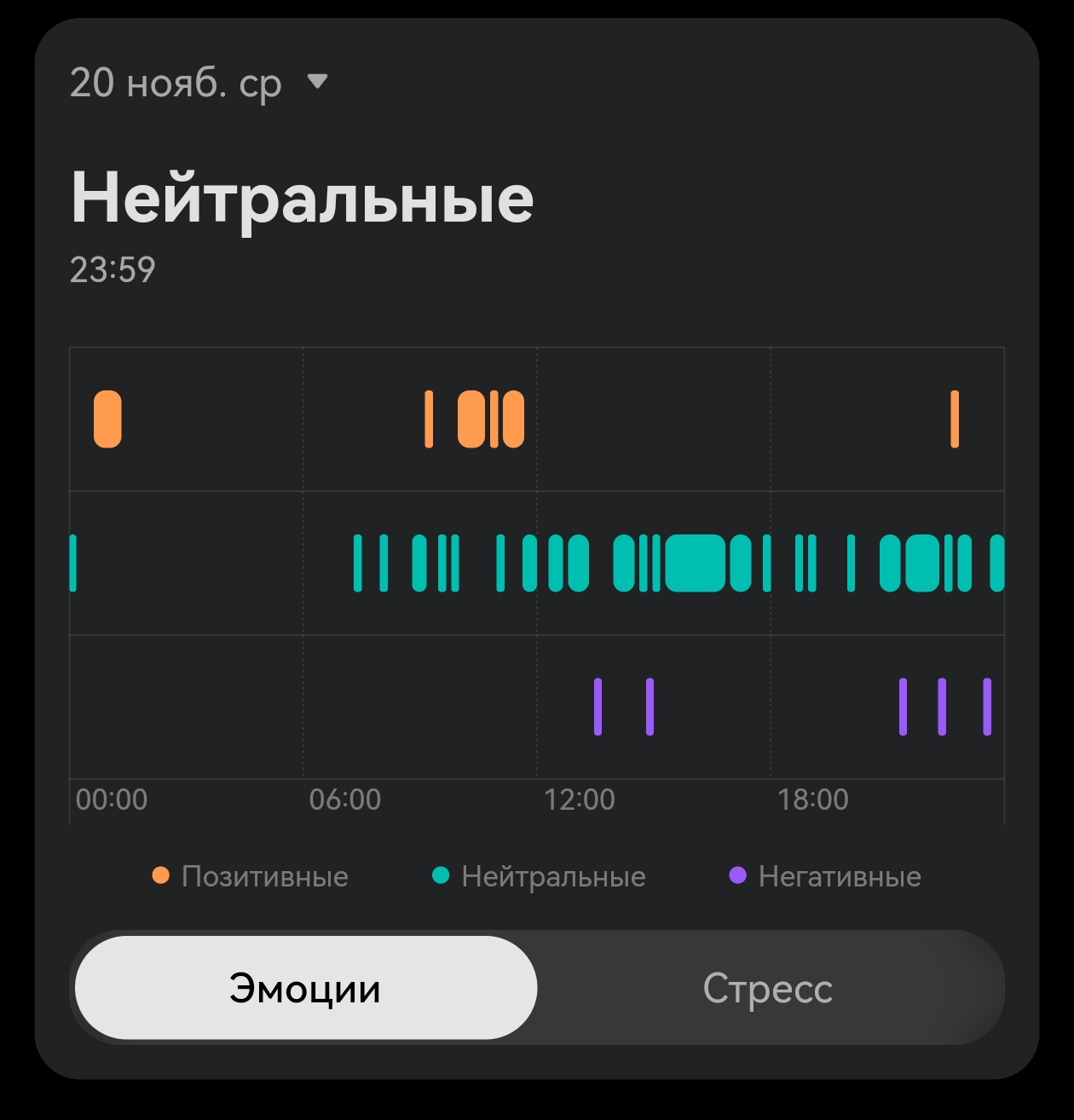 На следующих скриншотах показал описание метрики, доступное с часов. Надо зайти в приложение «Эмоции» на часах и включить подсчет. Результат будет представлен по итогам дня использования фитнес-часов.