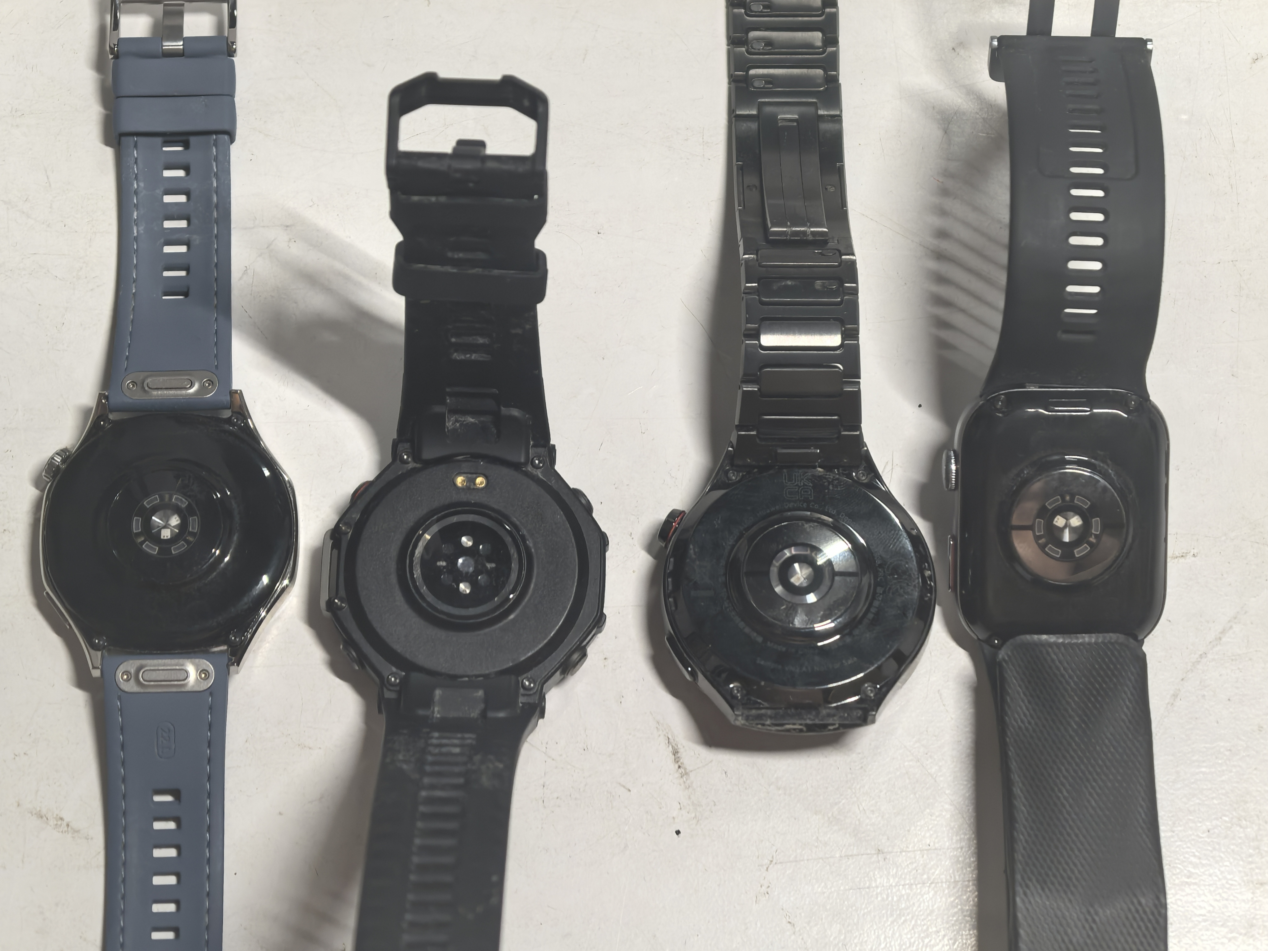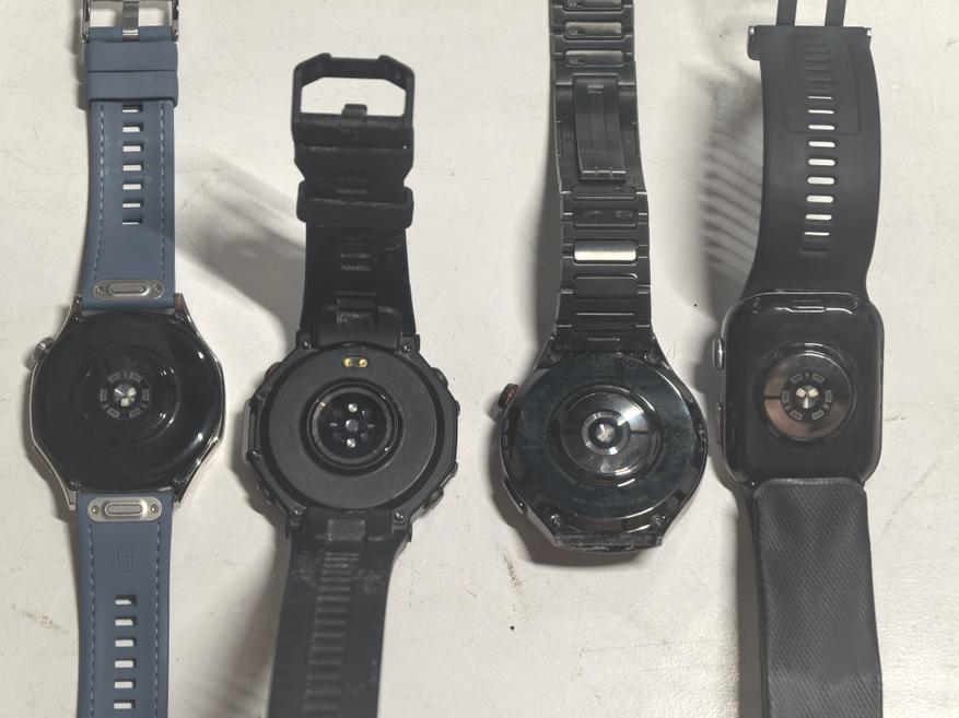 В умных часах бренды каждый год и от модели к модели улучшают алгоритмы оценки здоровья. Для разных устройств свойственен свой уникальный рисунок датчиков и их количество. На следующей фотографии сравнил оборотные стороны обозреваемых с Amazfit T-Rex 3, HUAWEI Watch 4 Pro SE и HUAWEI Watch D2.