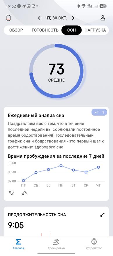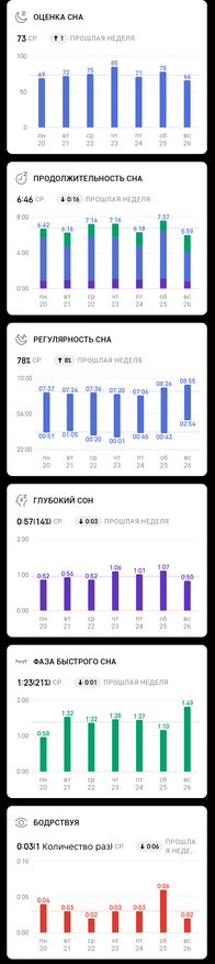 Оно позволяет детально вести дневник о состоянии организма, разбавляя тегами сна и выбором настроения после пробуждения. Часы в паре с приложением любят напоминать о качестве сна, о необходимости отхода ко сну, о недостаточной активности в тот или иной период. Я не помню, умело ли приложение раньше строить еженедельные отчеты, но сейчас эта функция стала доступной прямо с главного экрана. Дополнительно можно строить ежемесячные отчеты для большей наглядности и отслеживания динамики.