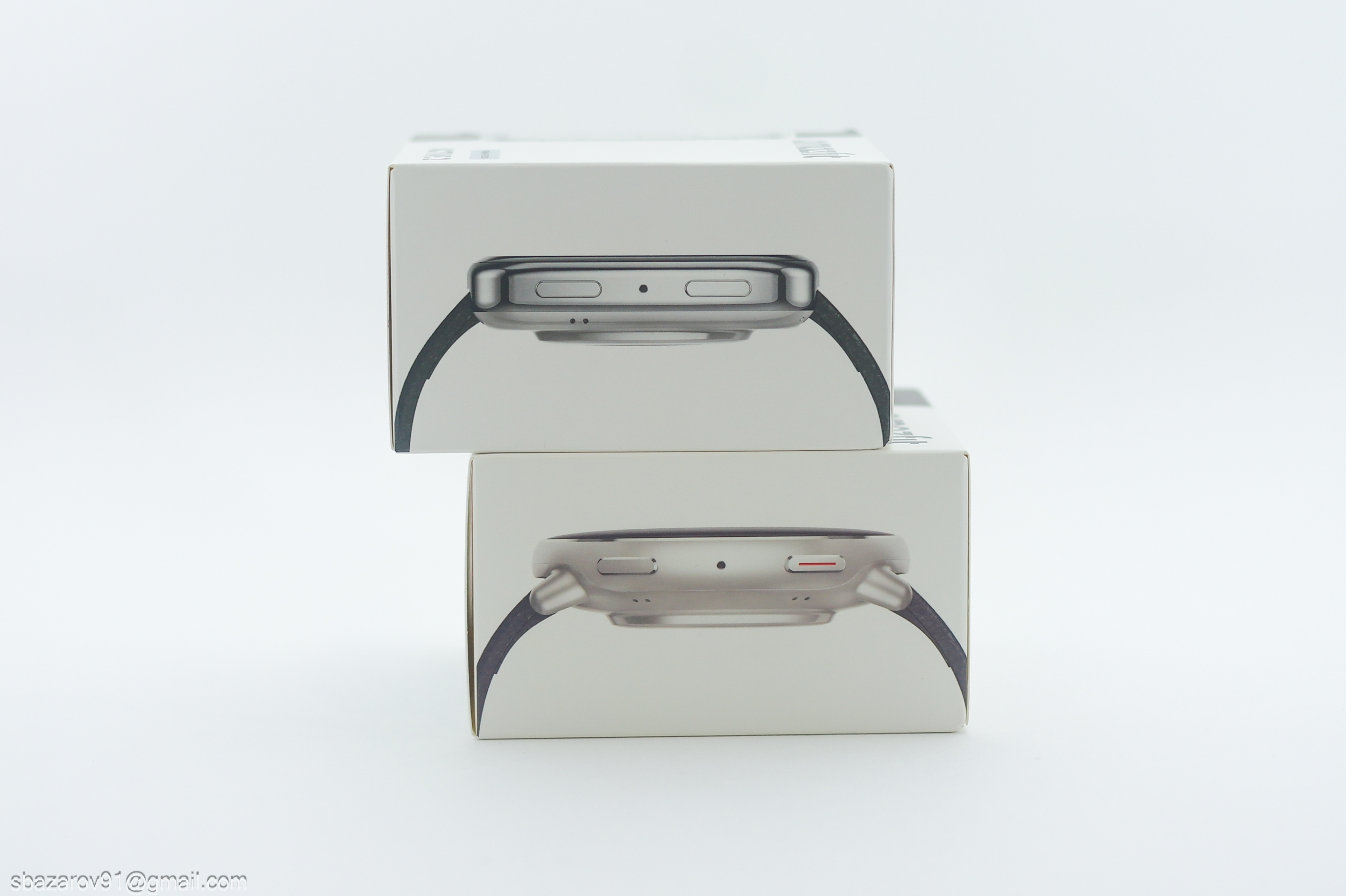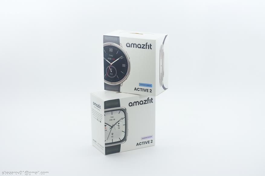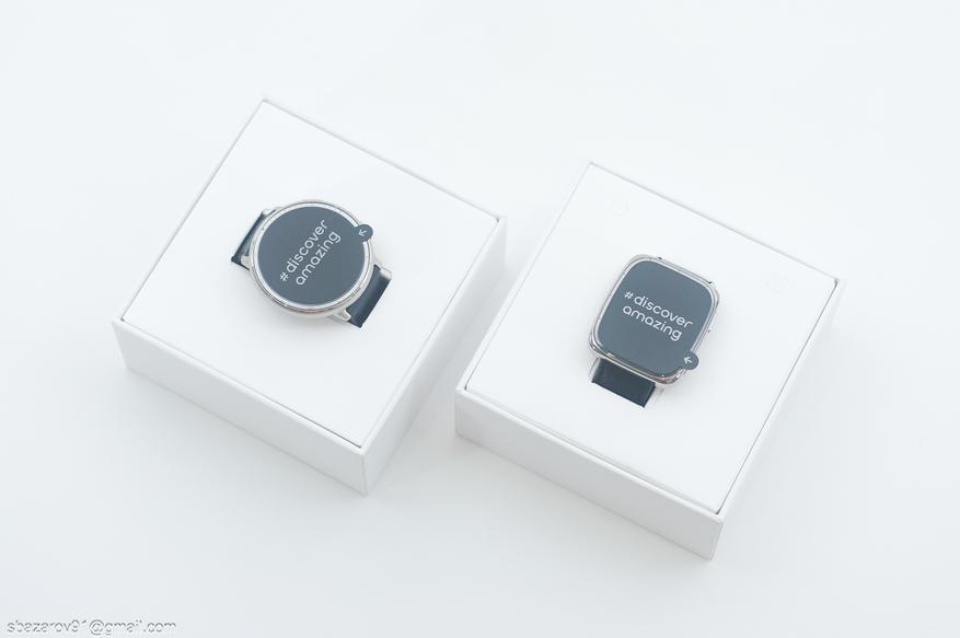 Коммерческие упаковки обоих часов представляют собой белый прямоугольник с изображением часов и их боковых граней. Несмотря на причастность к единой линейки Active 2, часы сильно отличаются: у круглых корпус цвета красного золота, а у квадратных — хром.
