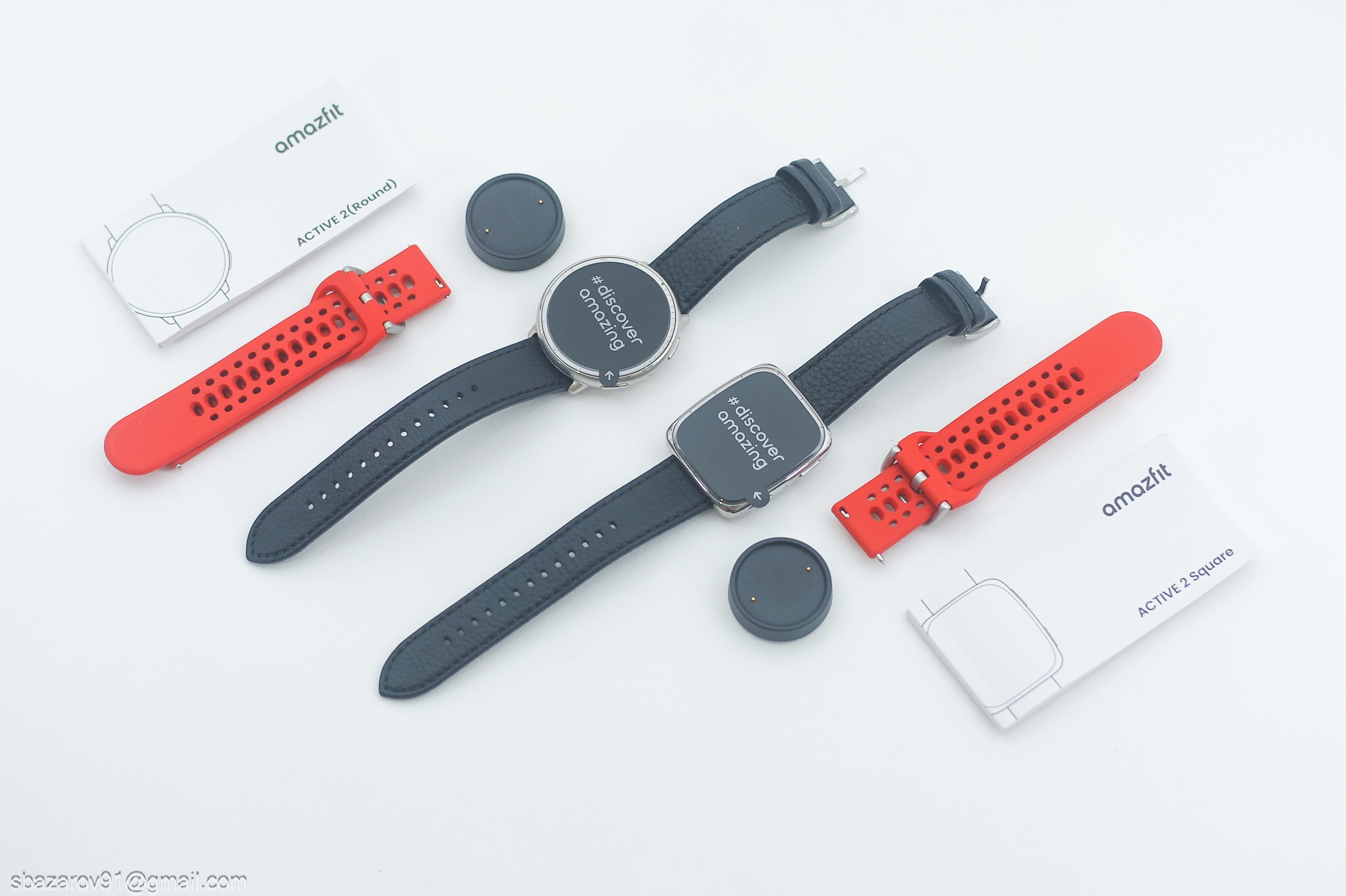 Открываются коробки как обычно, под крышкой пьедестал с часами, а все необходимые аксессуары и сменные ремешки прячутся вглубь. Amazfit Active 2 могут быть использованы в двух стилях: спортивном (с красным резиновым) и деловом (кожаный черный). Для зарядки теперь применяется кредл со встроенным Type-C разъемом, кабель для зарядки и блок питания в комплект не входят.