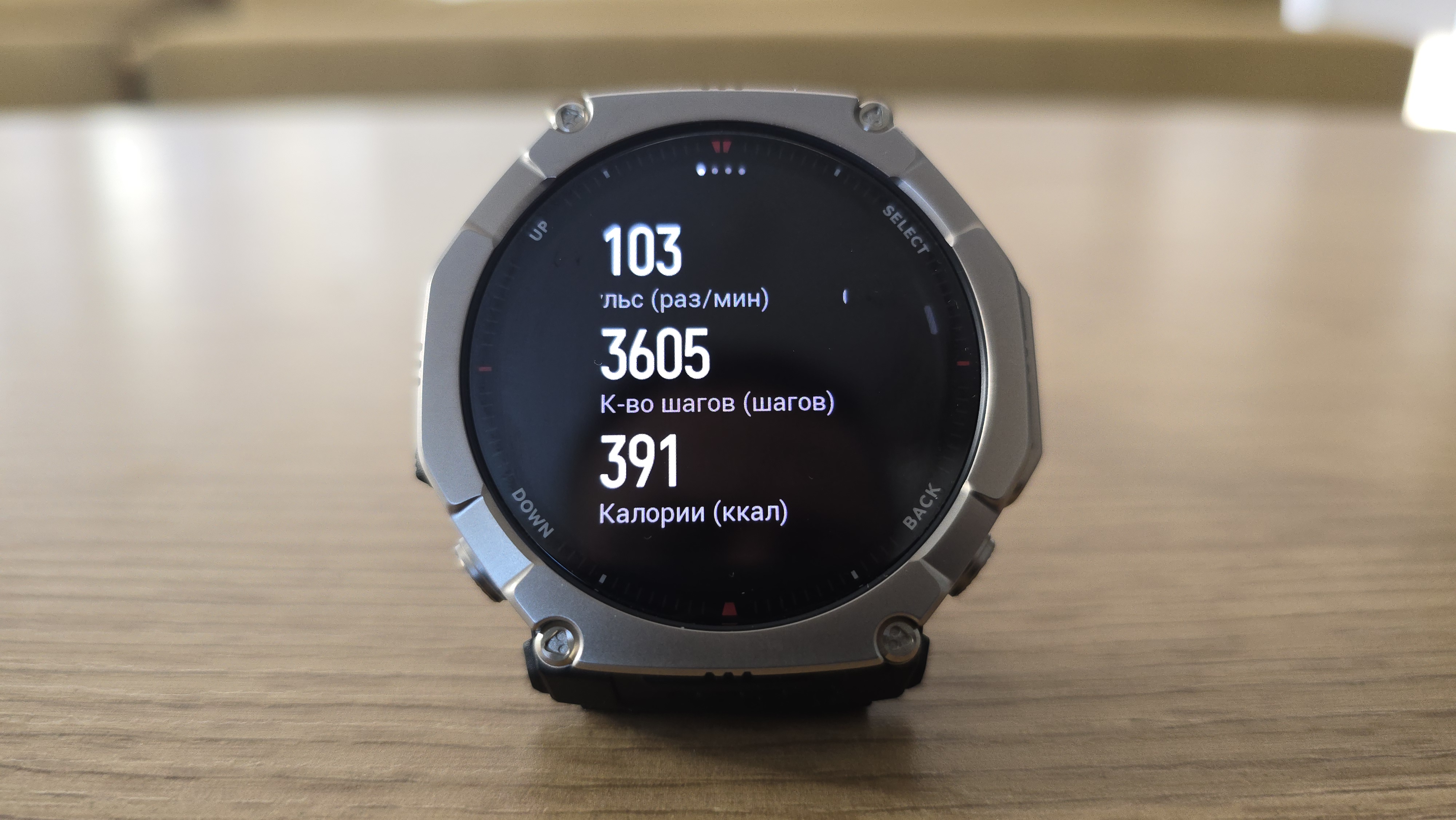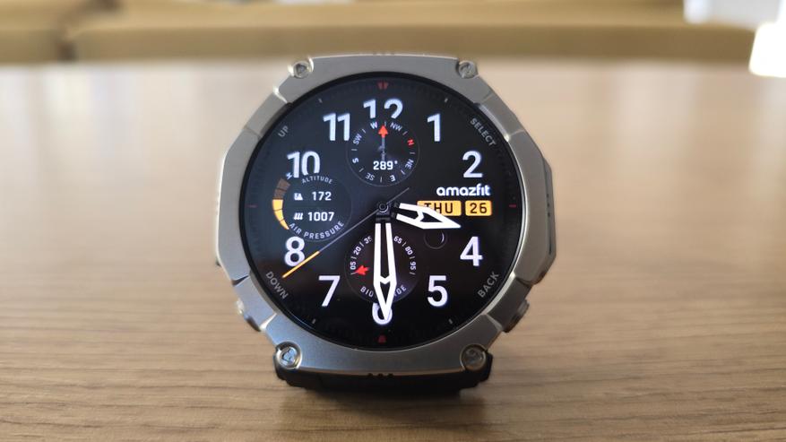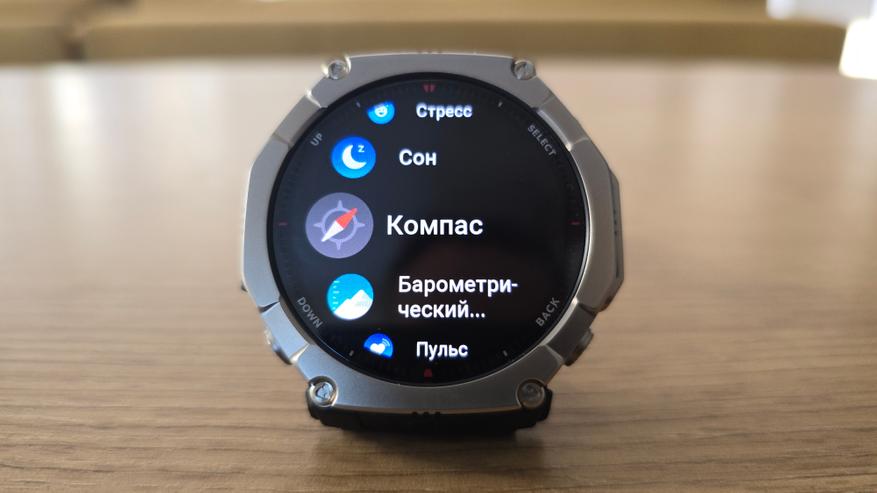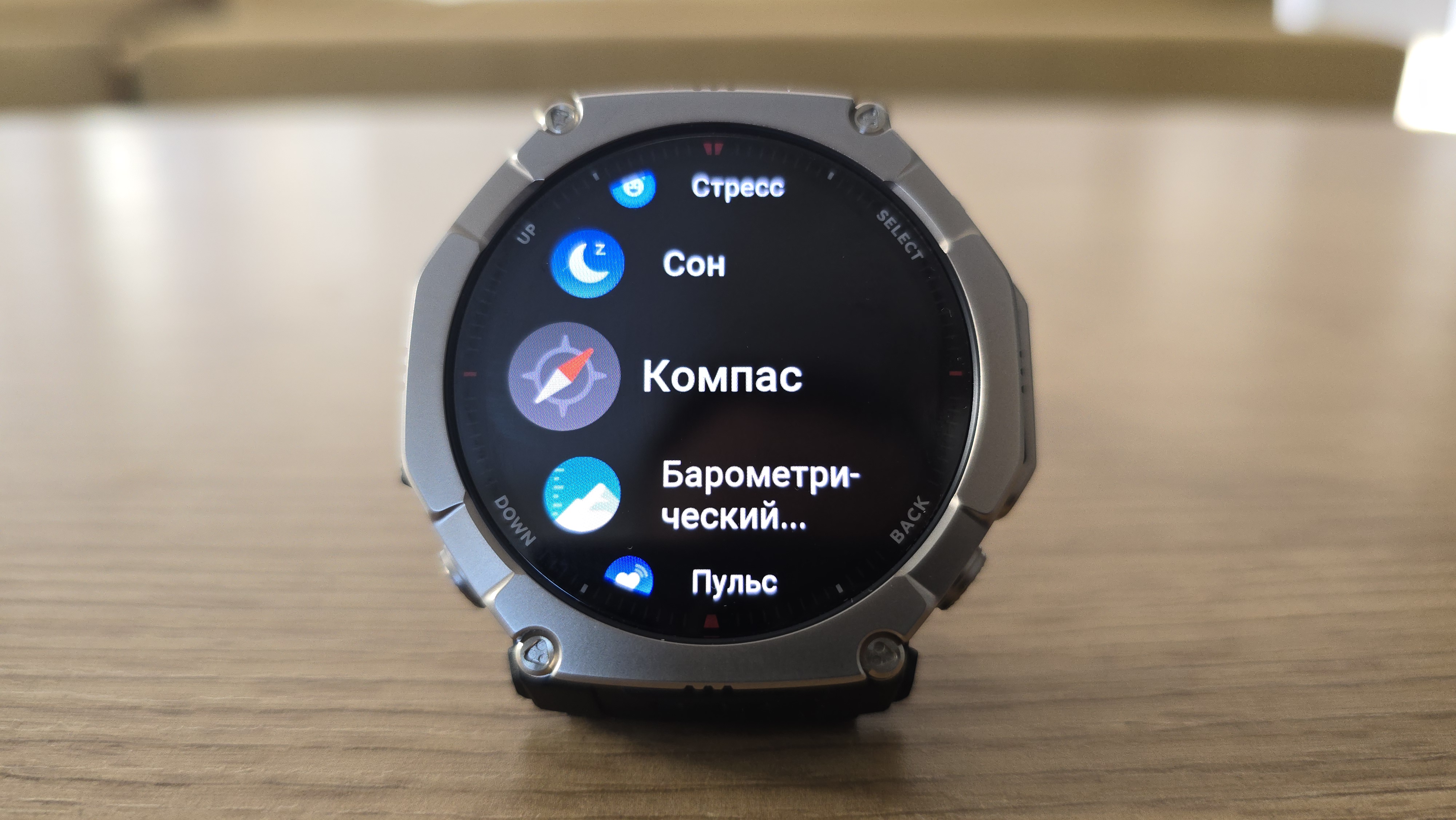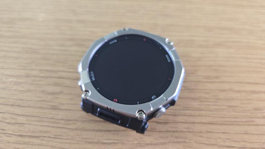Корпус Amazfit T-Rex Ultra 2 крупный, диаметр 51 мм. Конструкция многослойная: центральная часть выполнена из полимера, усиленного волокном, а безель, кнопки и задняя панель — из титана Grade 5. Металл матовый, с четкими гранями и выраженной геометрией. Безель восьмигранный, закреплен четырьмя винтами. Винты открытые, они не скрываются и являются частью дизайна. Экран круглый, 1.5 дюйма, закрыт сапфировым стеклом. Стекло немного утоплено относительно края безеля, поэтому металлическая рамка выступает выше уровня дисплея и дополнительно его прикрывает. По внутреннему кольцу нанесены подписи UP, SELECT, DOWN и BACK — ориентиры для физических кнопок.