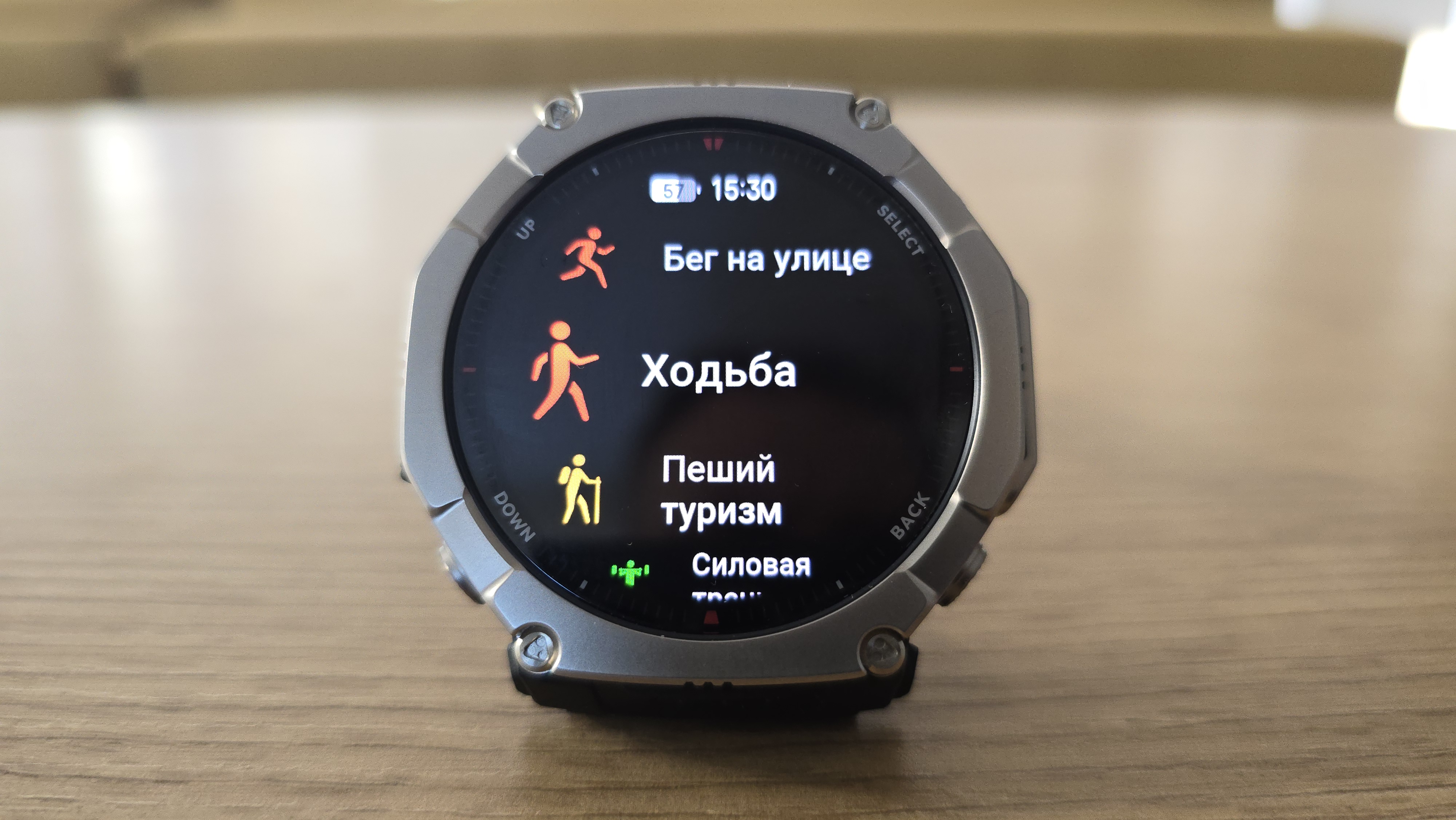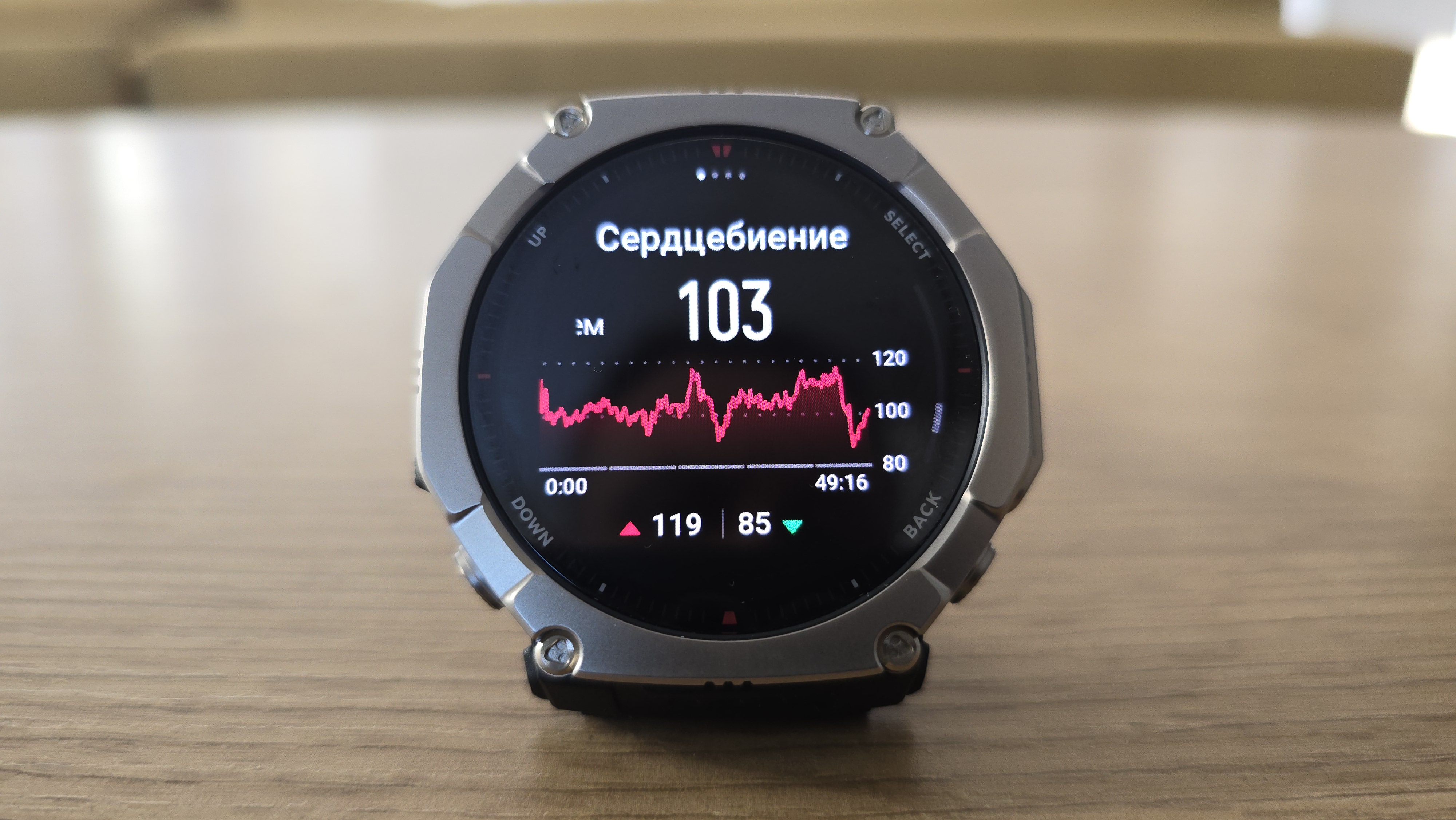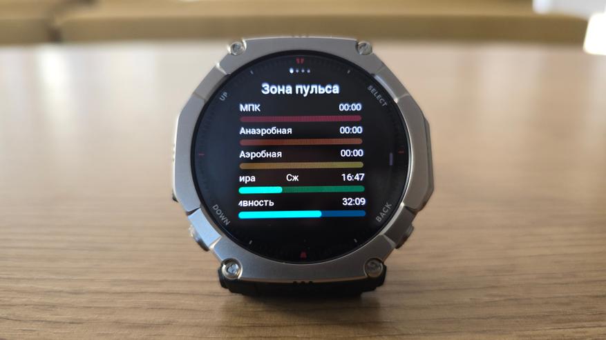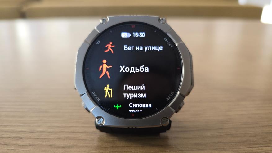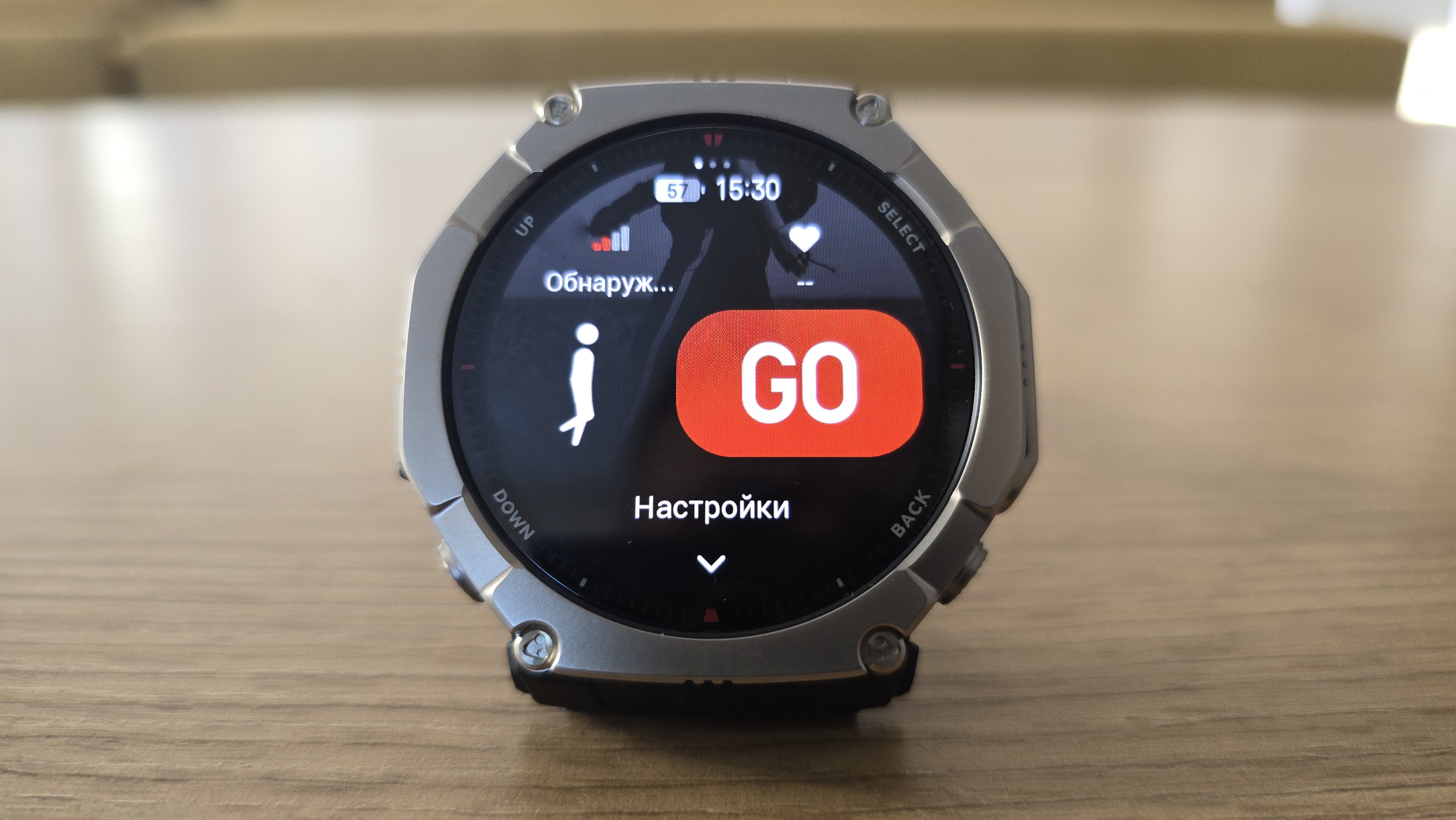 Корпус Amazfit T-Rex Ultra 2 крупный, диаметр 51 мм. Конструкция многослойная: центральная часть выполнена из полимера, усиленного волокном, а безель, кнопки и задняя панель — из титана Grade 5. Металл матовый, с четкими гранями и выраженной геометрией. Безель восьмигранный, закреплен четырьмя винтами. Винты открытые, они не скрываются и являются частью дизайна. Экран круглый, 1.5 дюйма, закрыт сапфировым стеклом. Стекло немного утоплено относительно края безеля, поэтому металлическая рамка выступает выше уровня дисплея и дополнительно его прикрывает. По внутреннему кольцу нанесены подписи UP, SELECT, DOWN и BACK — ориентиры для физических кнопок.