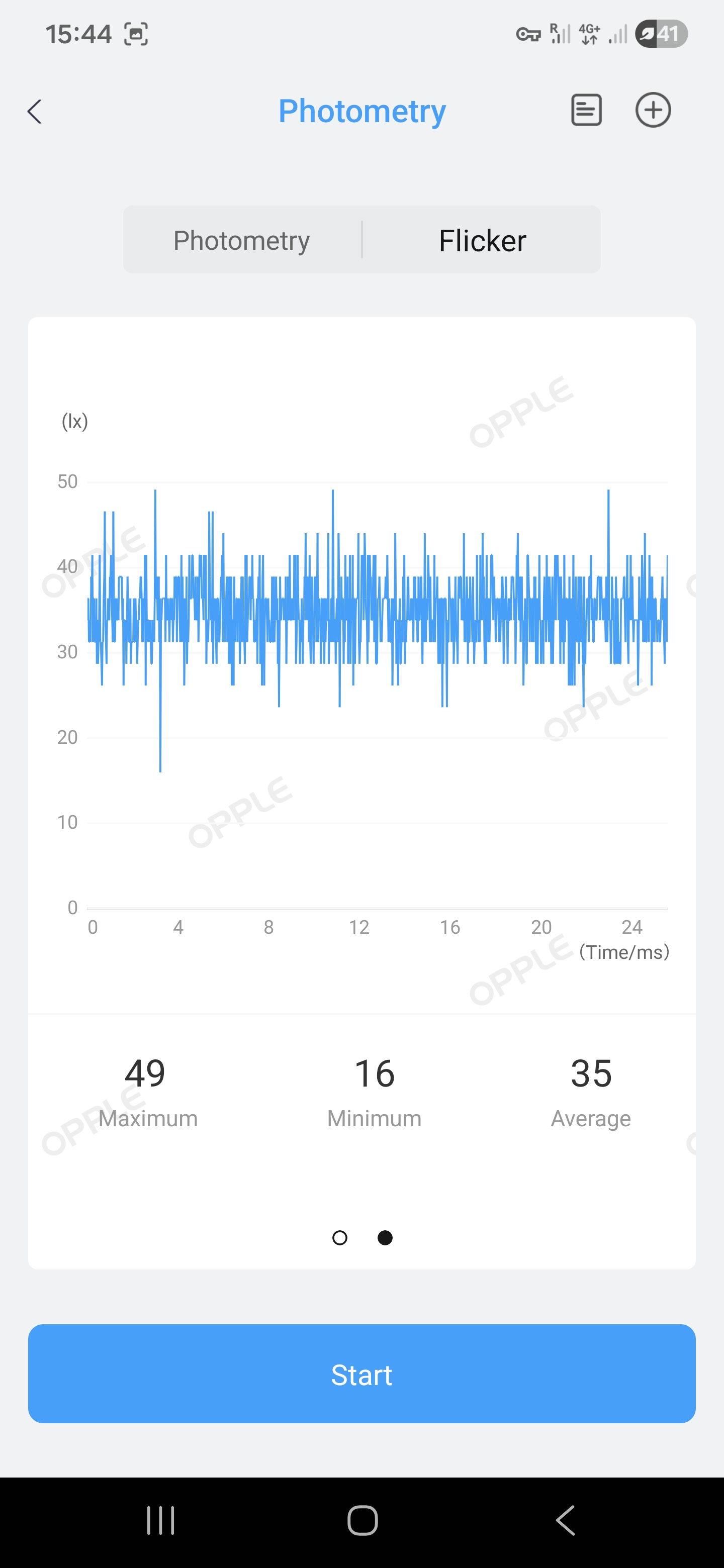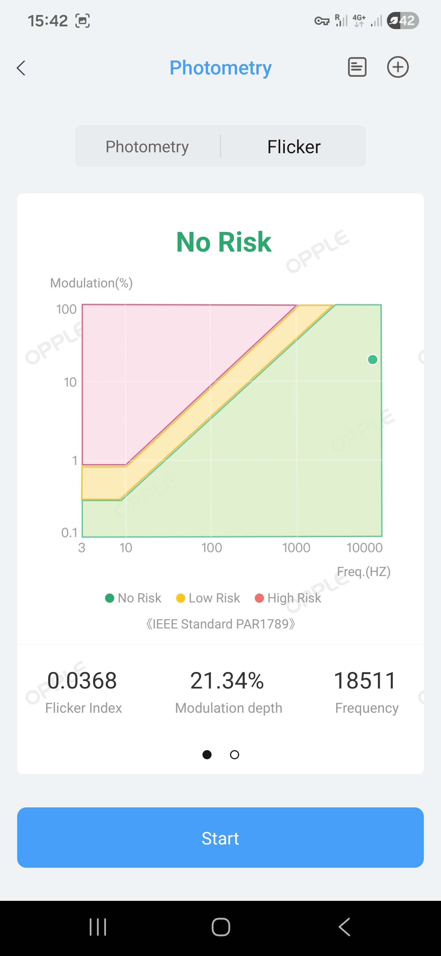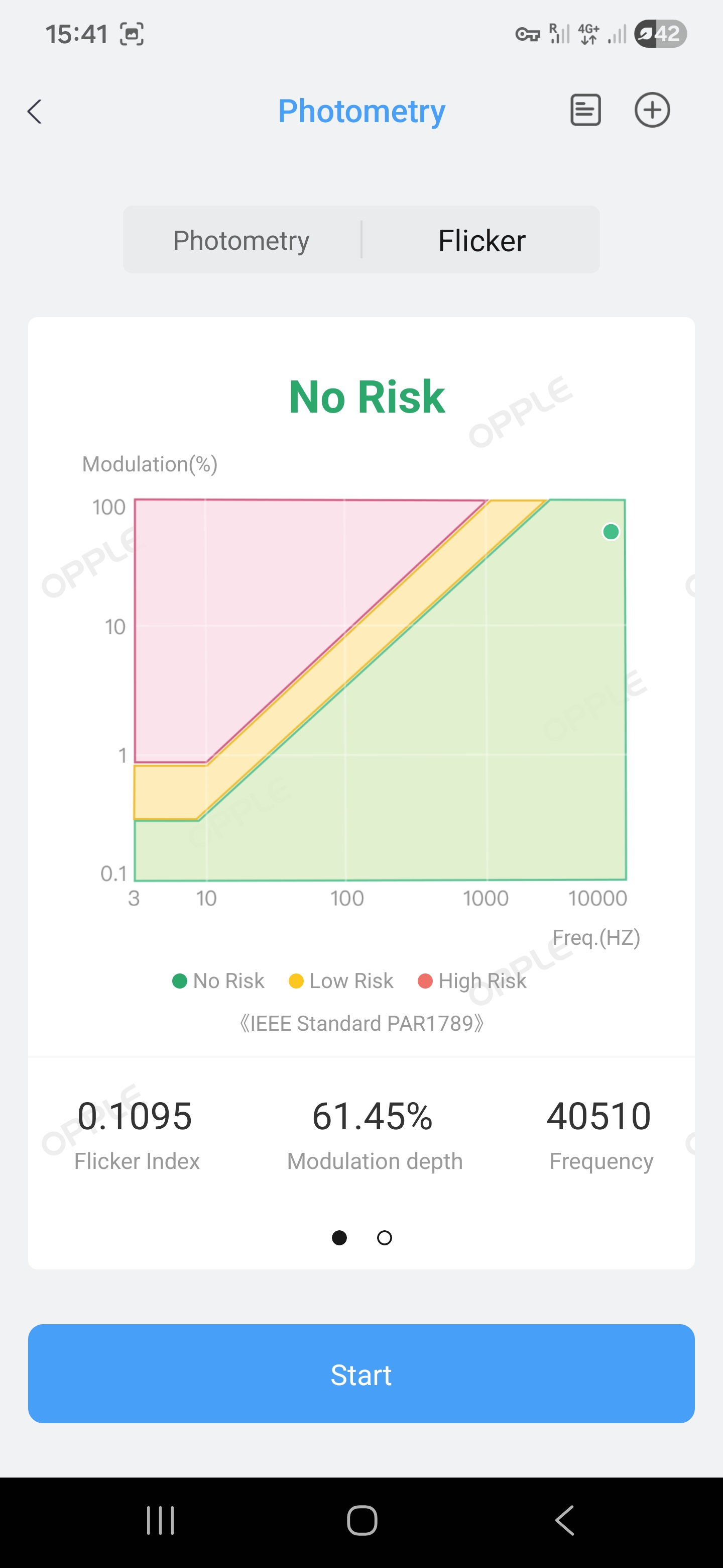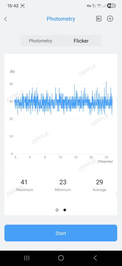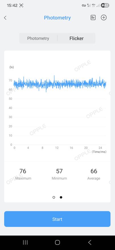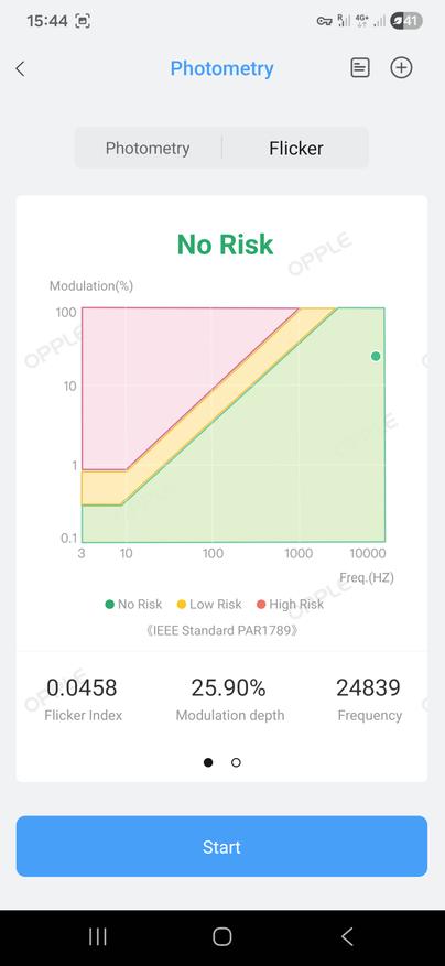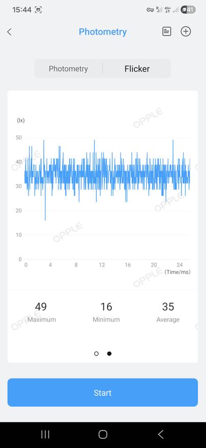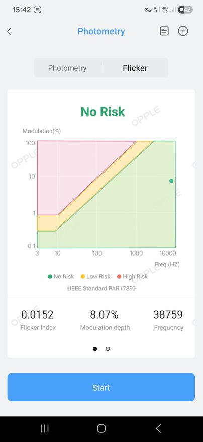 Зеленый режим выдает около 36 лк на 0.5 м, среднее 35 лк, максимум 49 лк. Приложение отображает 7760 К, но для цветного света эта цифра условная. Координаты сильно смещены от белой точки, что логично для зеленого спектра. Частота мерцания около 24,8 кГц, Flicker Index 0.0458, режим также в зоне No Risk. В темноте зеленый свет воспринимается мягче и не так «перебивает» адаптацию зрения, поэтому его удобно использовать вечером или ночью.