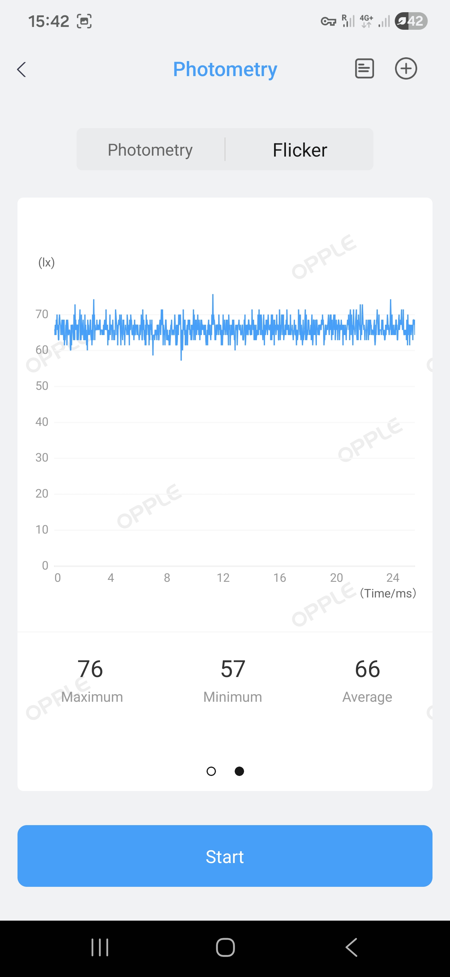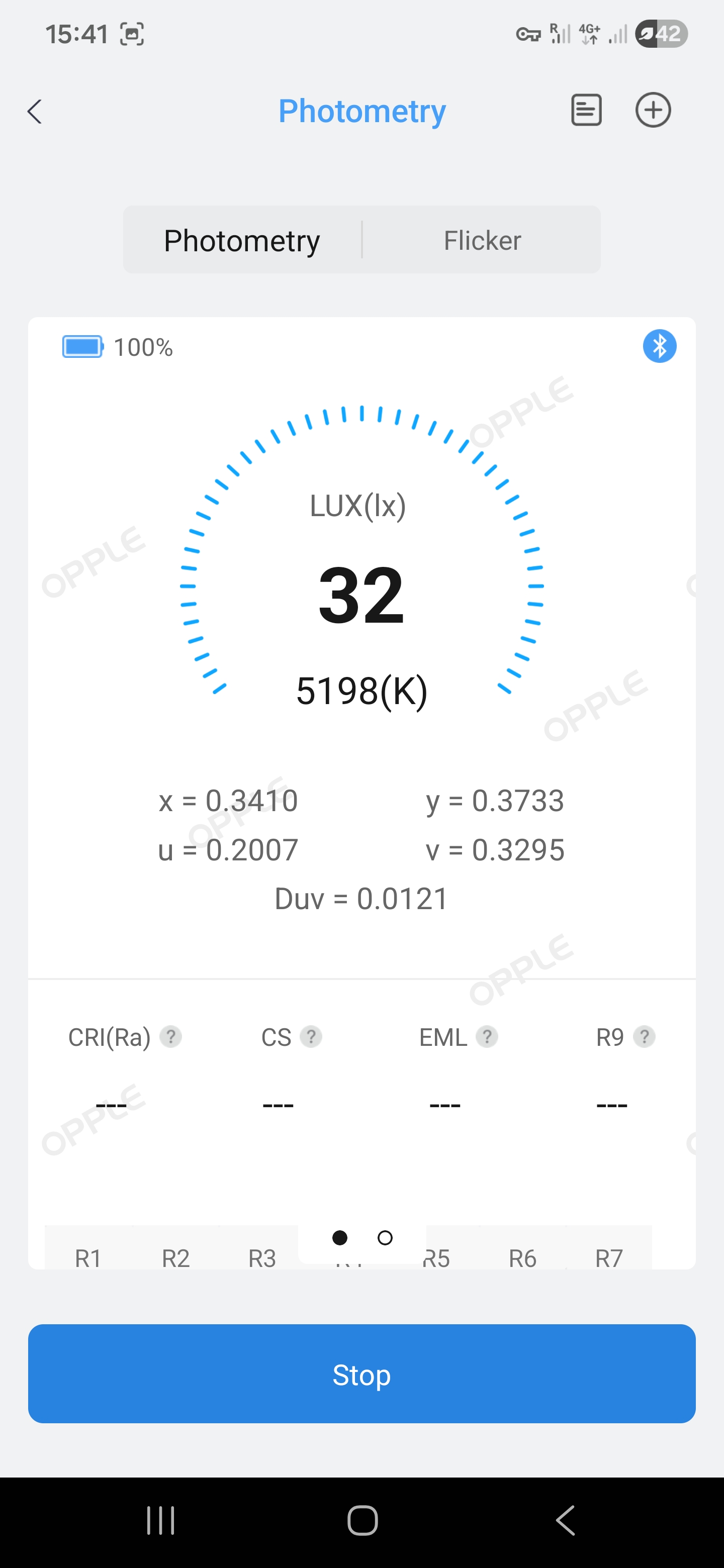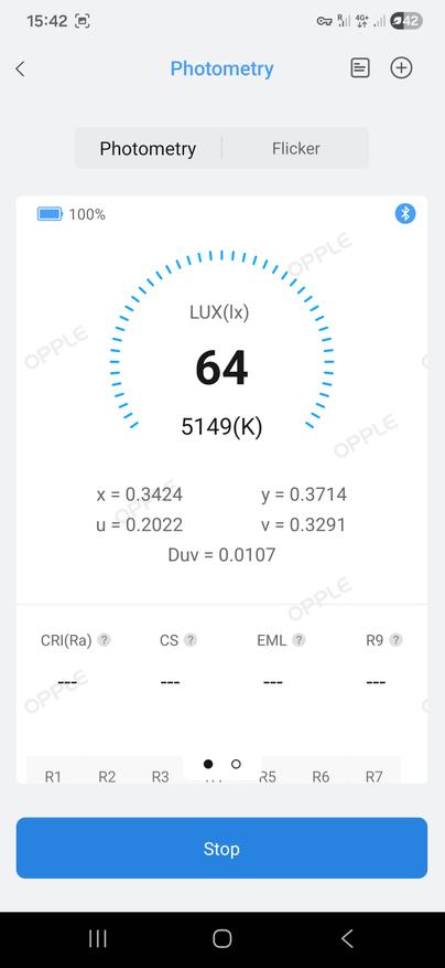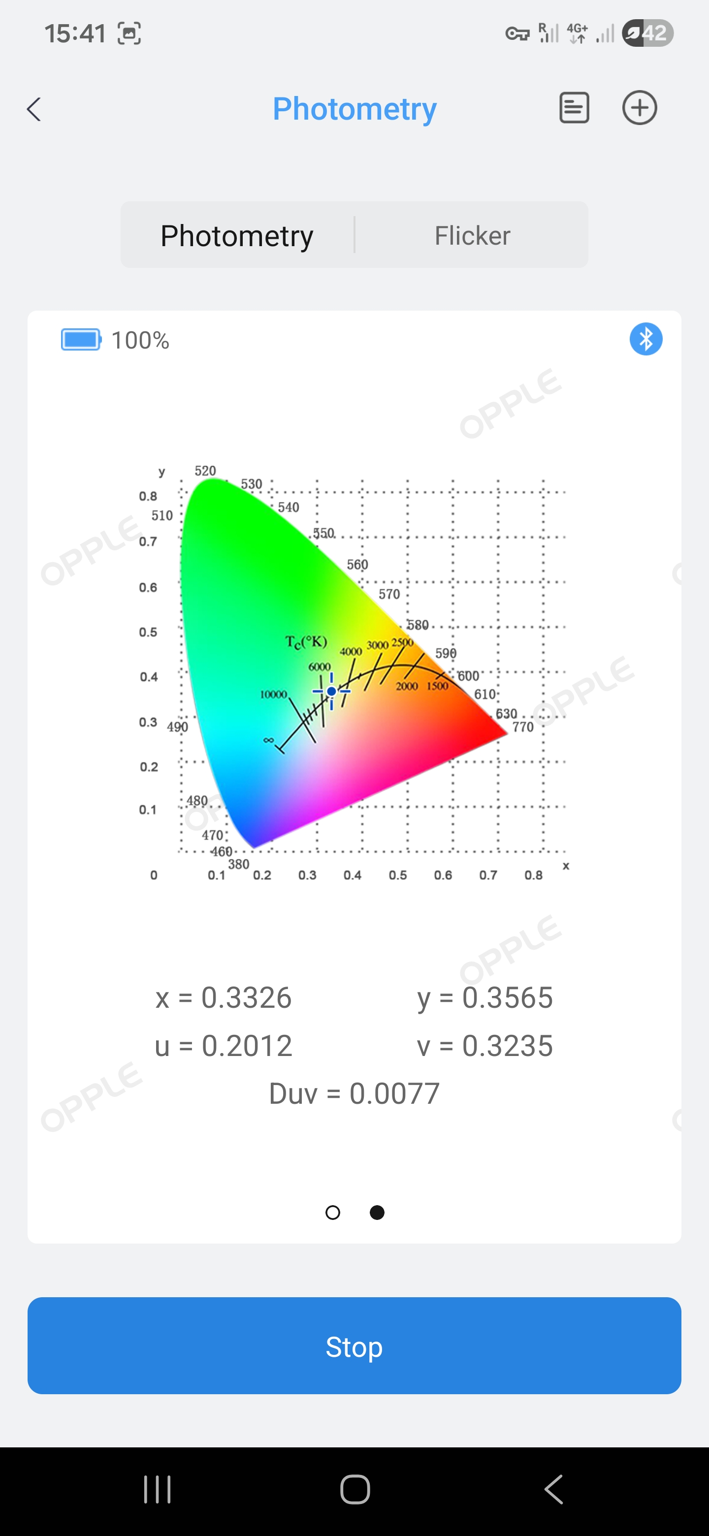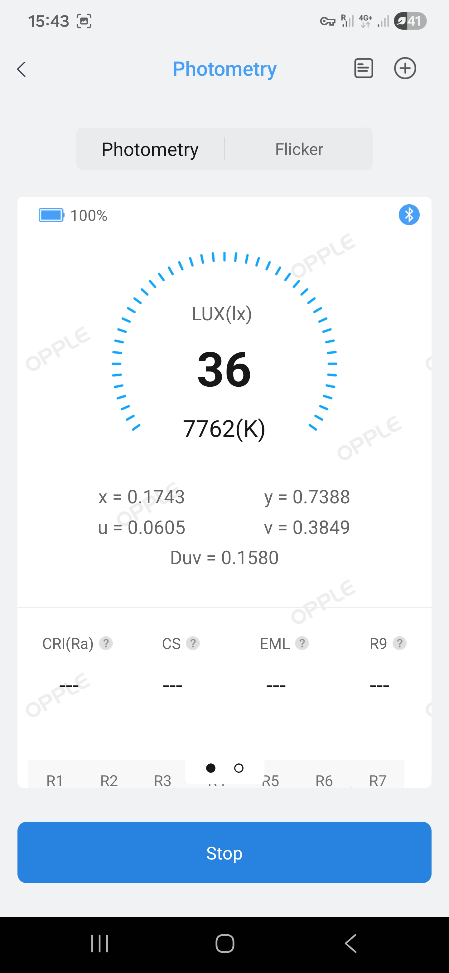 Зеленый режим выдает около 36 лк на 0.5 м, среднее 35 лк, максимум 49 лк. Приложение отображает 7760 К, но для цветного света эта цифра условная. Координаты сильно смещены от белой точки, что логично для зеленого спектра. Частота мерцания около 24,8 кГц, Flicker Index 0.0458, режим также в зоне No Risk. В темноте зеленый свет воспринимается мягче и не так «перебивает» адаптацию зрения, поэтому его удобно использовать вечером или ночью.