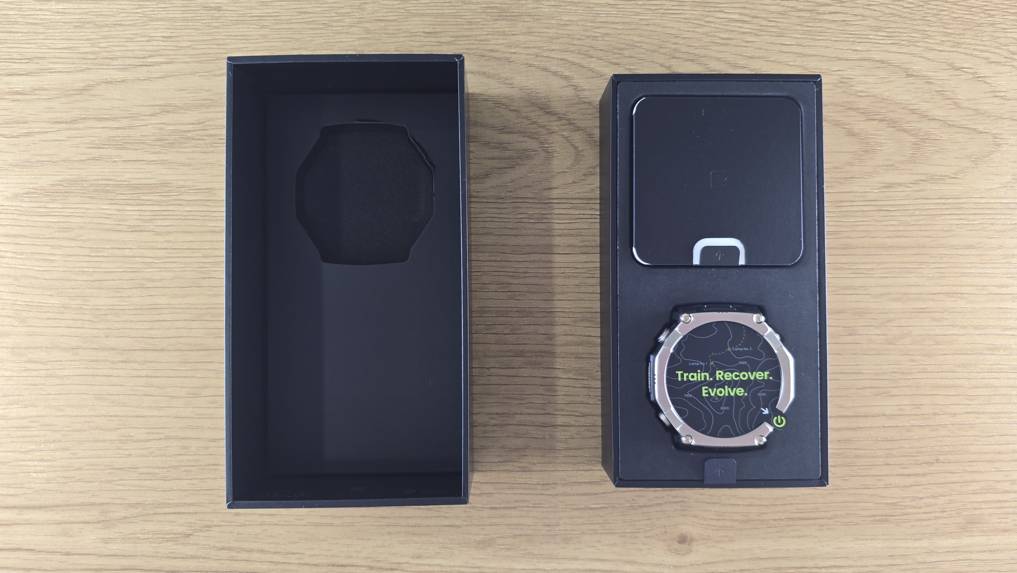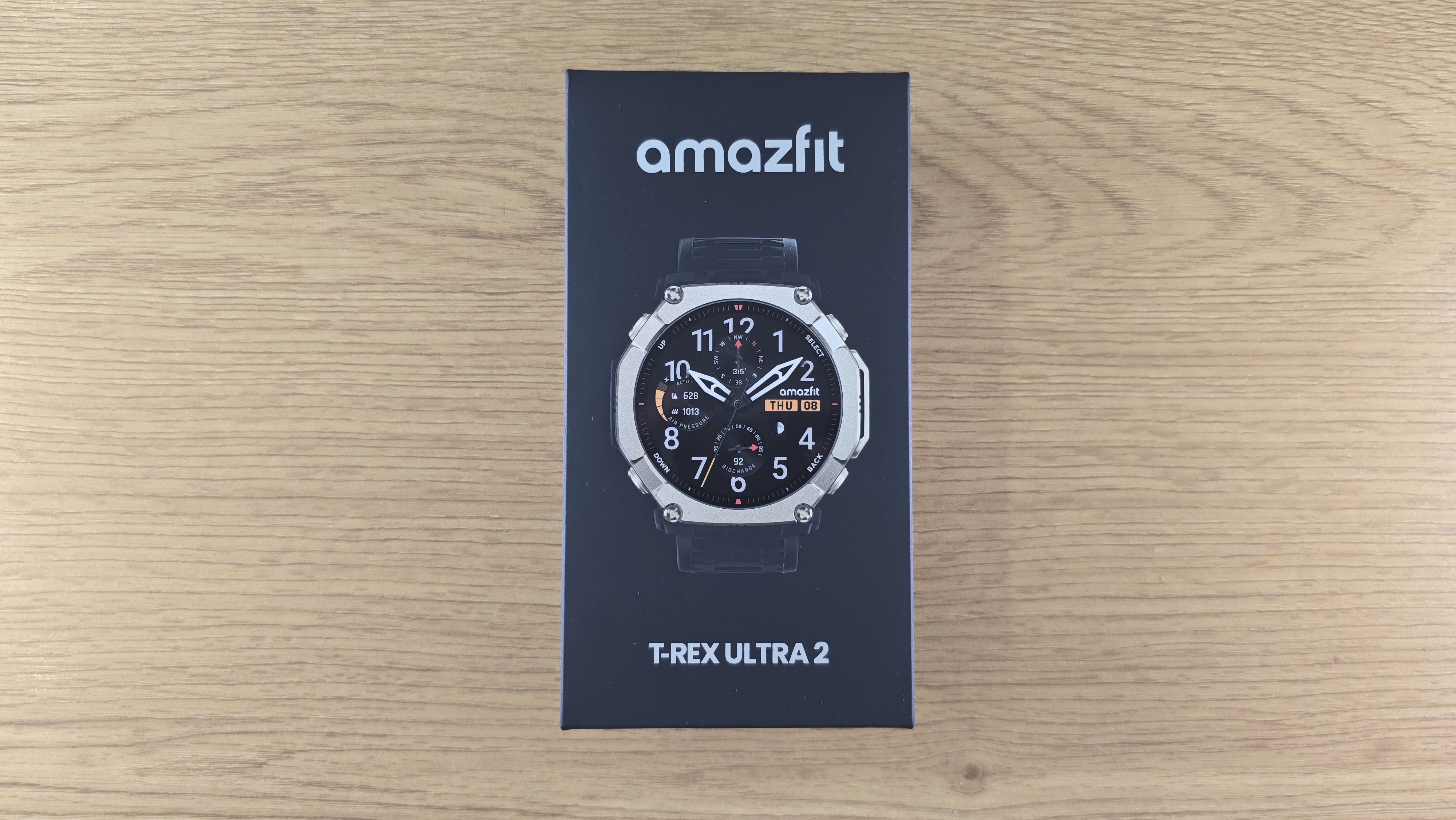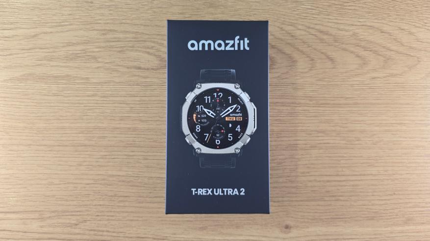Упаковка выполнена в строгом черном оформлении. Коробка прямоугольная, с матовой черной поверхностью. На лицевой стороне размещено изображение часов и логотип amazfit в верхней части. В нижней части указано название модели T-Rex Ultra 2. Верхняя часть — суперобложка, сняв которую получаем доступ к основной коробке черного цвета.