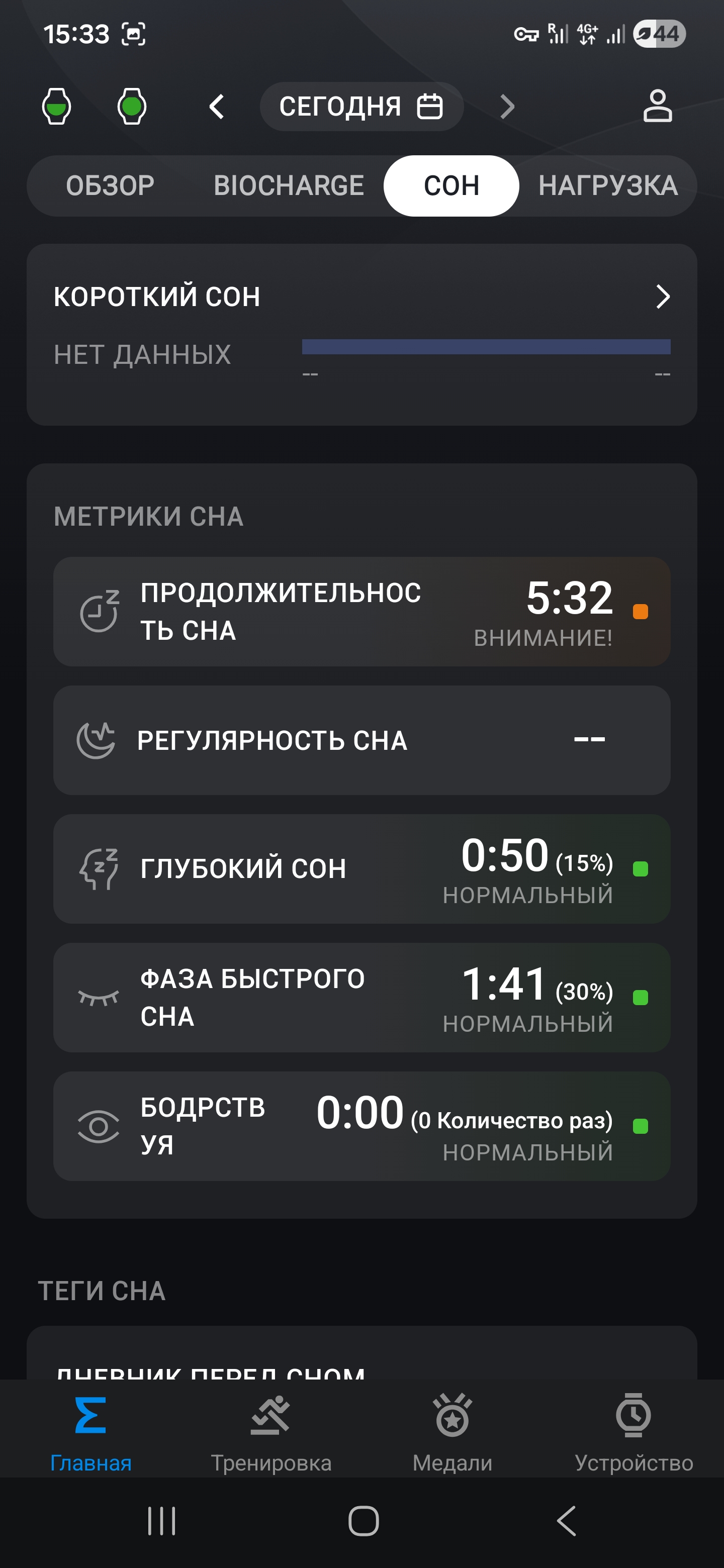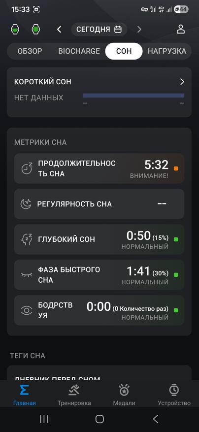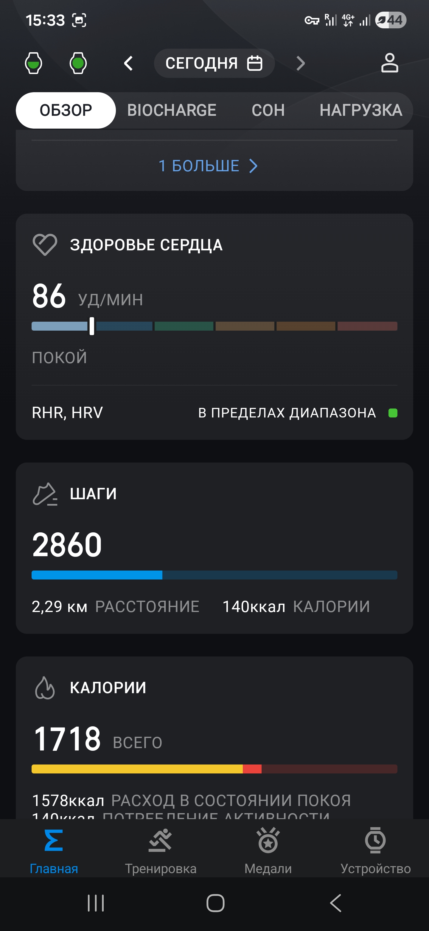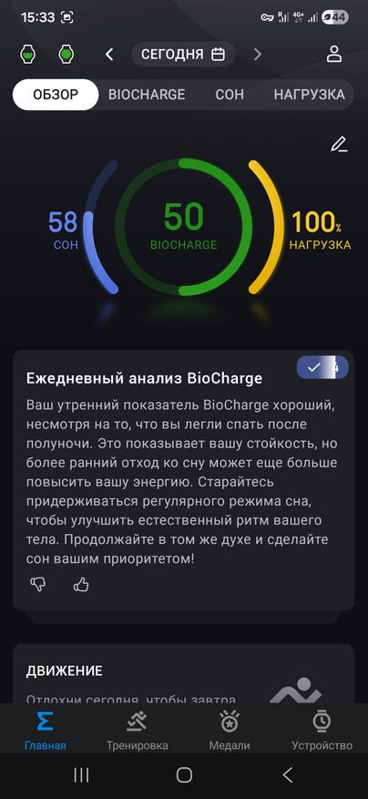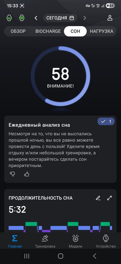 Блок здоровья включает круглосуточный мониторинг пульса, уровня кислорода в крови, уровня стресса и температуры кожи. Поддерживается оценка качества сна с учетом фаз, вариабельности сердечного ритма и показателя дыхания во сне. Есть система PAI, дыхательные упражнения и напоминания о превышении установленных порогов по пульсу и уровню кислорода.