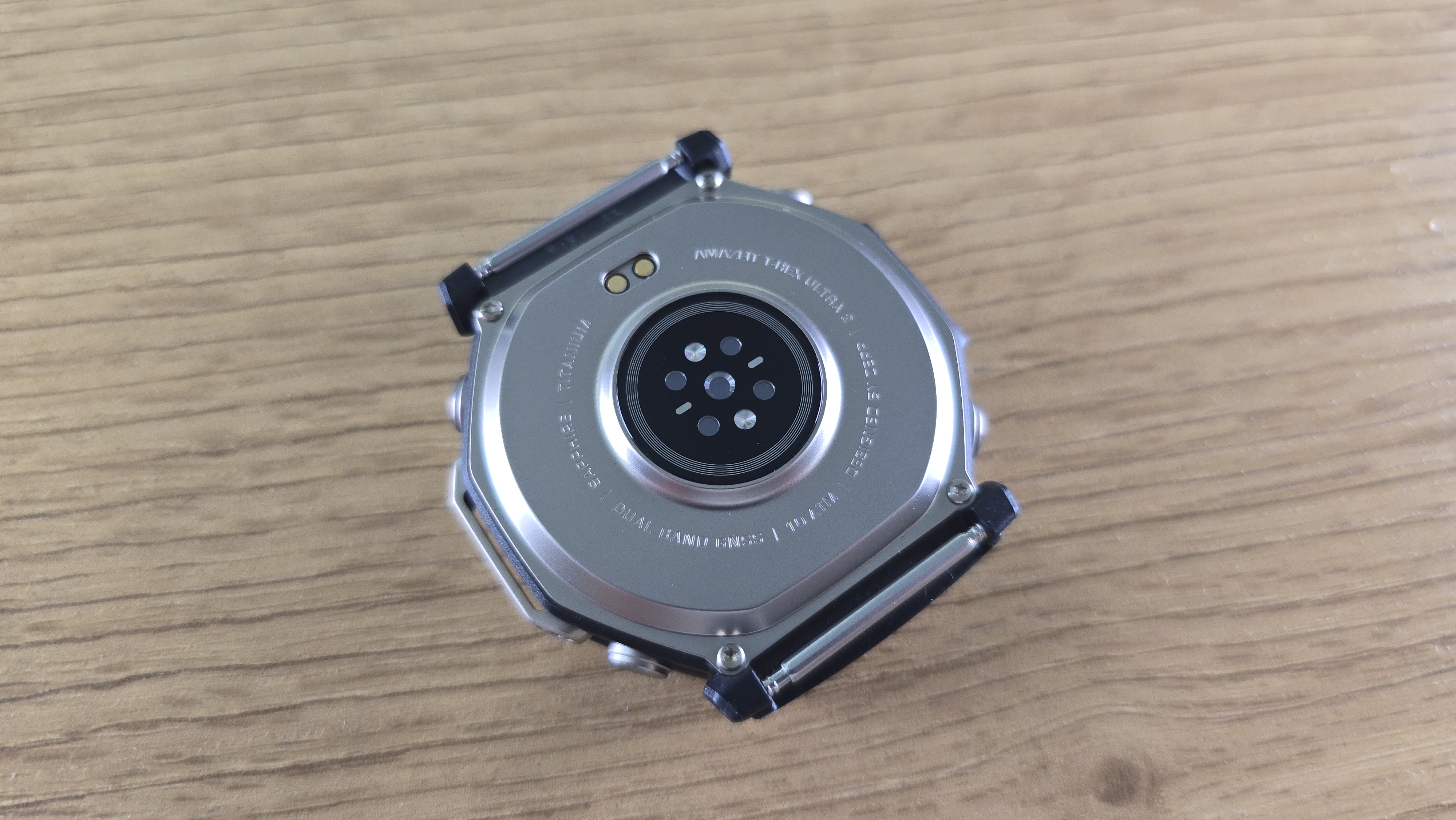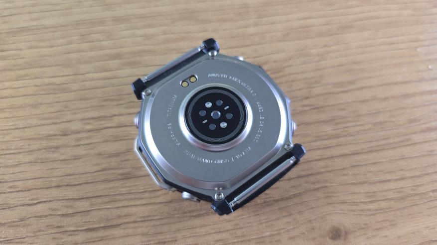 Задняя панель металлическая. В центре находится круглый блок датчиков BioTracker 6.0 PPG. Вокруг него — гравировка с названием модели и указанием dual band. Рядом расположены два контакта для зарядки.