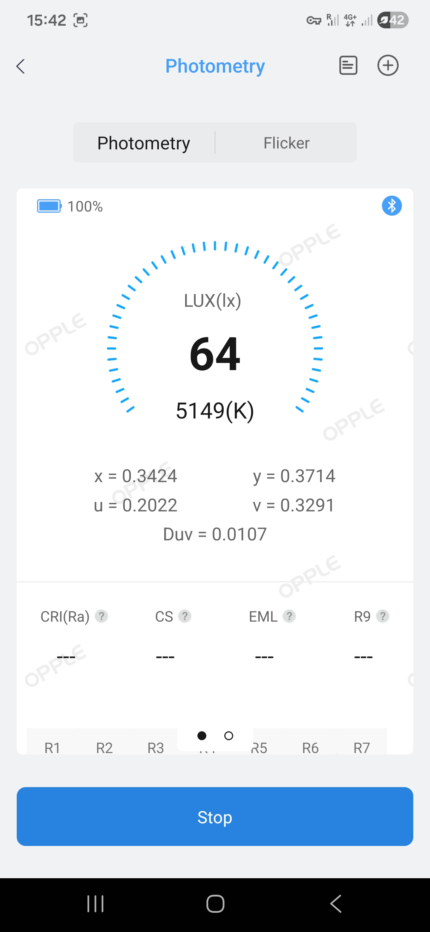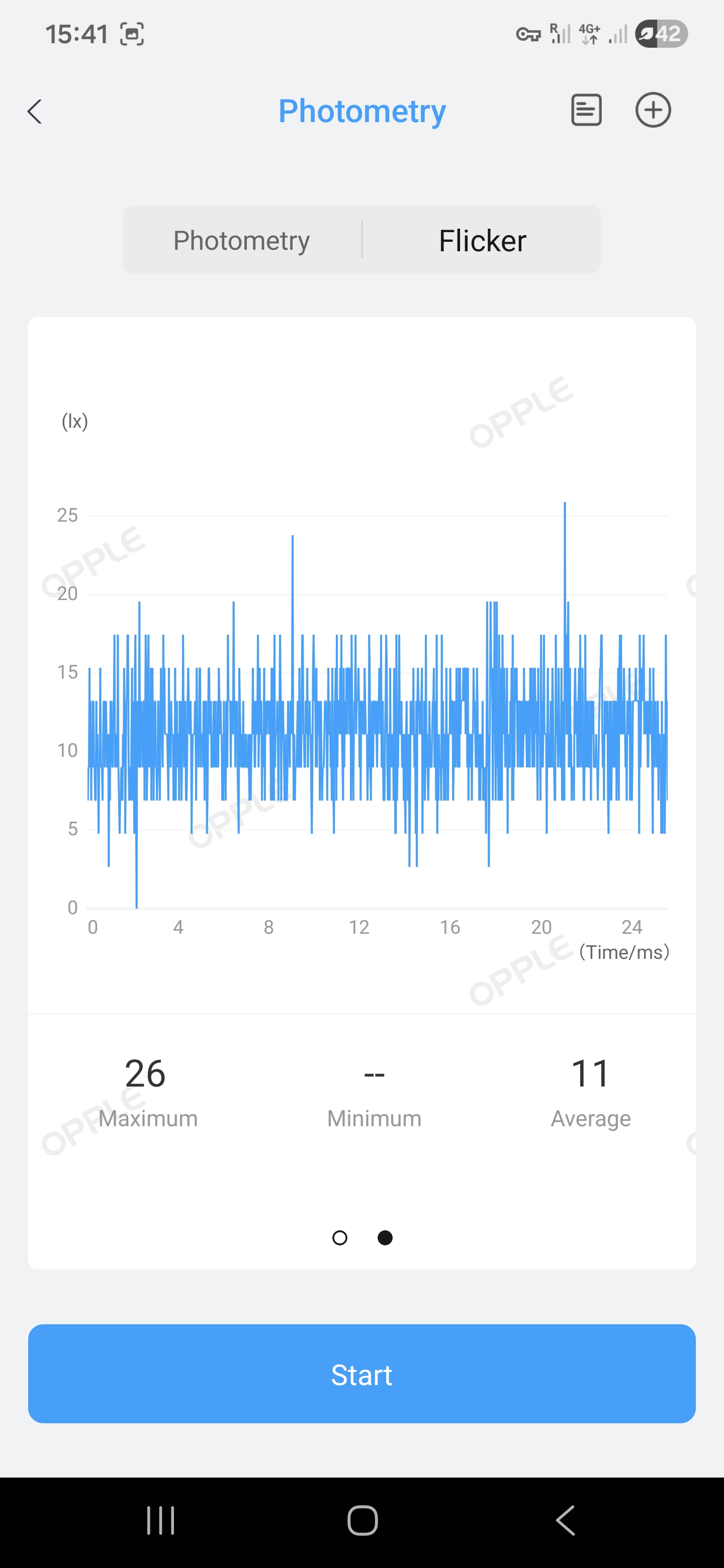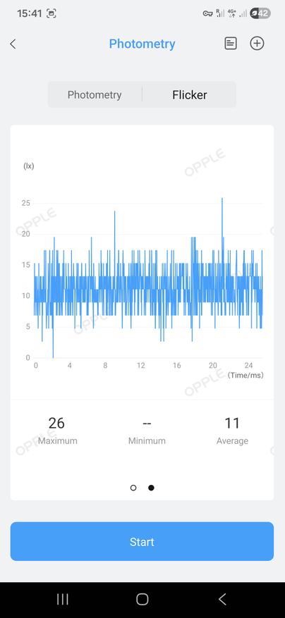 Максимальный белый режим показал 94-96 лк на полуметре, среднее около 96 лк, максимум доходил до 104 лк. Почти сотня люкс для такого формата — это уже уверенный ближний свет. Температура около 5000-5075 К. По пульсации частота порядка 32 кГц, глубина модуляции около 6%, Flicker Index около 0.01. Свет воспринимается как стабильный, без рывков.