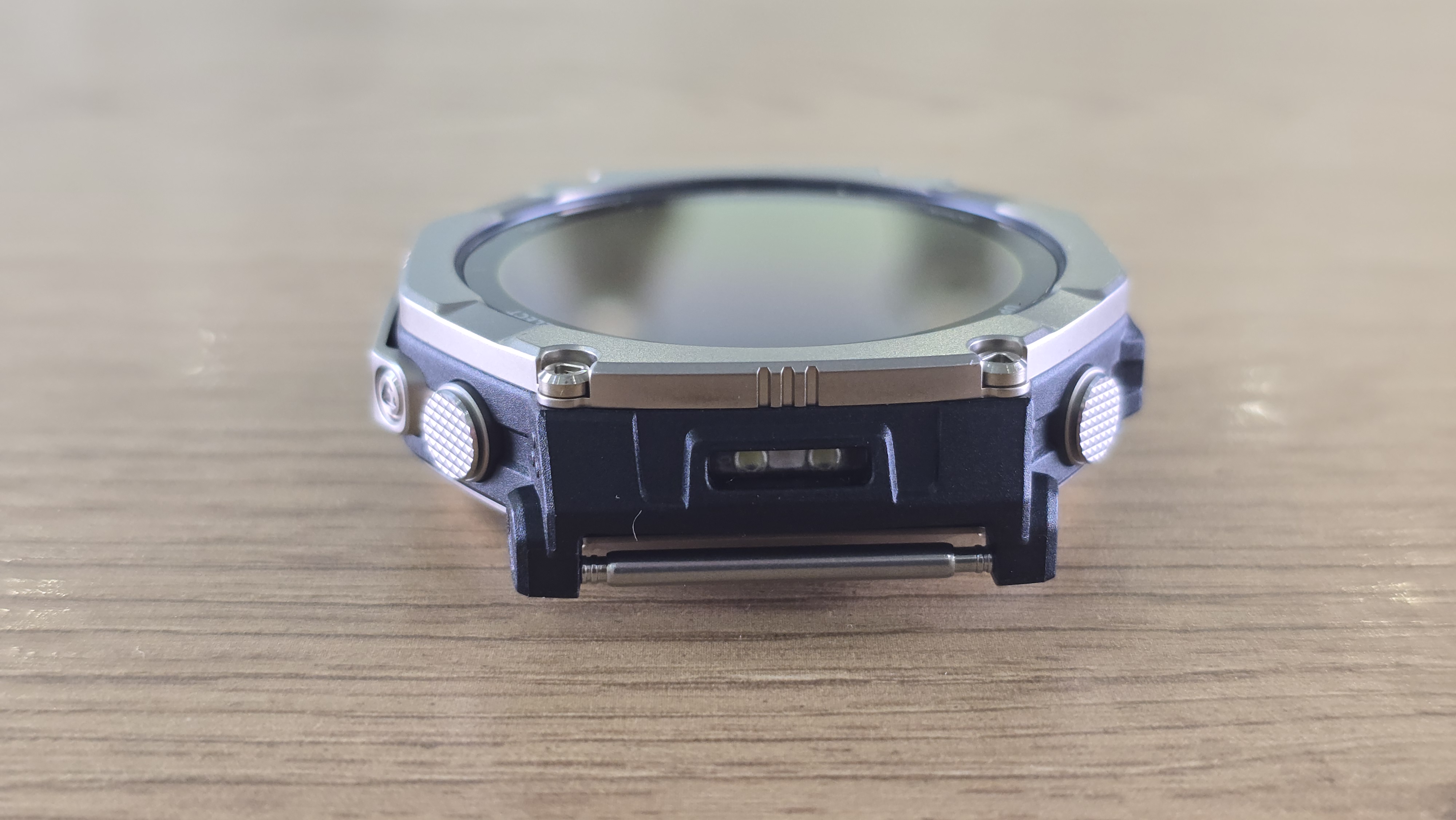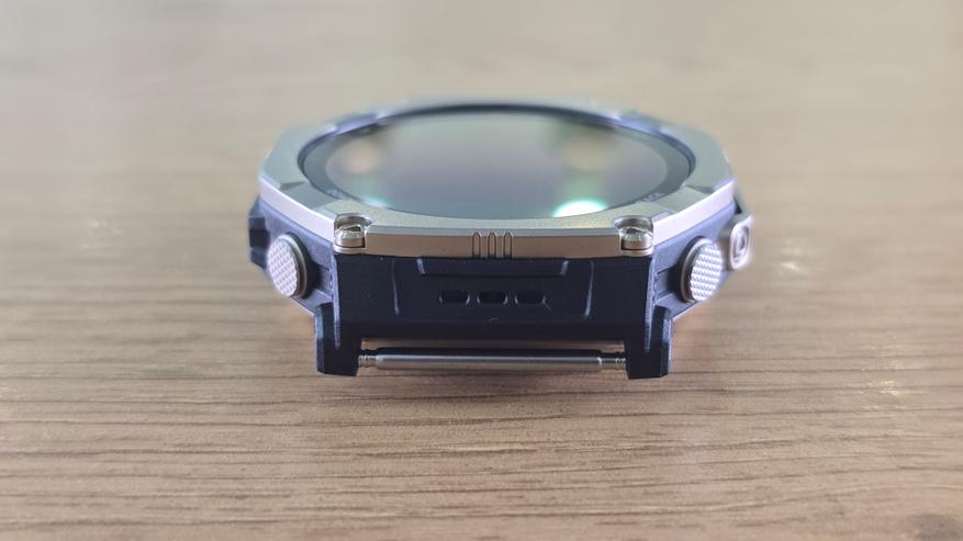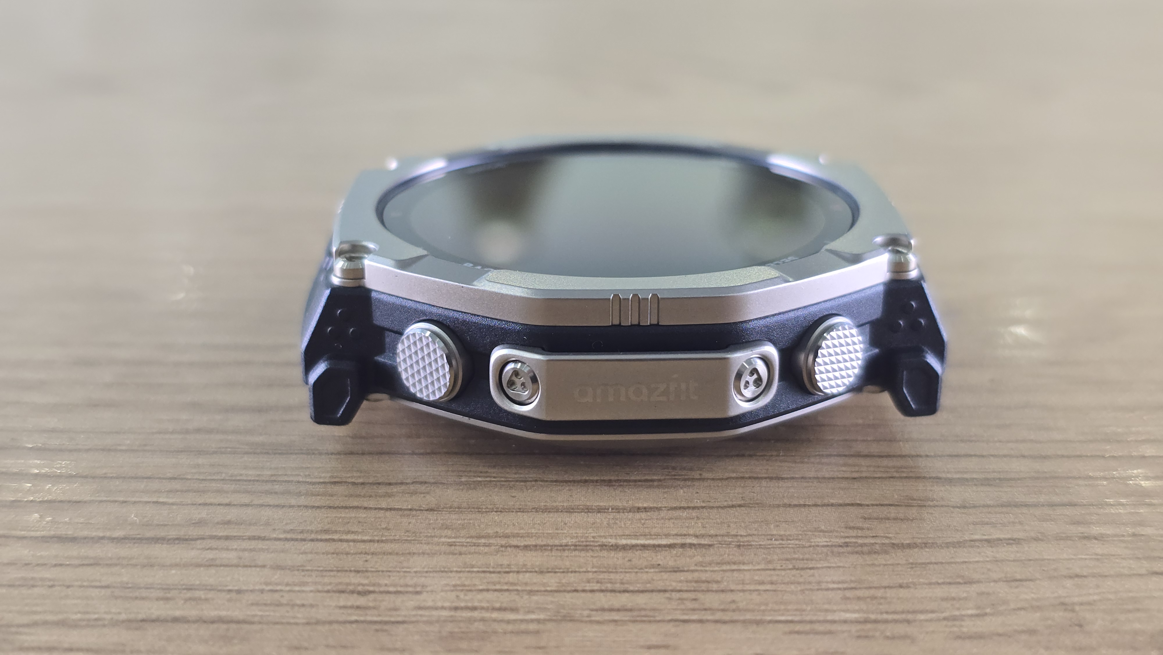 Кнопок четыре, по две с каждой стороны, имеют выраженную рифленую поверхность, что облегчает нажатие. На правой поверхности, между кнопками расположена металлическая вставка с гравировкой amazfit. На передней стороне встроен фонарь — отдельное окно в черном модуле корпуса.