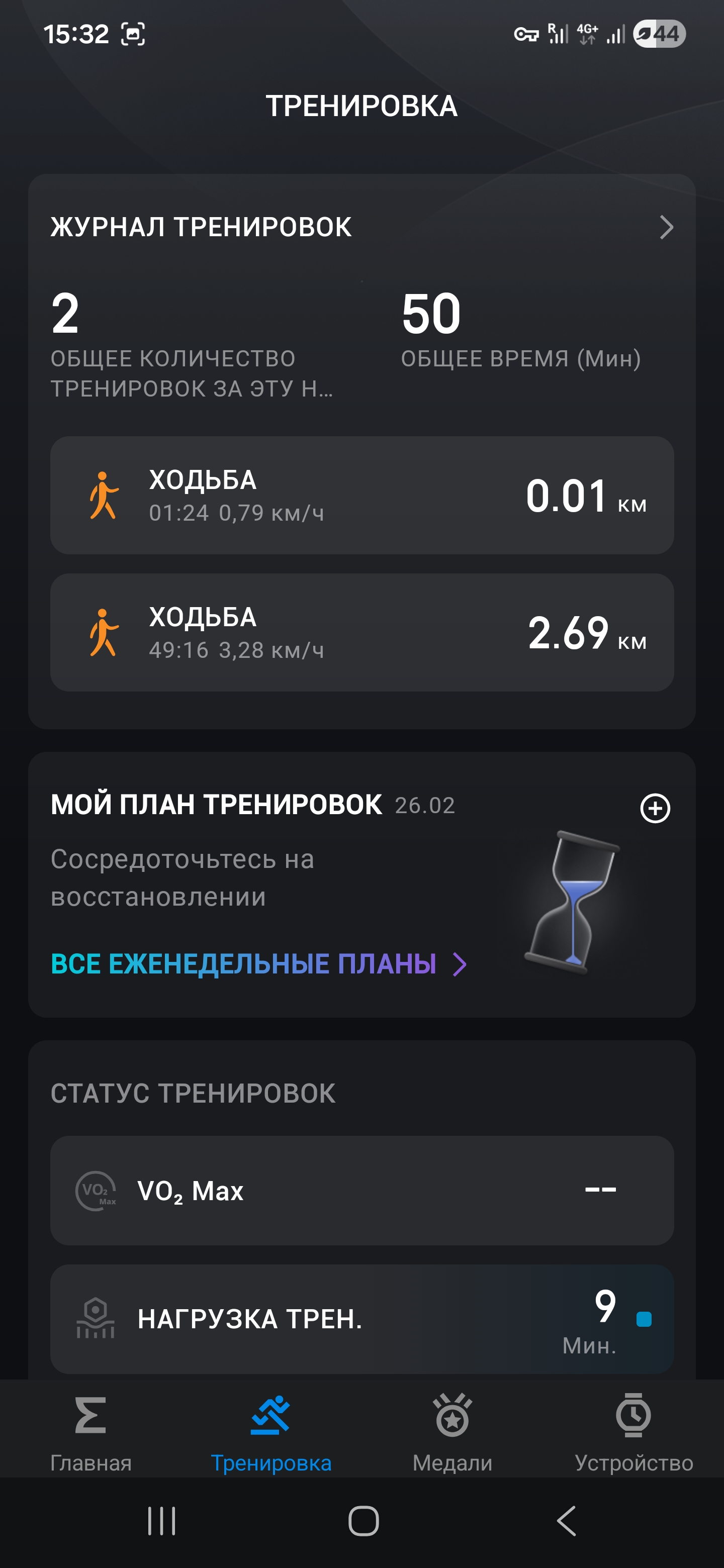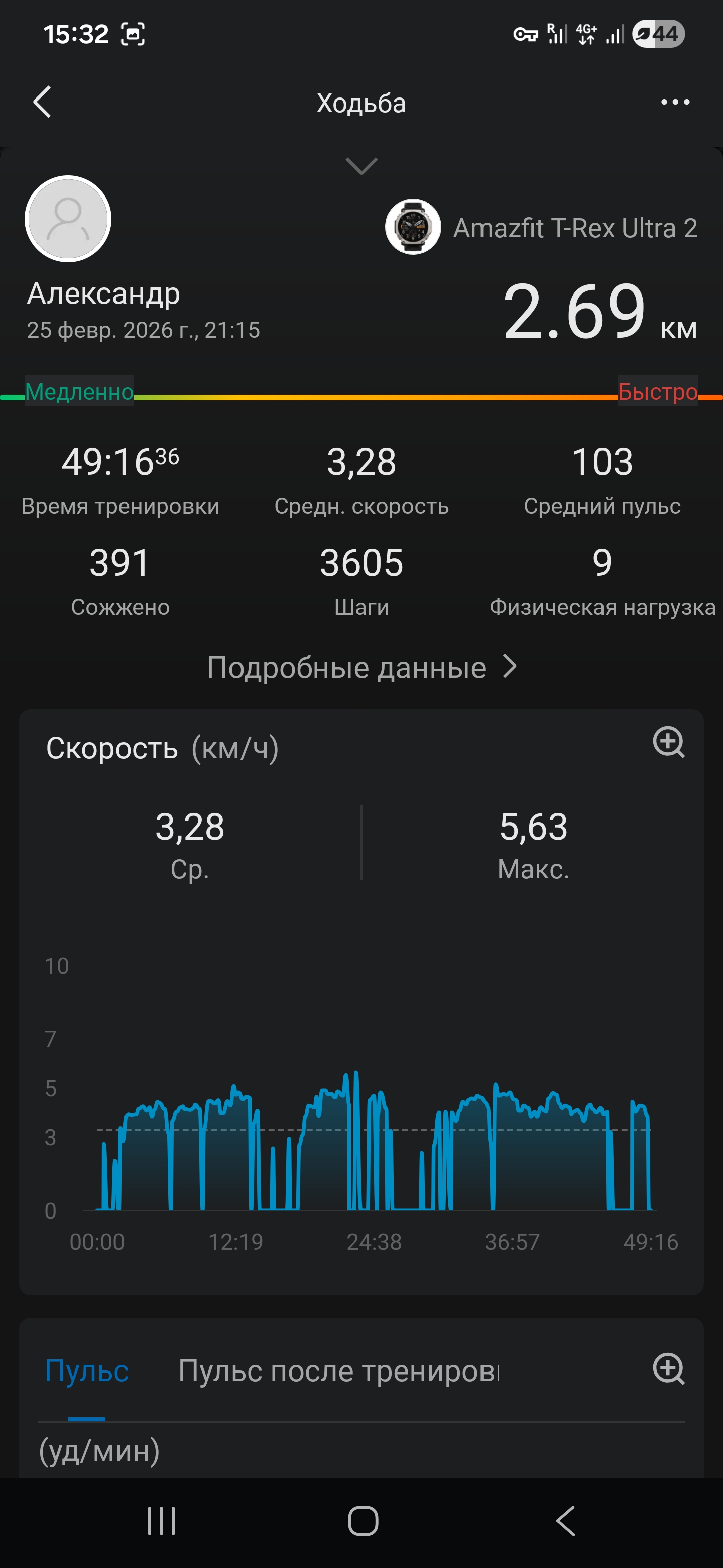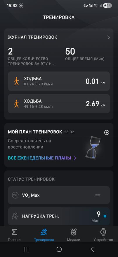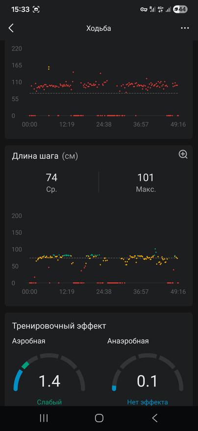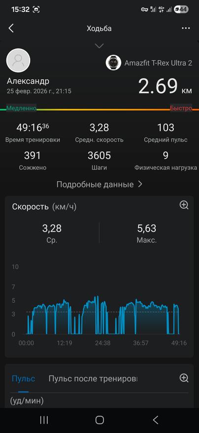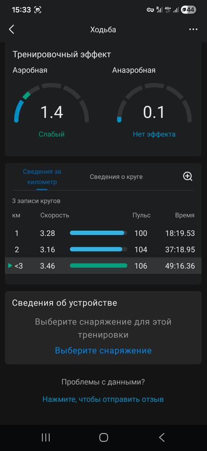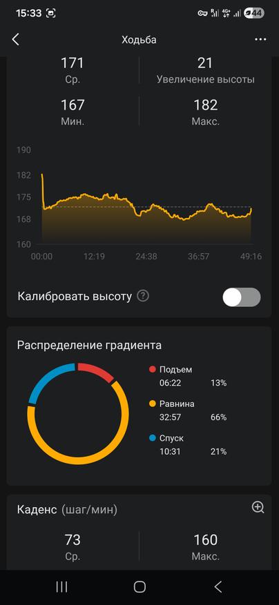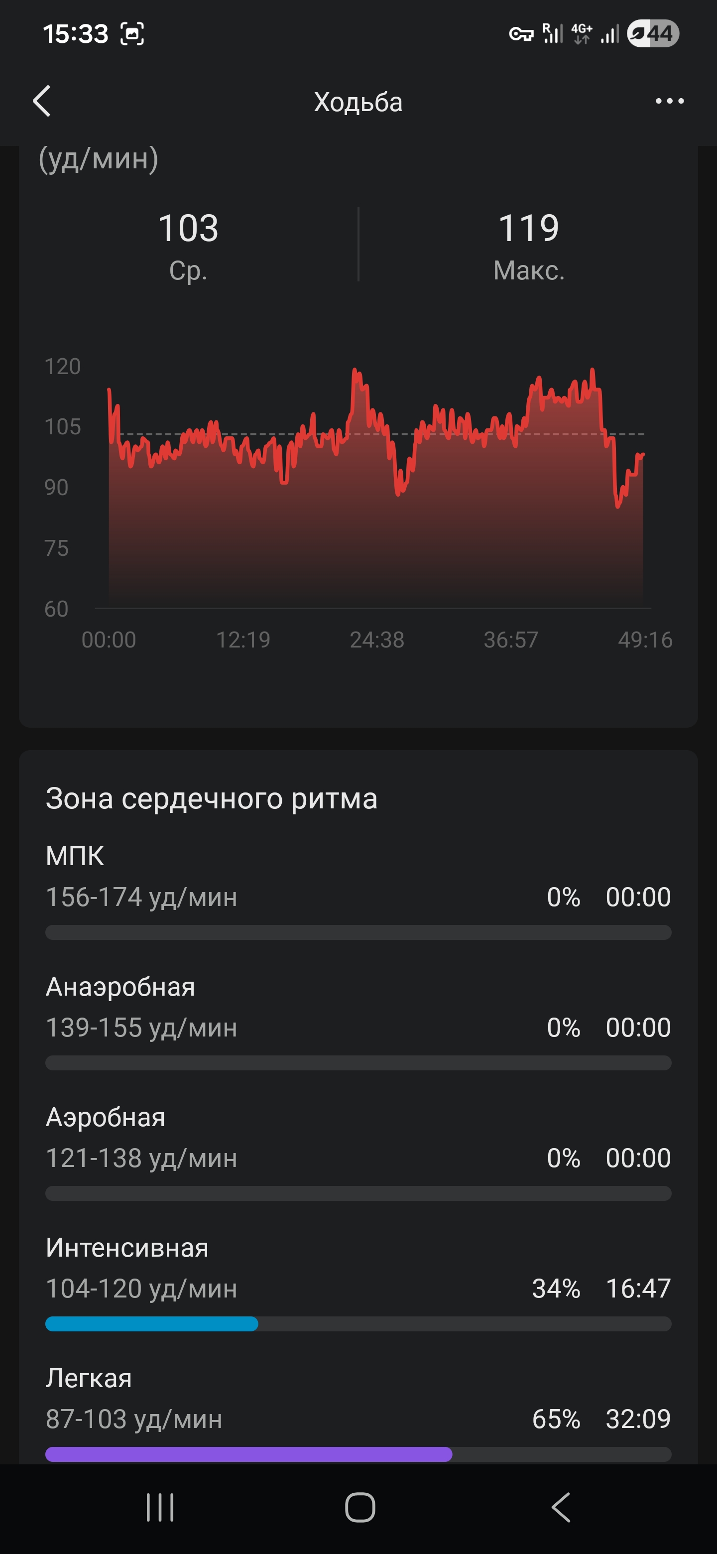 Посмотрел, как ведет себя датчик пульса в режиме ходьбы. Нагрудного датчика у меня нет, поэтому ориентировался на характер графика и сами значения. При спокойной ходьбе пульс держался в диапазоне 85-95 ударов в минуту. Когда ускорялся, показатель поднимался до 100-110 ударов. Резких скачков до 140-150 без причины не было, так же как и провалов до 60-65 во время движения. График выглядел плавным, без «пилы» и обрывов сигнала, данные записывались непрерывно на протяжении всей тренировки.