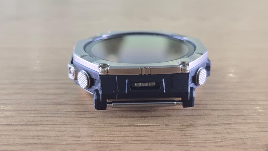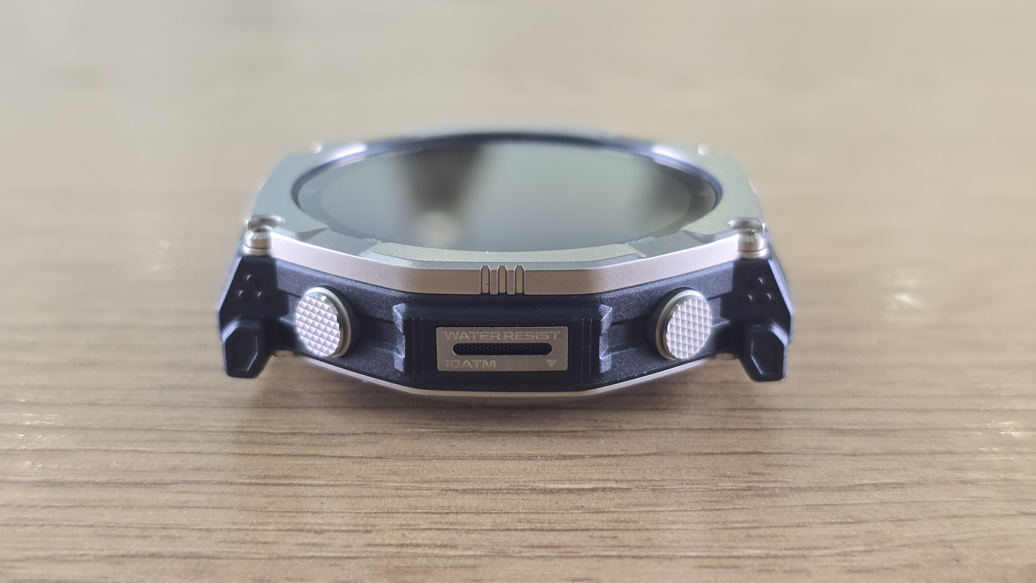 Профиль корпуса плотный, с выраженной толщиной. Переходы между материалами четкие. На левой стороне размещена маркировка Water Resist 10 ATM, она интегрирована в корпус и не выглядит отдельным элементом, там же расположен внешний динамик.