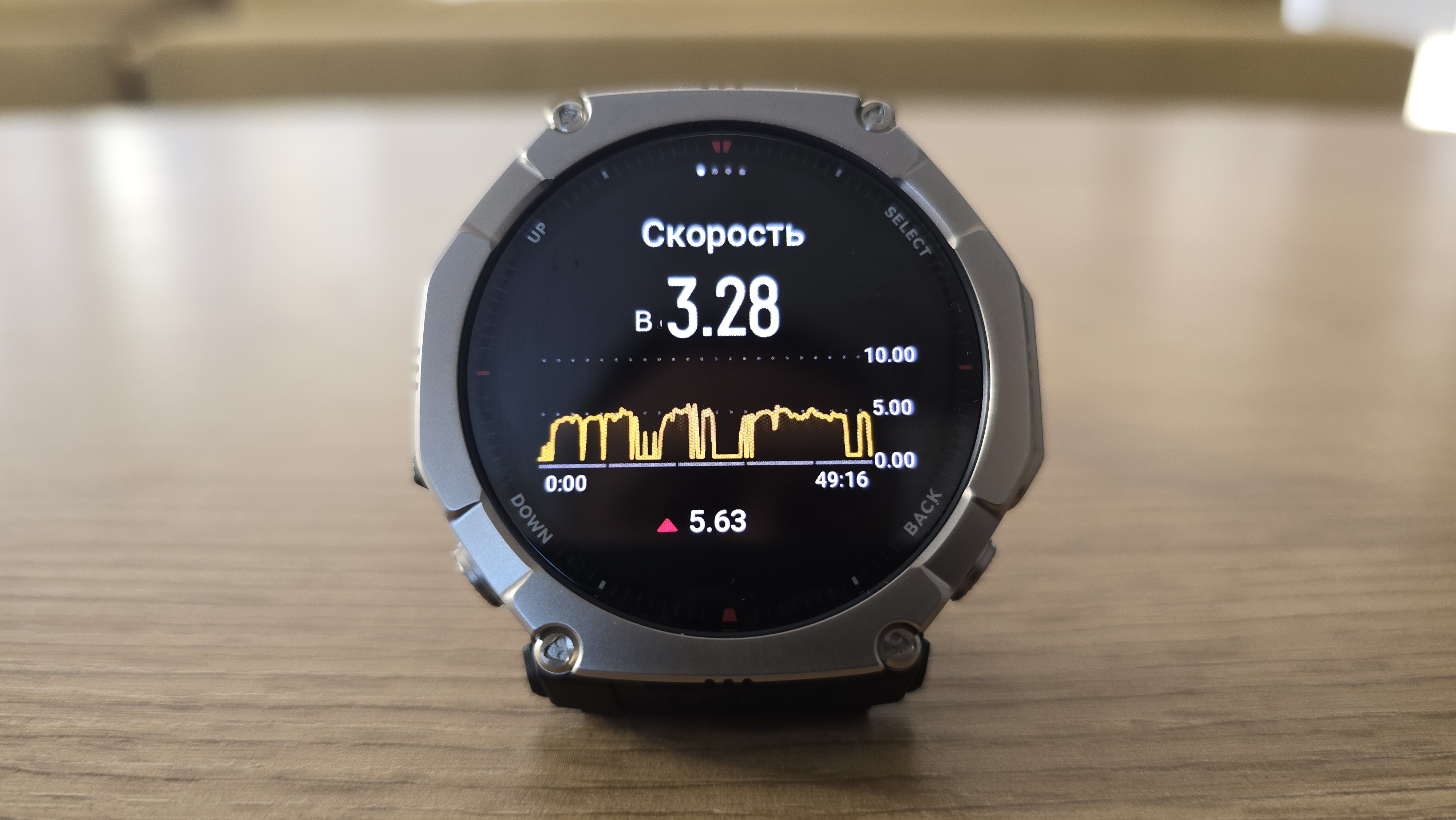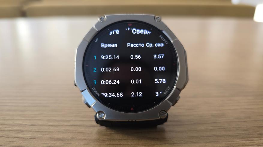 Из особенностей интерфейса во время тренировки отмечу следующий момент. Время на экране отображается, но цифры очень мелкие и читаются не так удобно, как на обычном циферблате. Чтобы выйти на основной экран часов, нужно нажать и удерживать кнопку Back. При этом однократное нажатие этой же кнопки отвечает за создание нового круга. Честно говоря, не сразу разобрался в этом, поэтому сразу грешил на особенности интерфейса.