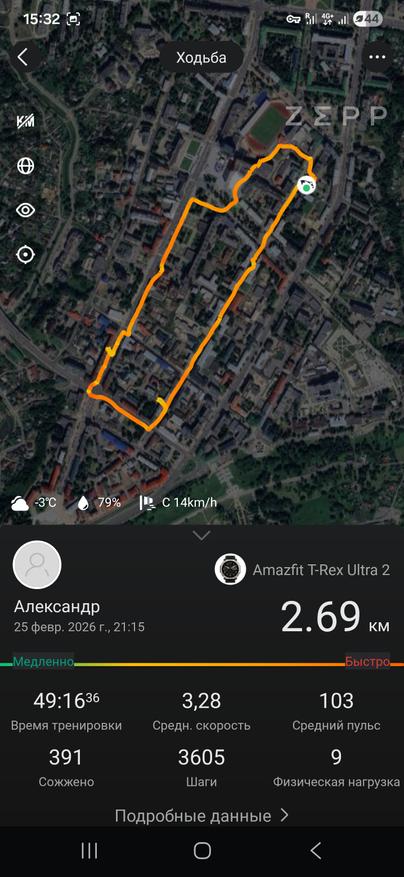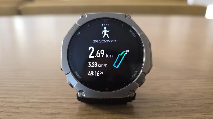 GPS я проверял в режиме «Ходьба». После запуска тренировки модуль позиционирования активировался сразу, спутники находились быстро, без долгого ожидания. Запись маршрута шла непрерывно, навигация была включена, экран периодически активировал для контроля показателей. На дисплее отображалась почти вся необходимая информация: скорость, пульс, пройденное расстояние и текущие параметры активности. По завершении маршрута выводилась карта с треком и сводные данные по тренировке.