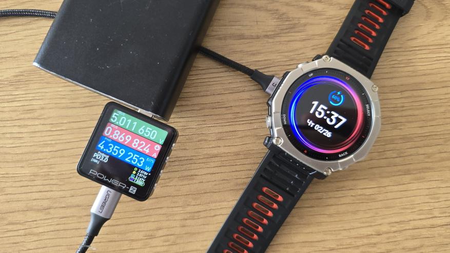Зарядку проверил через USB-тестер. Часы принимают питание при напряжении около 5.01 В, ток в процессе держится примерно на уровне 0.87 А. Мощность получается порядка 4.3-4.4 Вт. Показания стабильные, без резких скачков по току. Подключал как кабелем USB-C/USB-C к блоку питания, так и через USB-C/USB-A. В обоих вариантах заряд начинается корректно, каких-то ограничений по типу кабеля не заметил. Для повседневного использования это удобно — не нужно подбирать строго определенный адаптер.