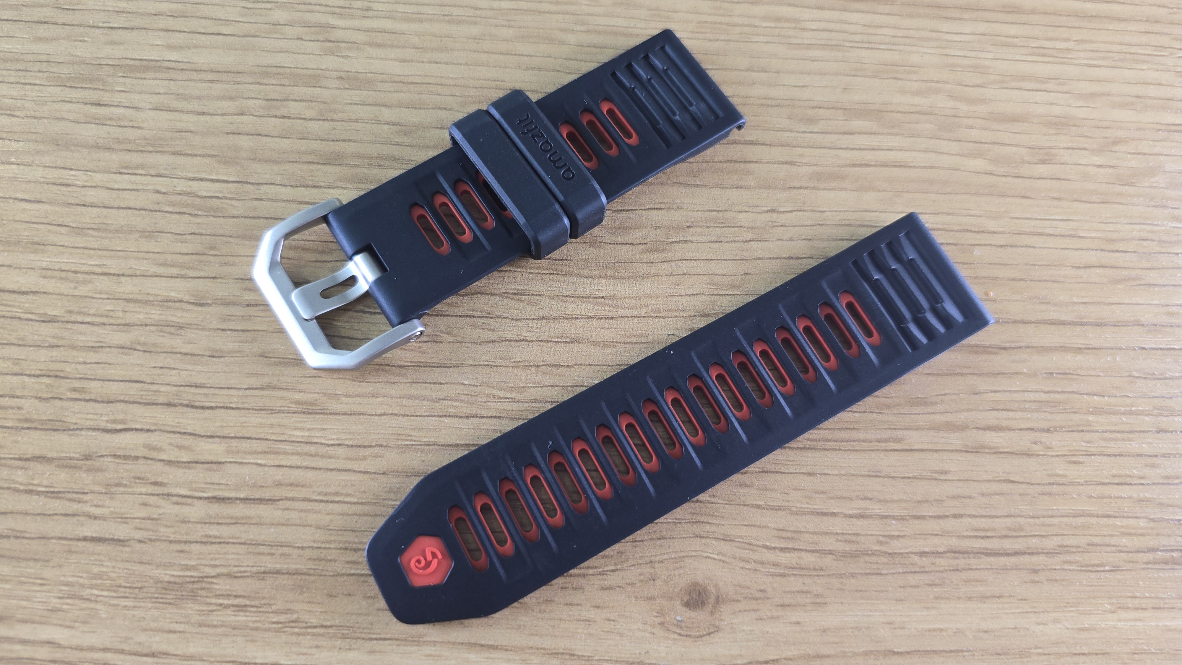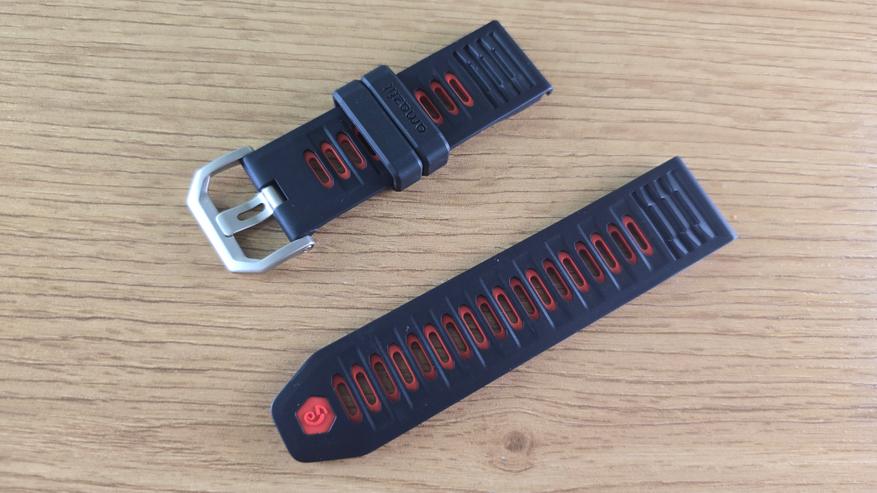 Ремешок силиконовый, шириной 26 мм. Внешняя сторона черная, внутренняя красная. По всей длине идут продолговатые отверстия, которые облегчают конструкцию и позволяют точно подстроить длину. Застежка металлическая, классическая, с фиксатором и дополнительной петлей для фиксации конца ремешка. Сам ремешок — быстросъемный.