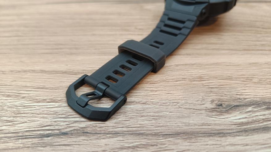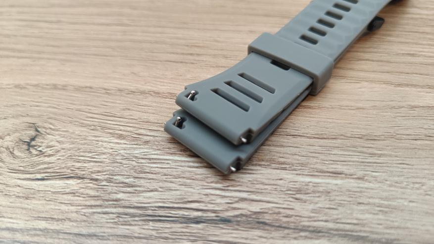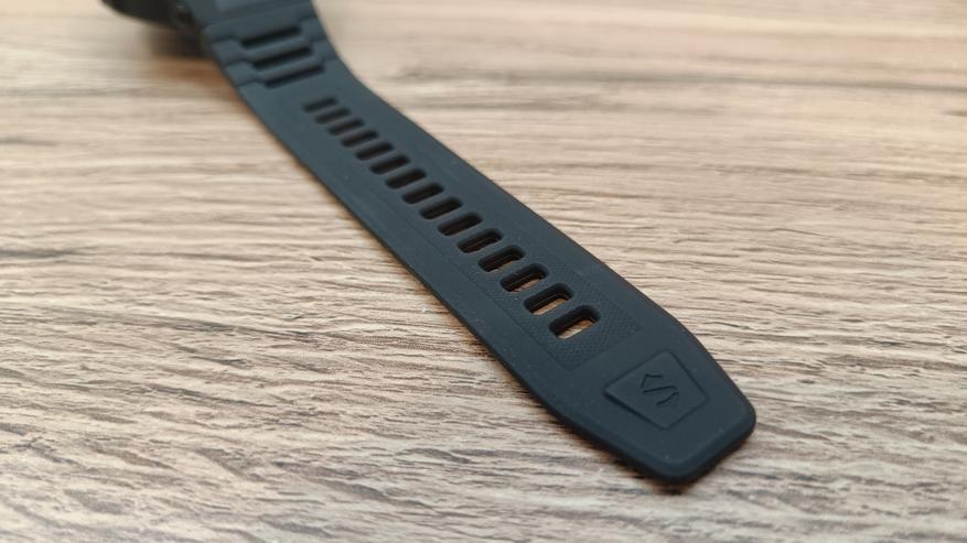 Сменные ремешки, как и те, что уже установлены изготовлены из силикона. Хотя довольно грубого. На морозе он слегка дубеет, но не как резина. Пряжка пластиковая и массивная. Длины ремешка хватает на мужскую руку, но к примеру, на моей остается всего 4 запасных отверстия для регулировки. Ремешки устанавливаются на быстросъемные металлические карабины и меняются за считаные секунды.