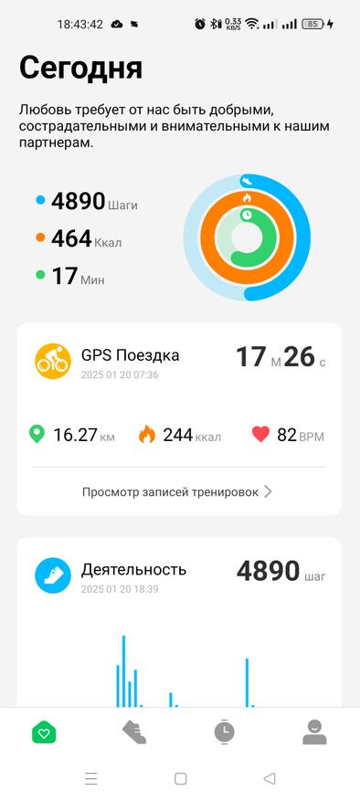 На первой странице можно увидеть все синхронизированные данные с часов. Можно отслеживать статистику за день, неделю или больший период. Также тут будет доступен пункт с выполненными тренировками. Очень в деталях можно оценить результат.