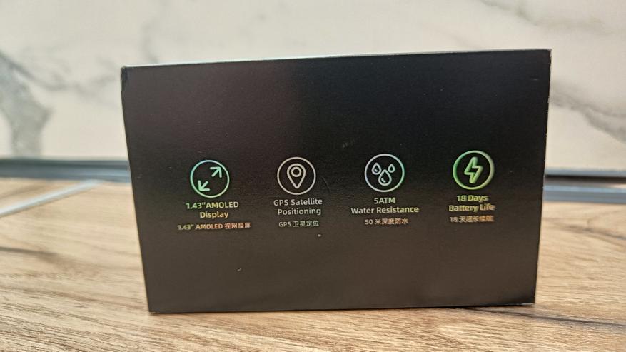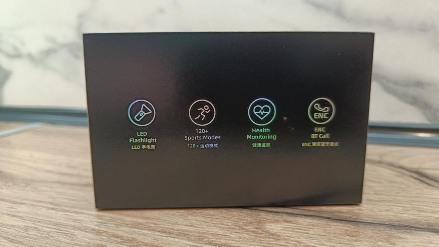 Смарт-часы поставляются в фирменной коробке с изображением устройства на переливающемся фоне. С тыльной стороны и боковых гранях присутствуют технические характеристики и описание ключевых возможностей.