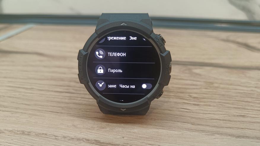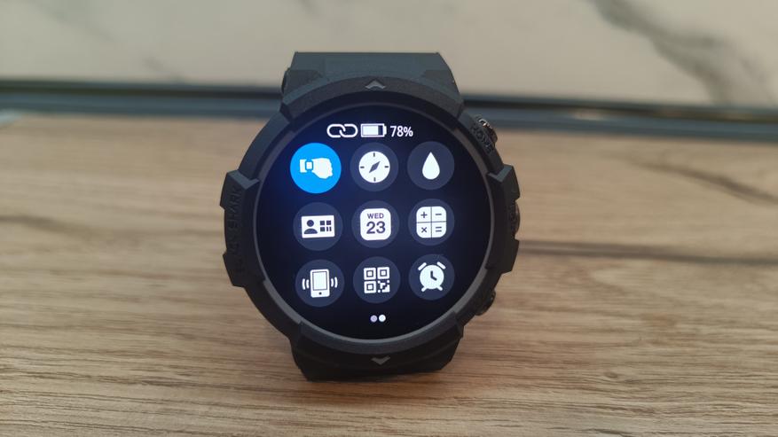 Управление смарт-часами осуществляется с помощью 2 функциональных кнопок и сенсорного экрана. Верхняя, кроме, входа в меню позволяет вернуться на шаг назад, а нижняя сразу возвращает на главное окно. В остальном все передвижения с использованием сенсорного экрана. Выпадающее меню открывается по сдвигу экрана вниз. В меню доступны пункты, позволяющие включить калькулятор, календарь, будильник, просушить часы вибрацией, отрегулировать яркость экрана, активировать фонарик и многое другое.