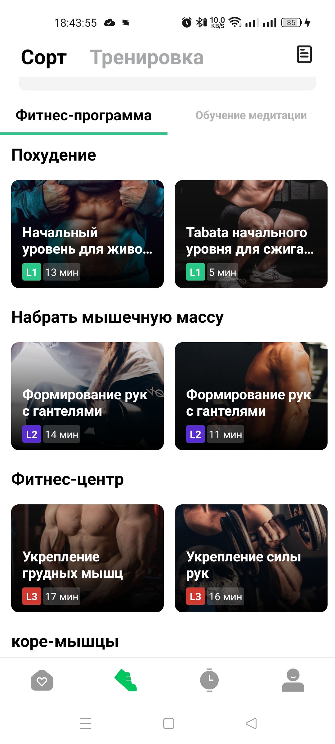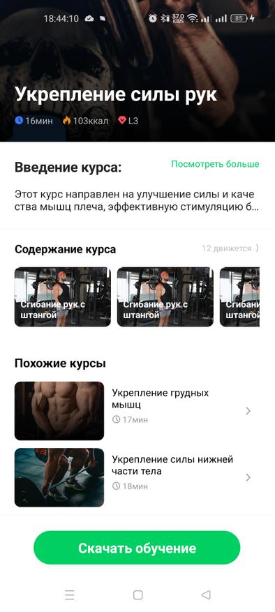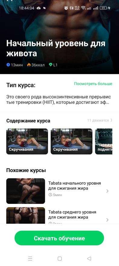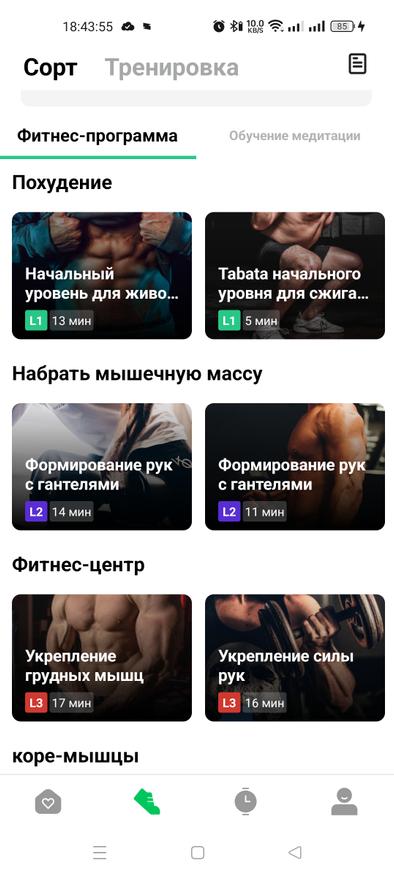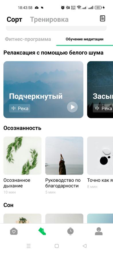 На второй странице будут доступны пресеты тренировок, а также детальный разбор по фитнес-программам. Можно пройти курс медитации. А в случае необходимости загрузить курс тренировок и использовать их как личного тренера.