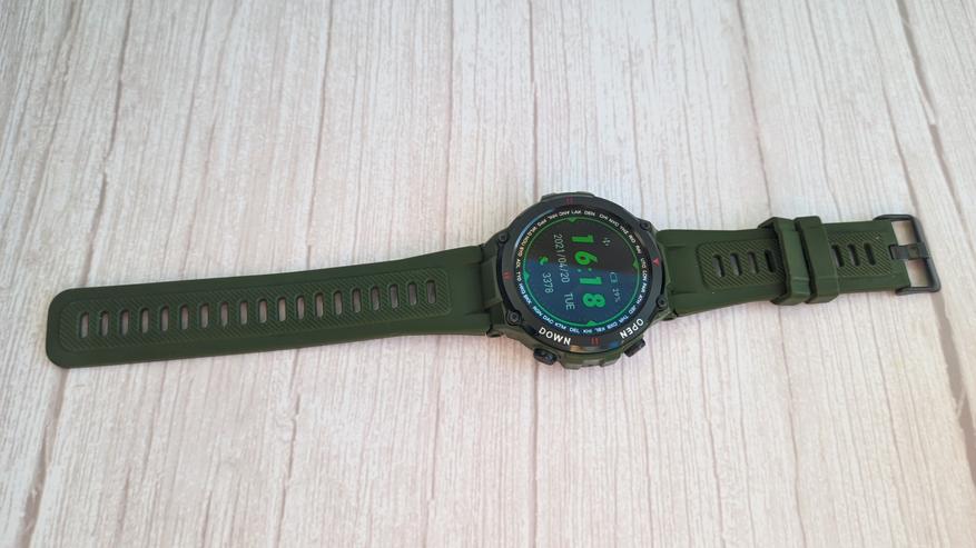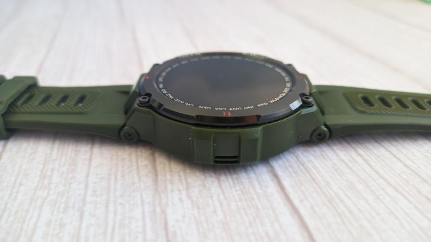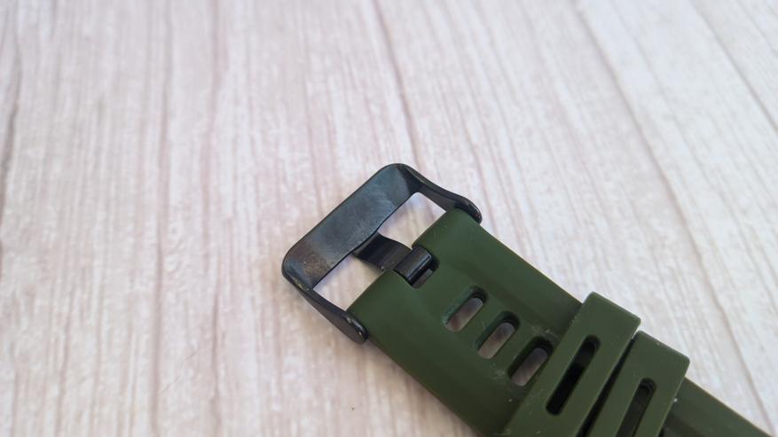 Ремешок в комплекте на 22 мм, с возможностью замены на абсолютно любой. Он крепкий и удобный, имеет металлическую пряжку. Часовые шпильки имеют рычажок для быстрой замены. С обратной стороны расположен датчик сердцебиений, расписана модель и сборка