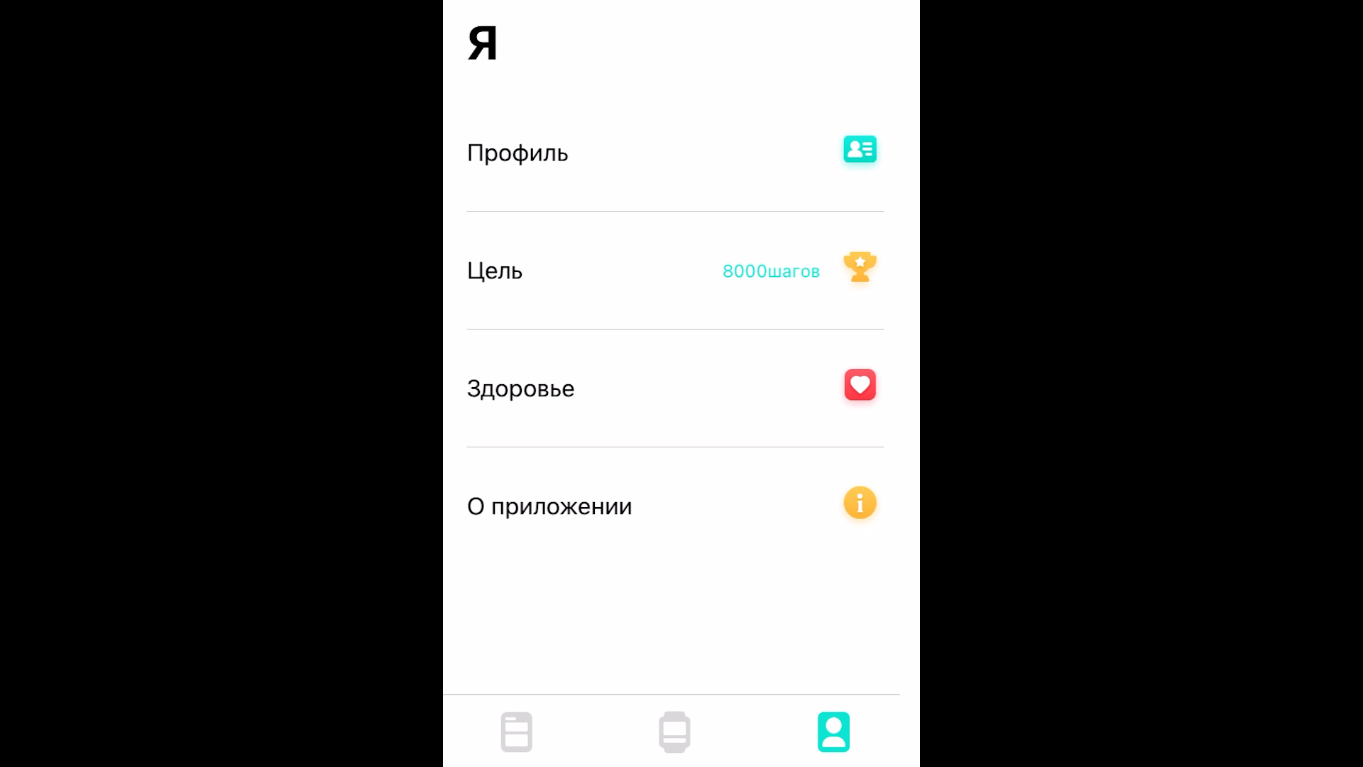 Раздел профиля, его ребята назвали как «Я». В профиле мы задаем: пол/рост/вес/возраст/длину шага. Цель шагов, которую хочется достигнуть, все рекомендуют 8000 шагов, это можно сказать общепринятый минимум. «Здоровье» позволяет синхронизироваться с Вашим штатным приложением на телефоне. И общая информация о приложении.