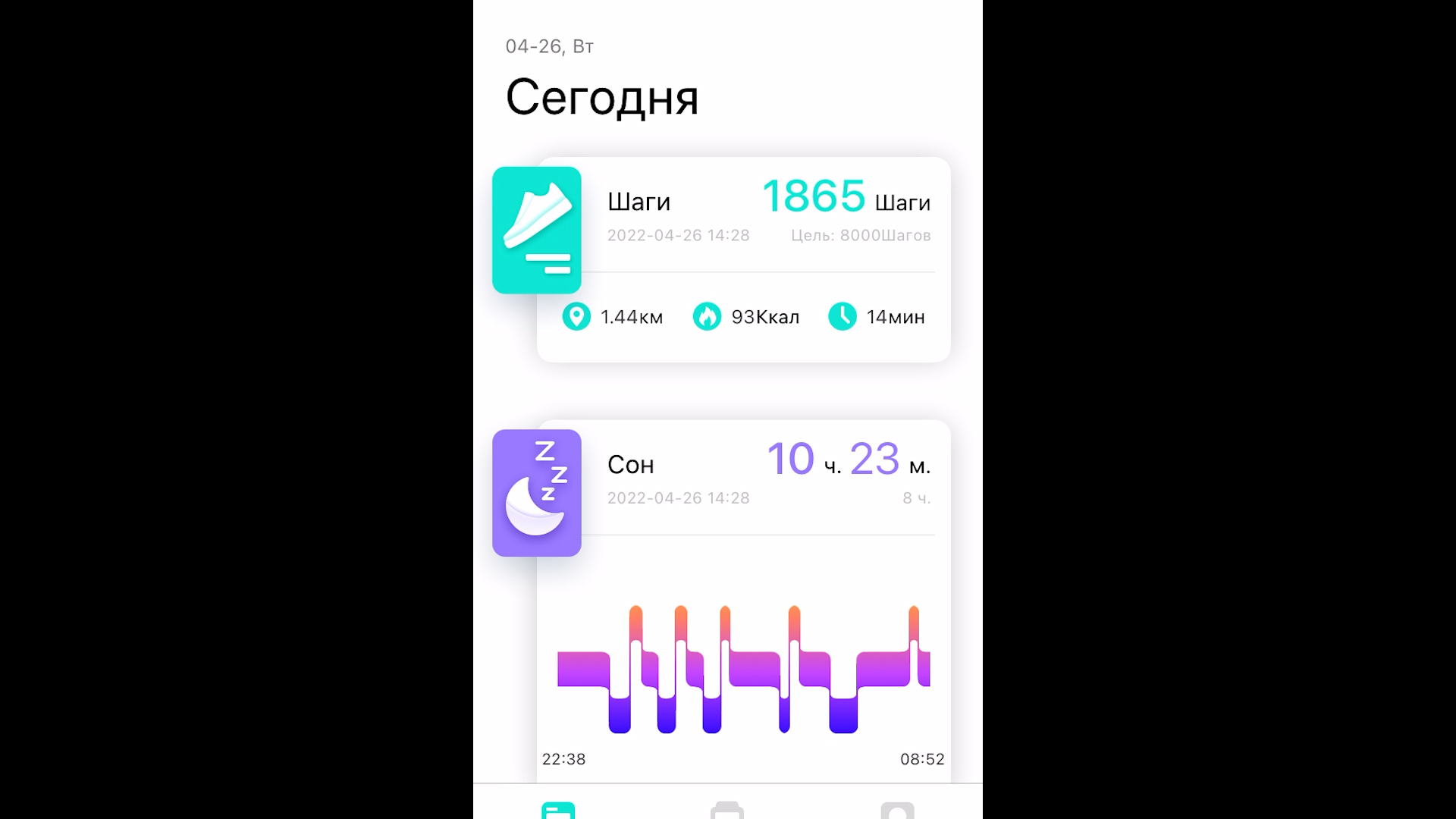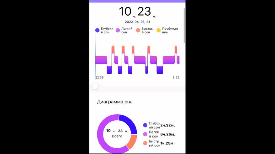Далее наш сон, да-да не удивляйтесь, я люблю поспать. Но если мы посмотрим продолжительность и качественность, то позавидуете мне точно. Ниже пульс, его замеряю редко поэтому тут прочерк, но на мое удивление замеряет очень правдиво, сравнивал с классическим замером по секундомеру, отклонения в 2-3 удара.