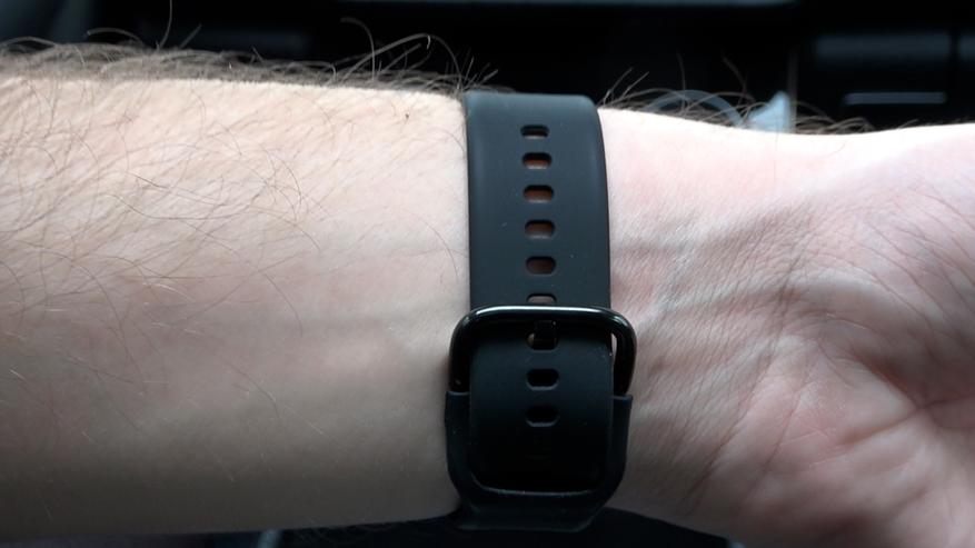 Резиновый ремешок софт-тач, приятный на ощупь и имеет много отверстий для фиксации, даже несмотря на то что у меня запястье всего 17.5 см есть еще 6-7 отверстий для затяжки, значит на детскую руку тоже отлично подойдет.
