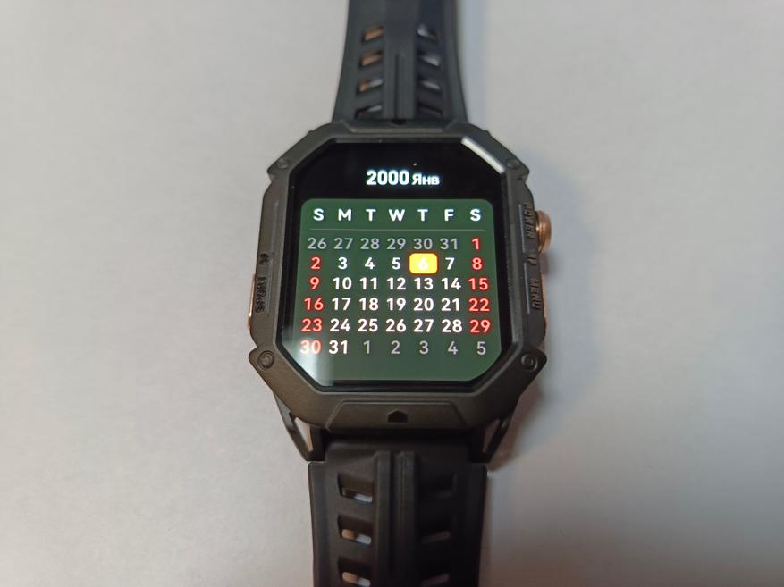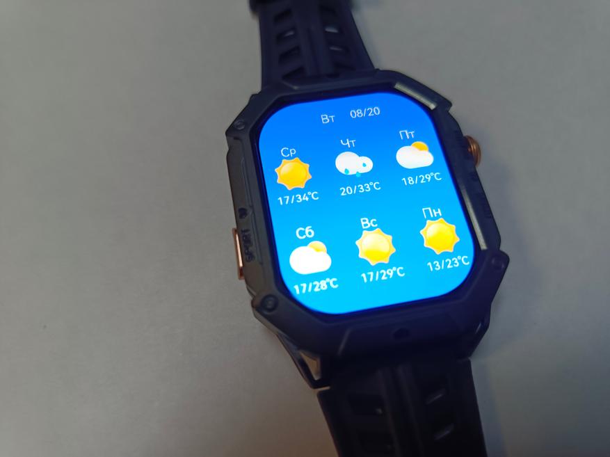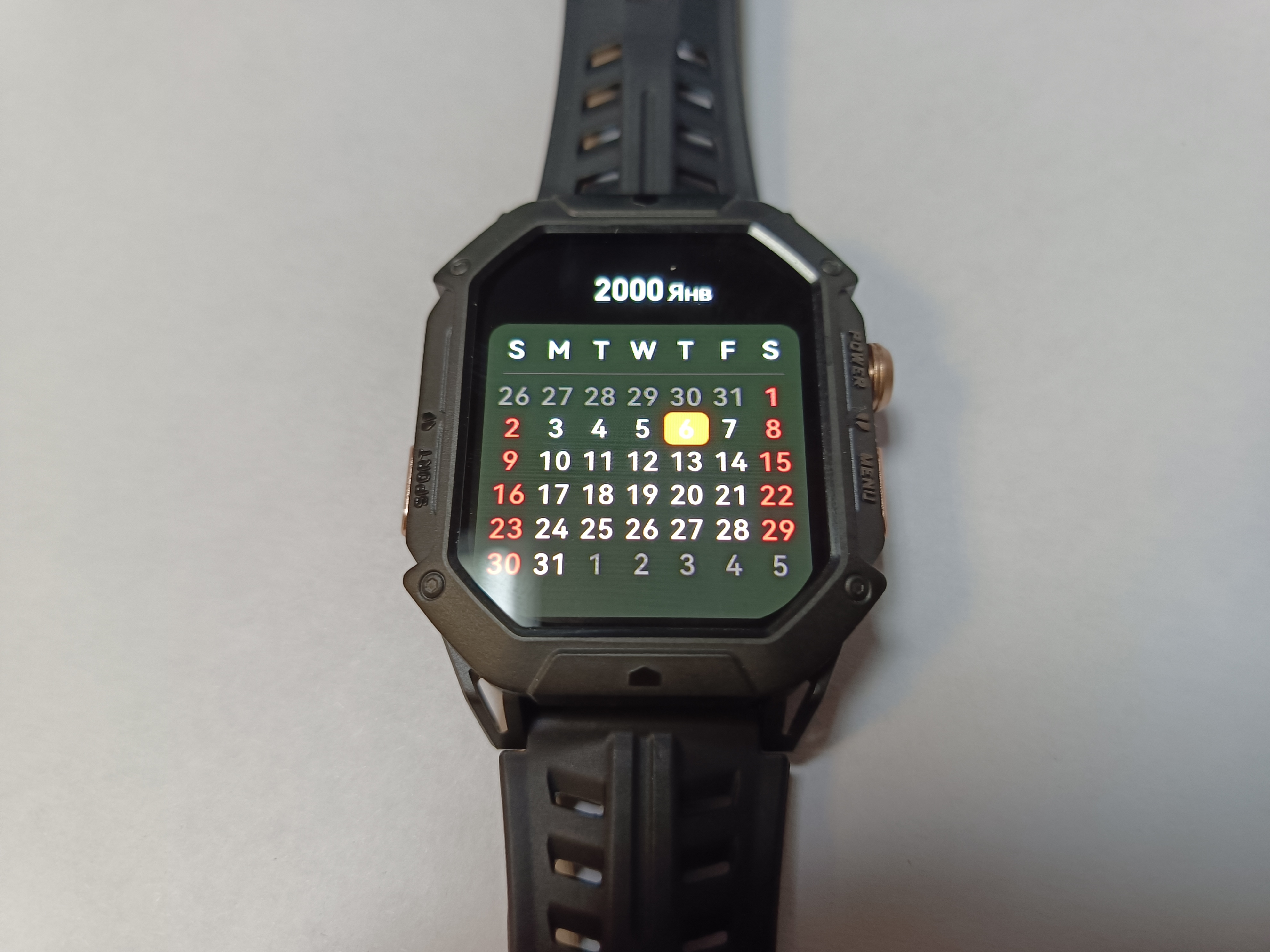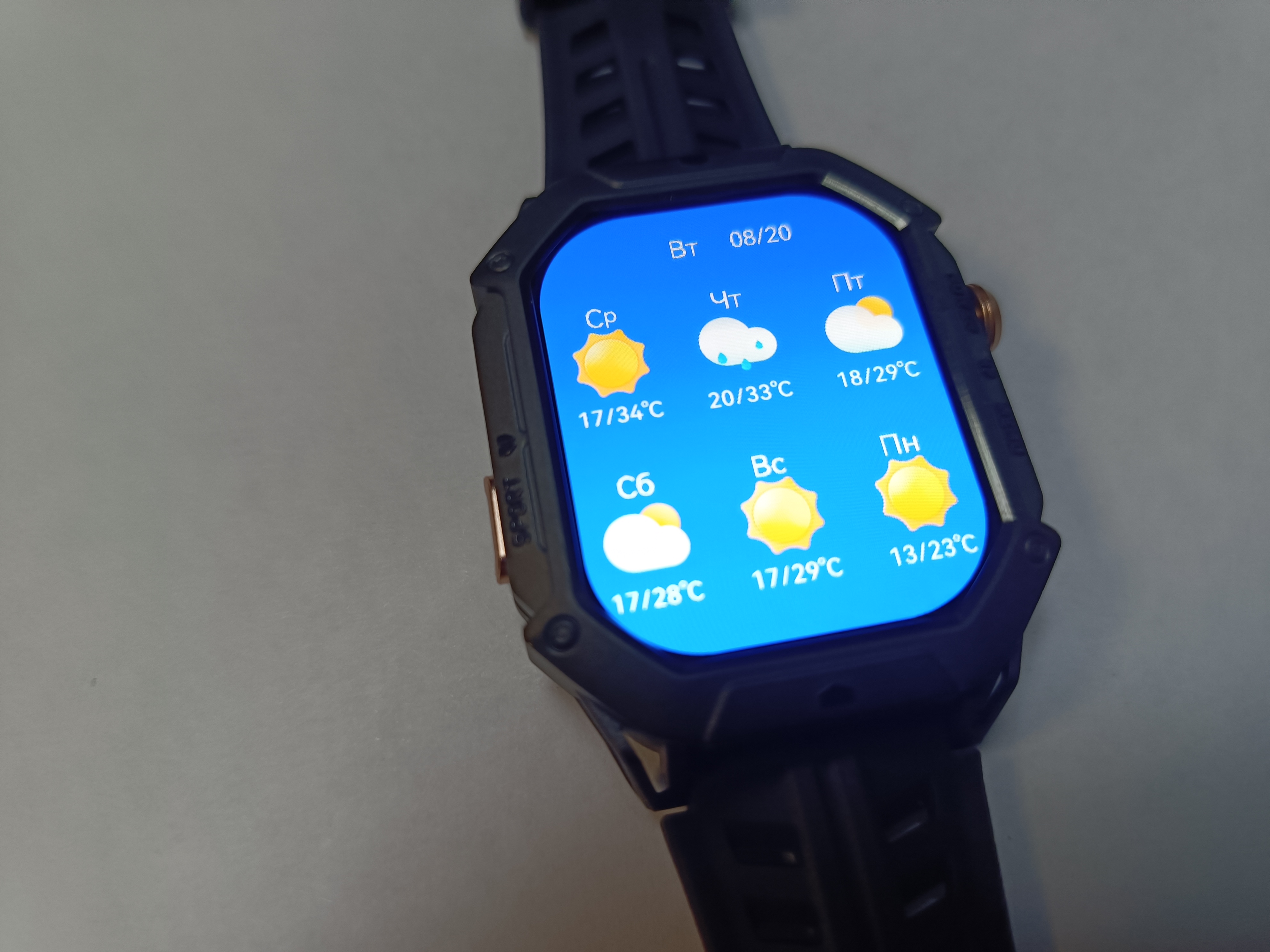 Стандартный набор органайзера. Всё как обычно: секундомер, будильник, калькулятор классика без расширенного режима, календарь, таймер и погода. Информация о погоде берется со смартфона. Показывает сегодняшний день и плюс шесть дней вперед.