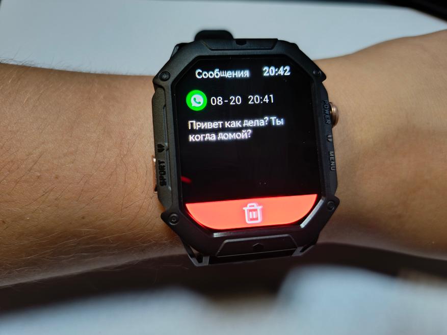 Когда часы на руке, то уведомление активируется на малую часть экрана. Надо нажать на него для полного отображения. Такое уведомление весит всего около трех секунд. Если не успели нажать, то свайпните снизу вверх, и у вас отобразятся все последние уведомления. Поддерживает любое приложение, нужно в настройках на «Смартофоне» поставить галочку на нужным вам приложением.
