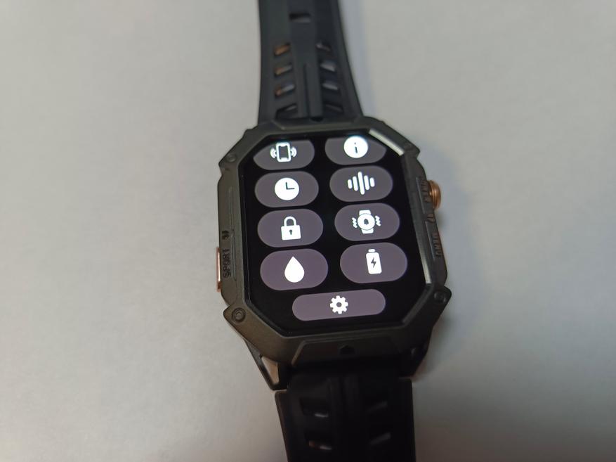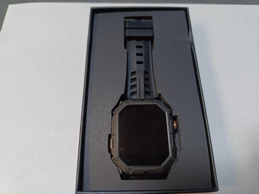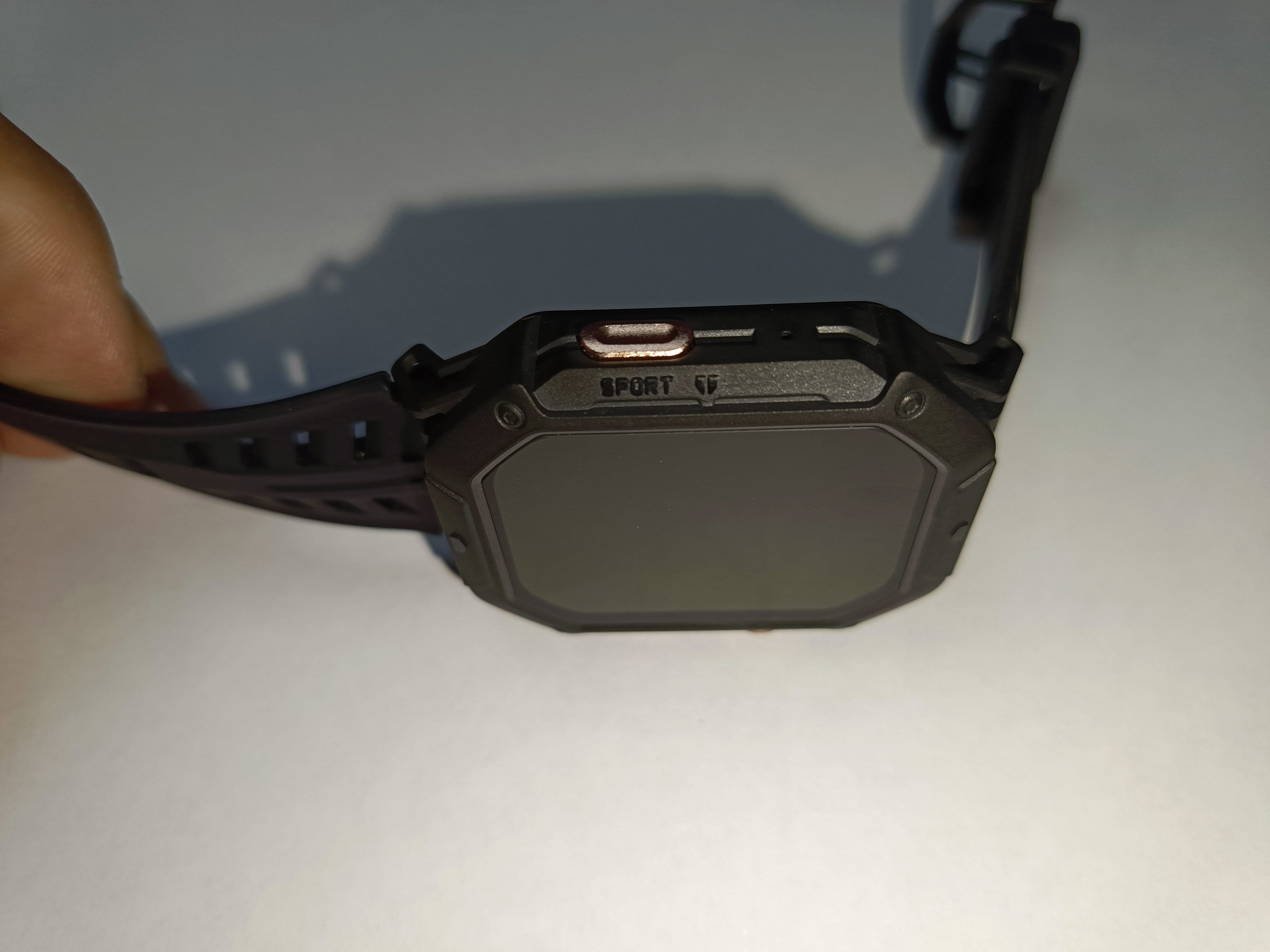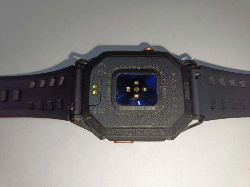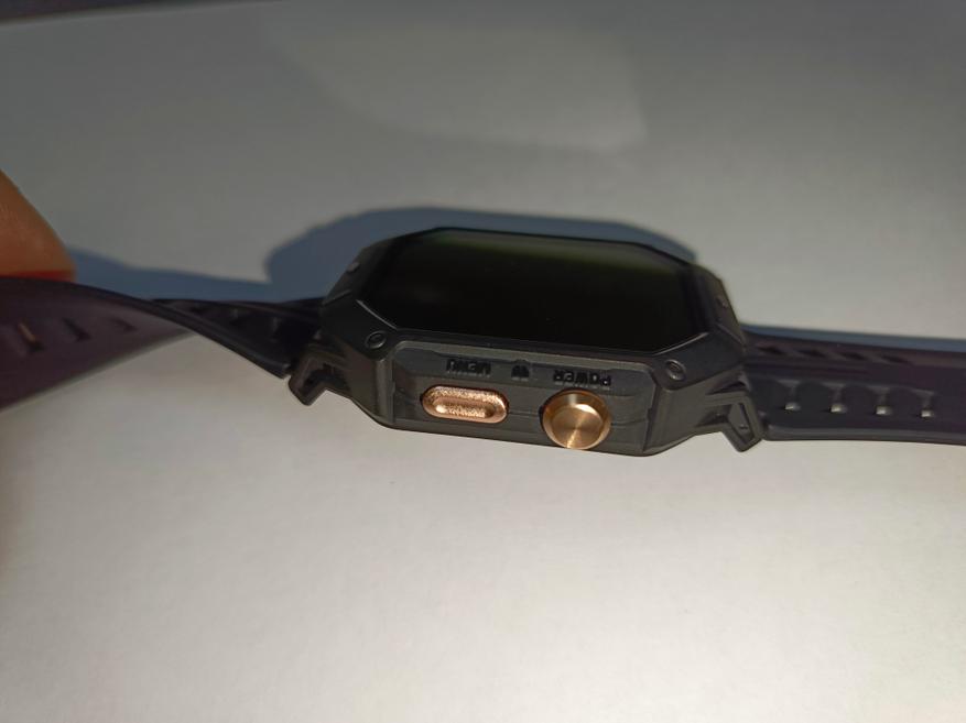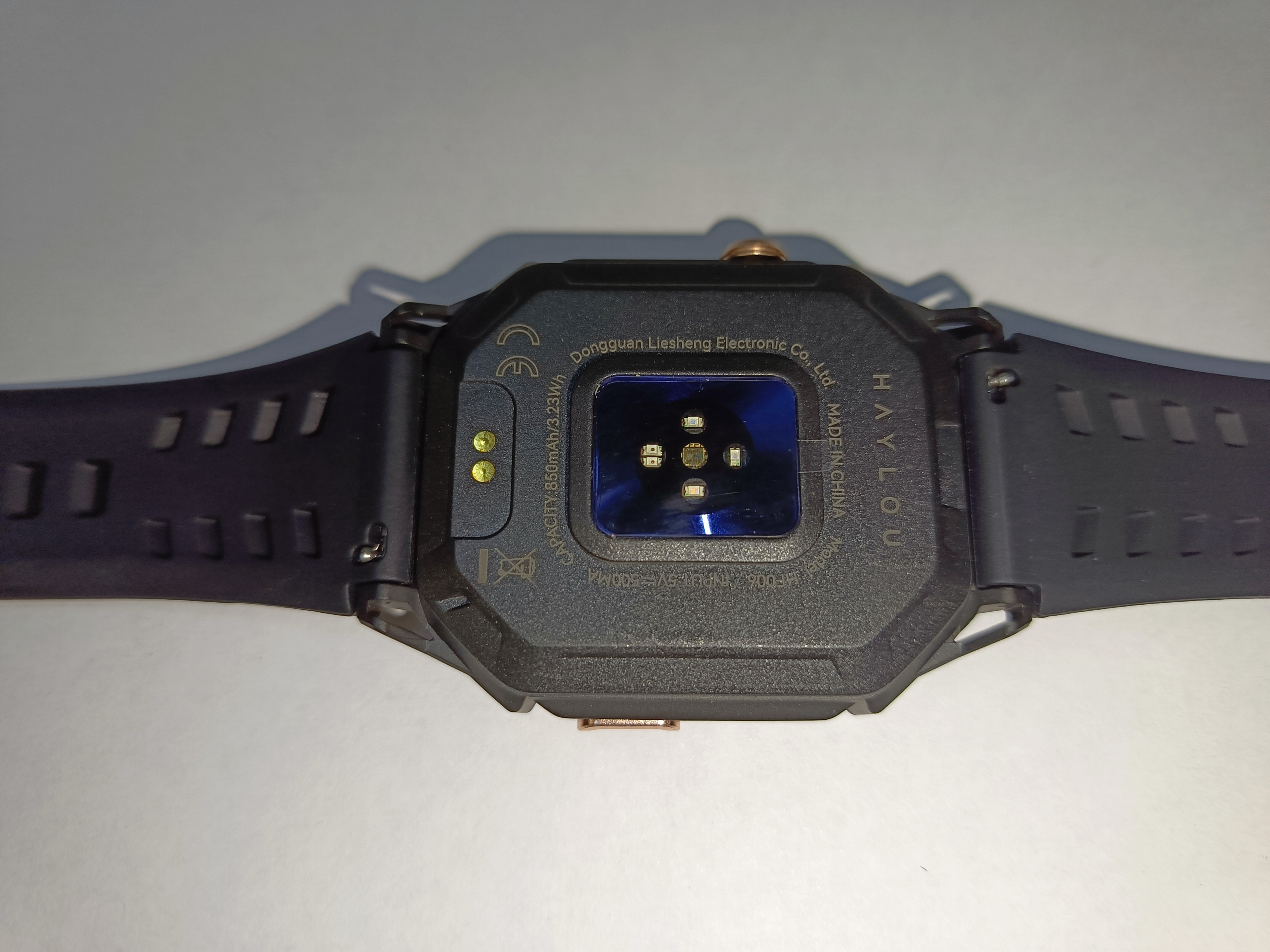 Дисплей шестиугольной формы, что непривычно для смарт-часов, обычно квадратные или круглые. С правой стороны расположены две золотистые кнопки, а с левой — одна. В нижней части часов находятся датчики кислорода и пульса, а также контакты для магнитной зарядки.
