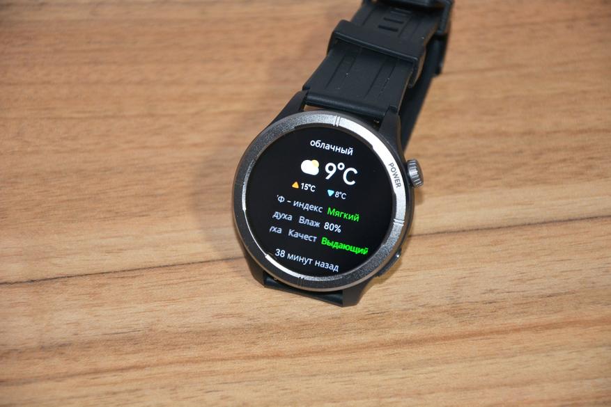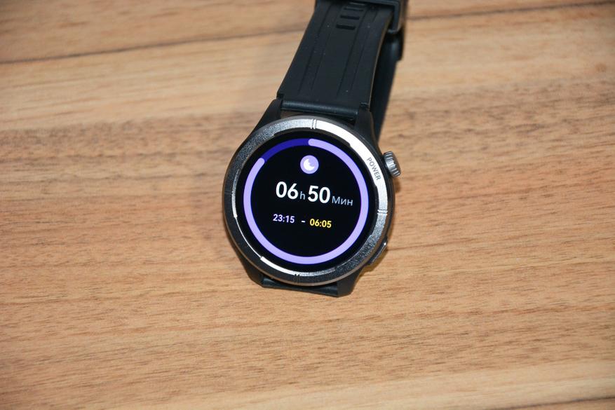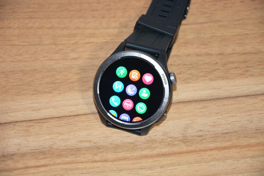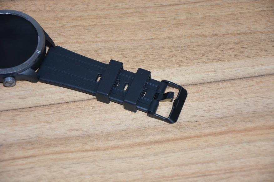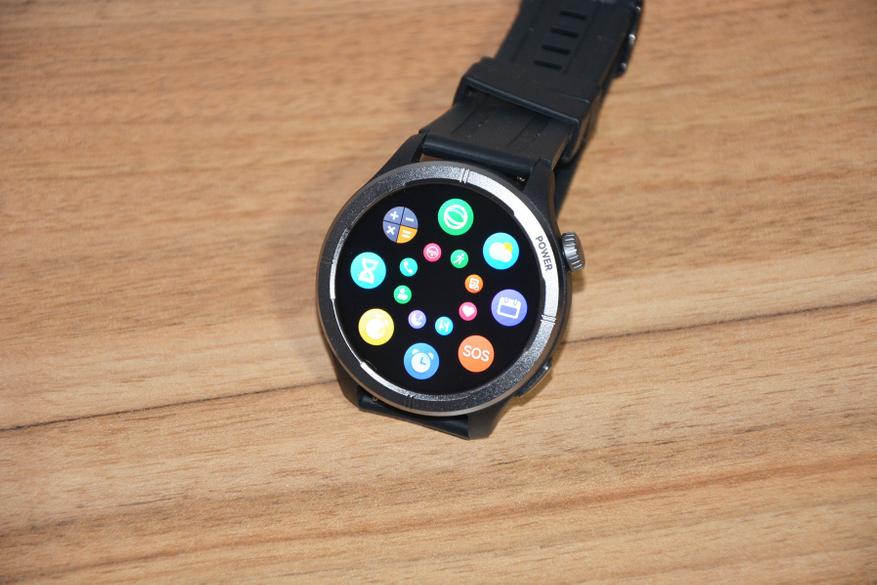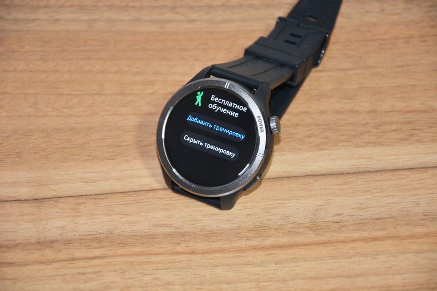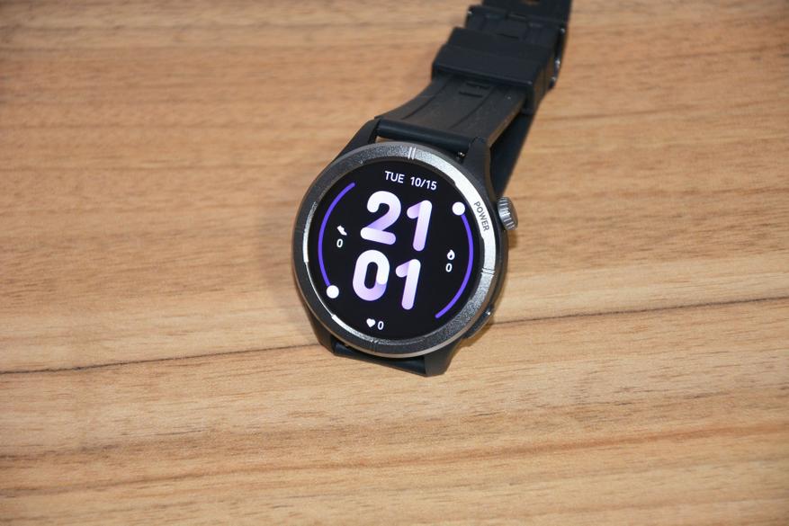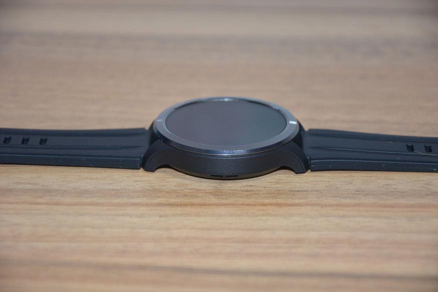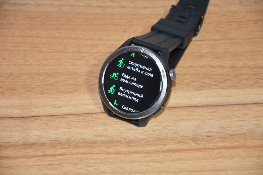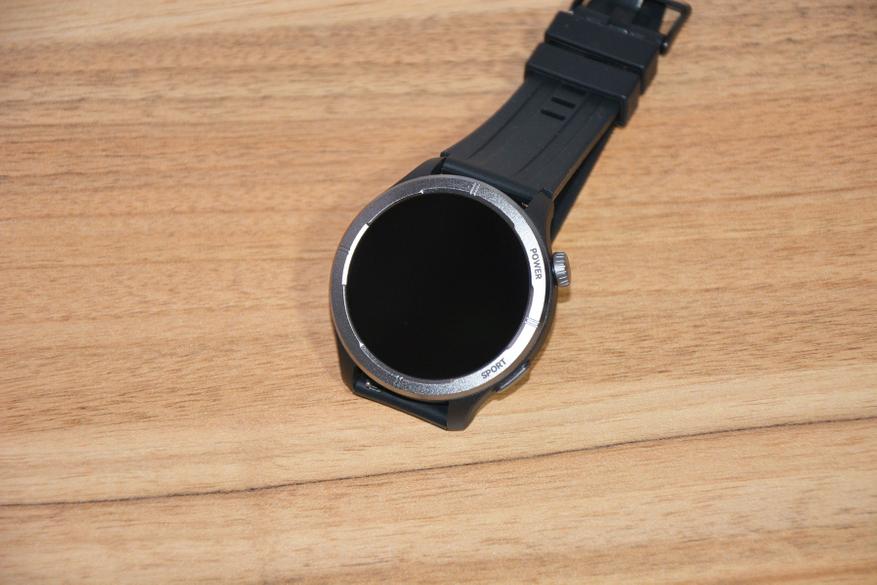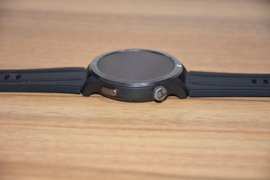 Экран практически не имеет рамки, но имеет олеофобное покрытие. Не самое лучшее, но существенно снижающее количество отпечатков пальцев. К сенсору претензий нет вообще — чуткий, без ложных срабатываний. На безеле надписи назначения кнопок, которых тут всего две. Верхняя, стилизованная под заводную головку, включает, выключает часы длительным удержанием, кратким возвращает в предыдущий пункт интерфейса, при нажатии открывает меню всех функций часов. Работает как энкодер — вращая ее можно быстро найти требуемую функцию, что несомненно удобно. Нижняя кнопка открывает меню спортивных режимов. На левой стороне пусто.