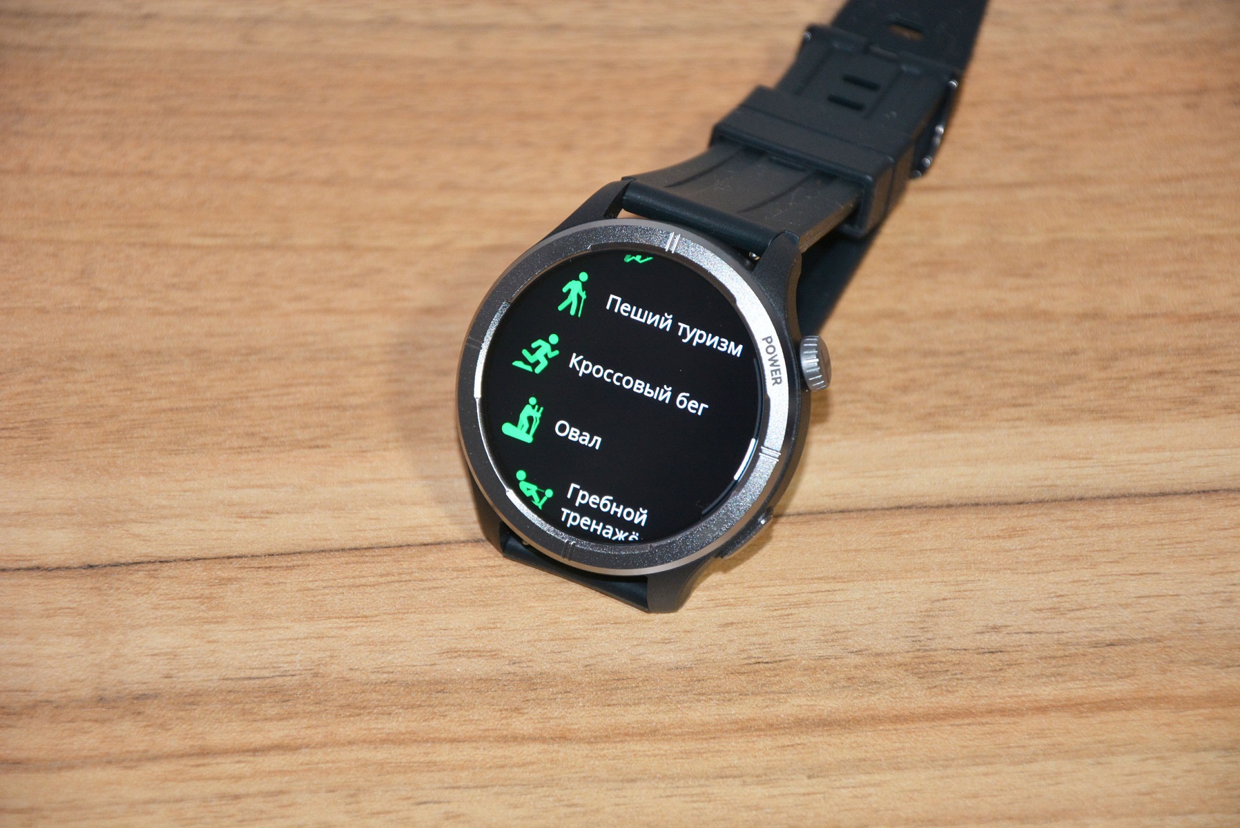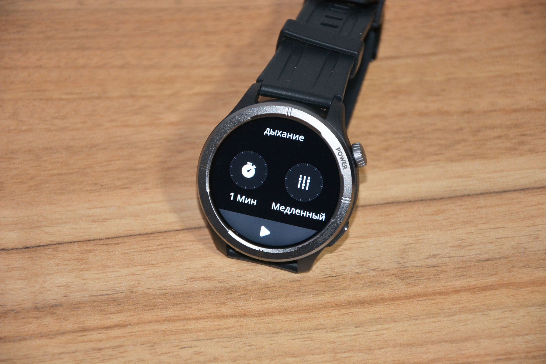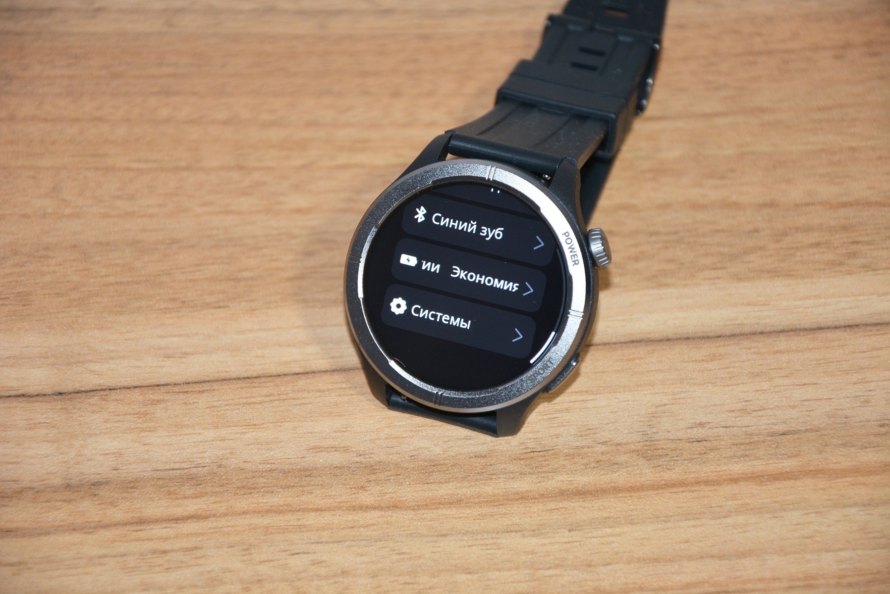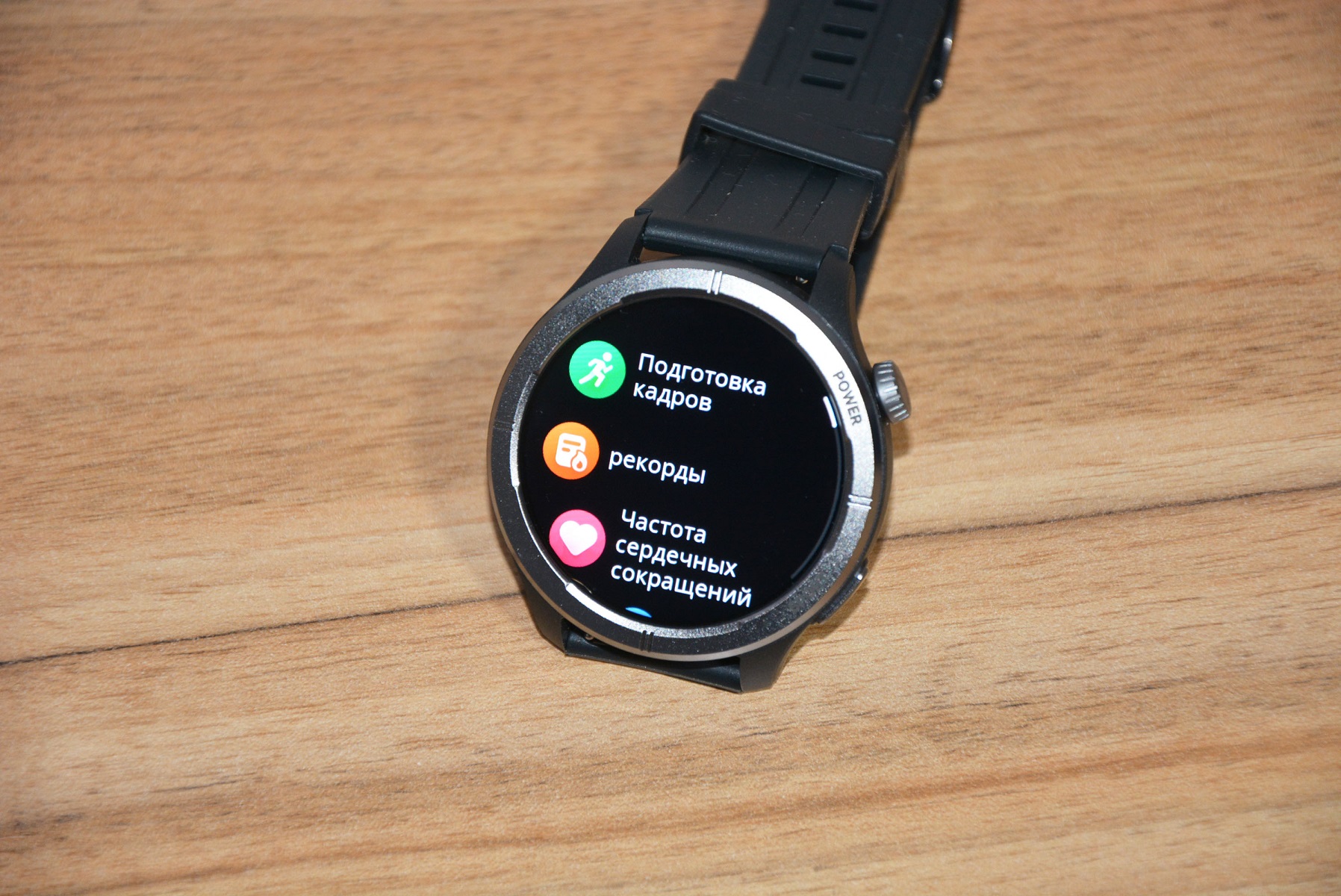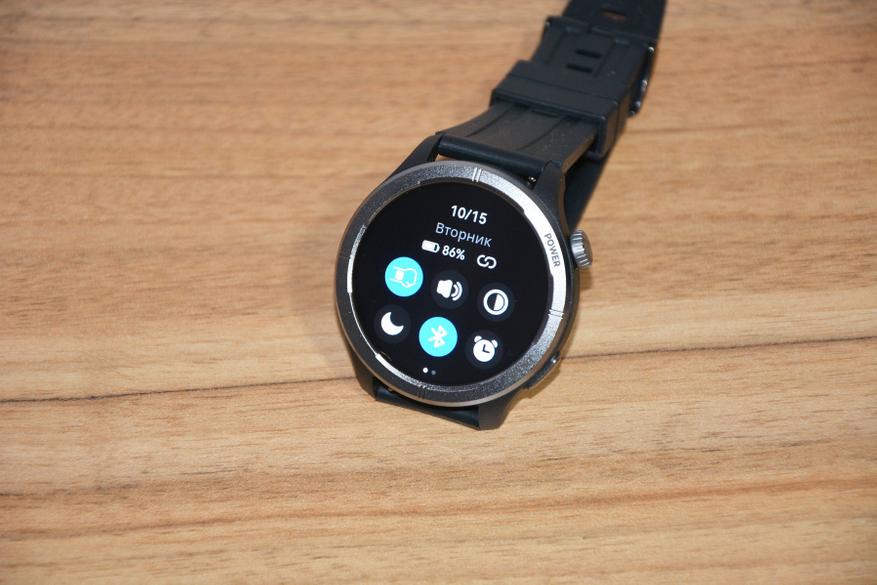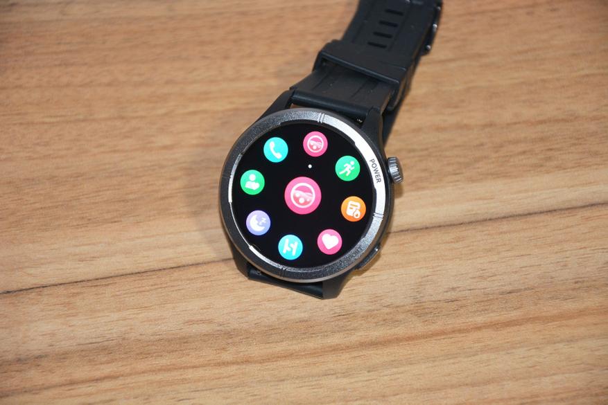 Экран практически не имеет рамки, но имеет олеофобное покрытие. Не самое лучшее, но существенно снижающее количество отпечатков пальцев. К сенсору претензий нет вообще — чуткий, без ложных срабатываний. На безеле надписи назначения кнопок, которых тут всего две. Верхняя, стилизованная под заводную головку, включает, выключает часы длительным удержанием, кратким возвращает в предыдущий пункт интерфейса, при нажатии открывает меню всех функций часов. Работает как энкодер — вращая ее можно быстро найти требуемую функцию, что несомненно удобно. Нижняя кнопка открывает меню спортивных режимов. На левой стороне пусто.