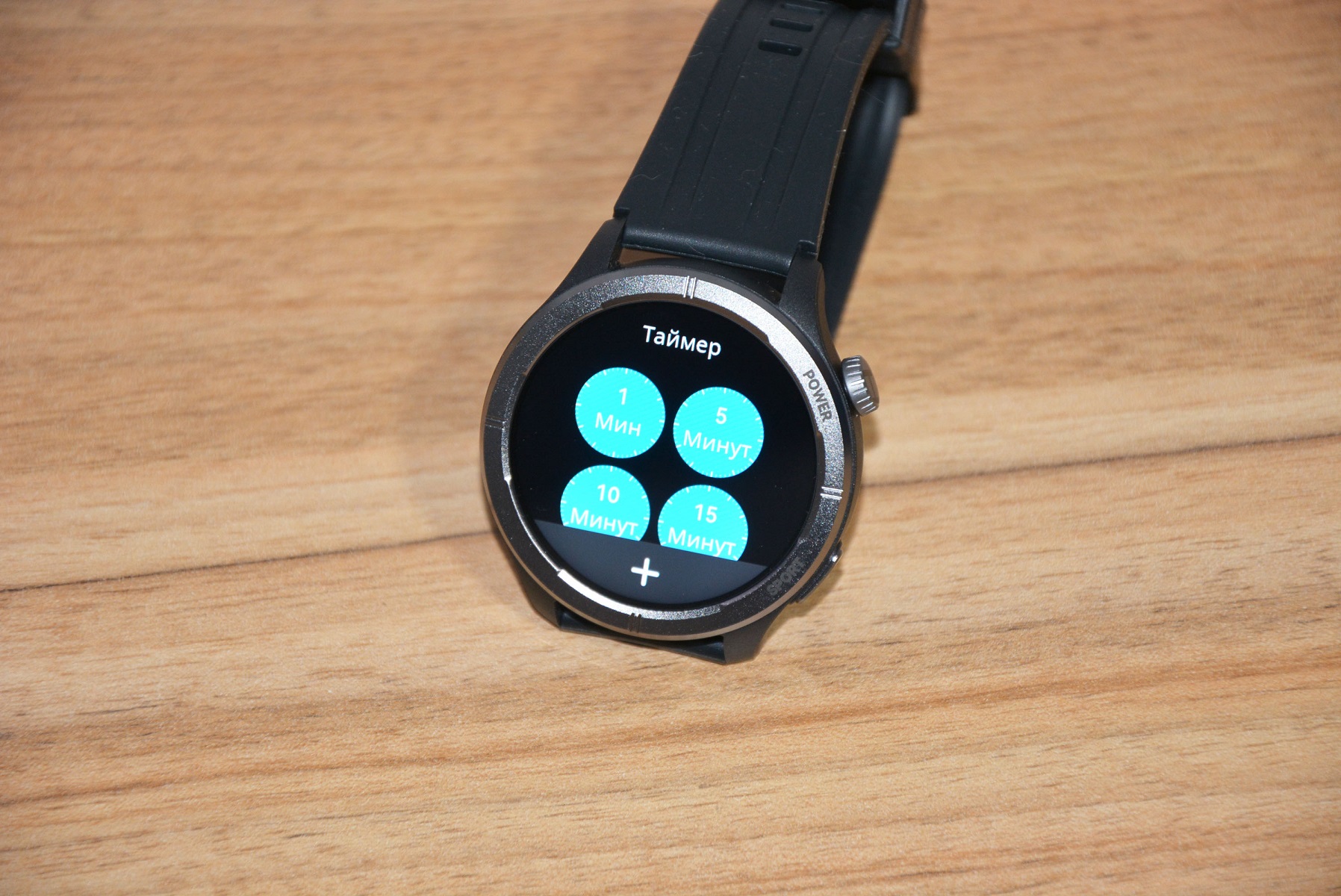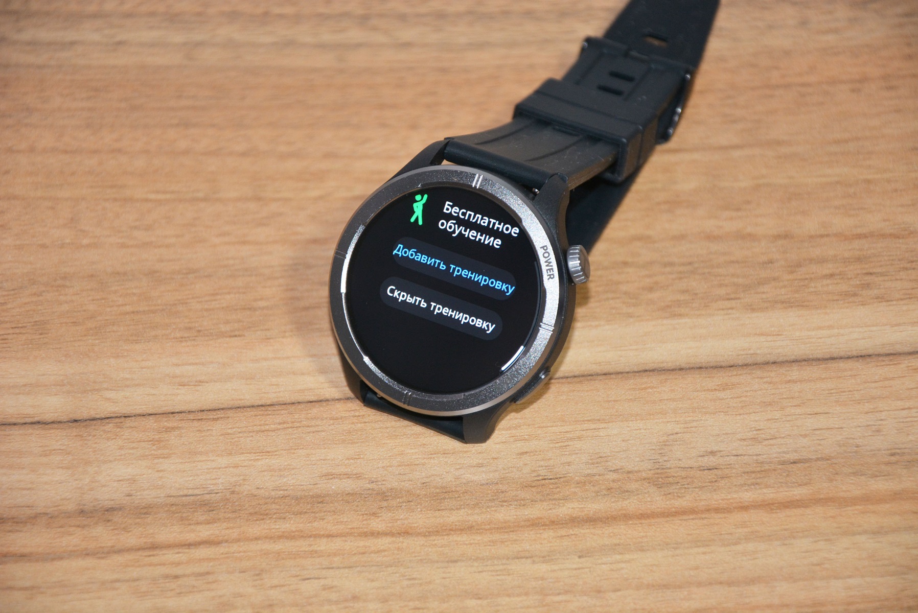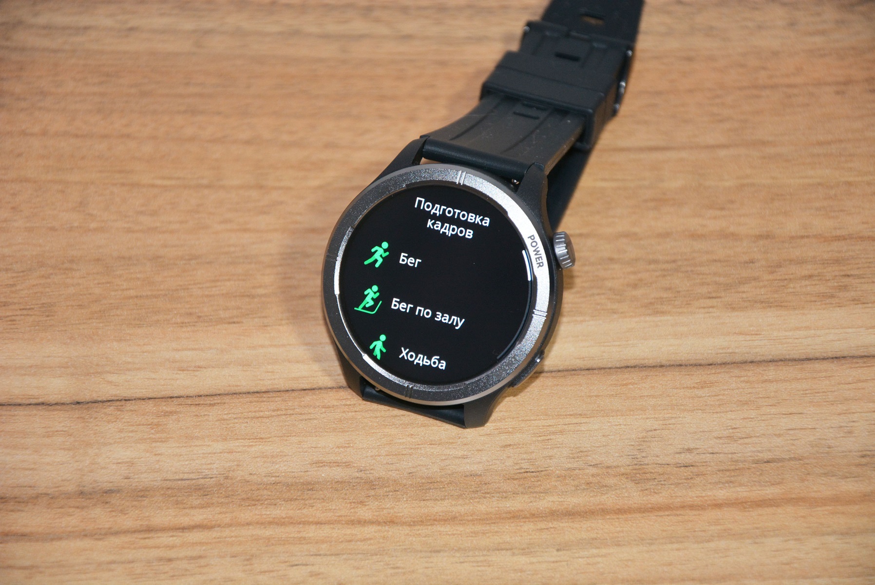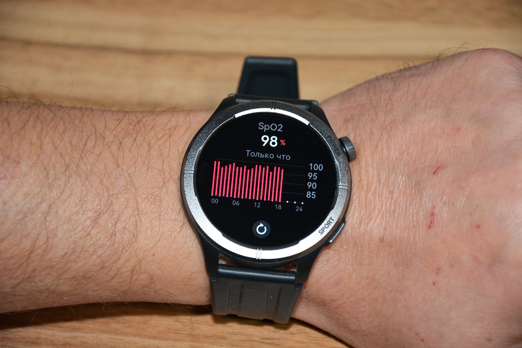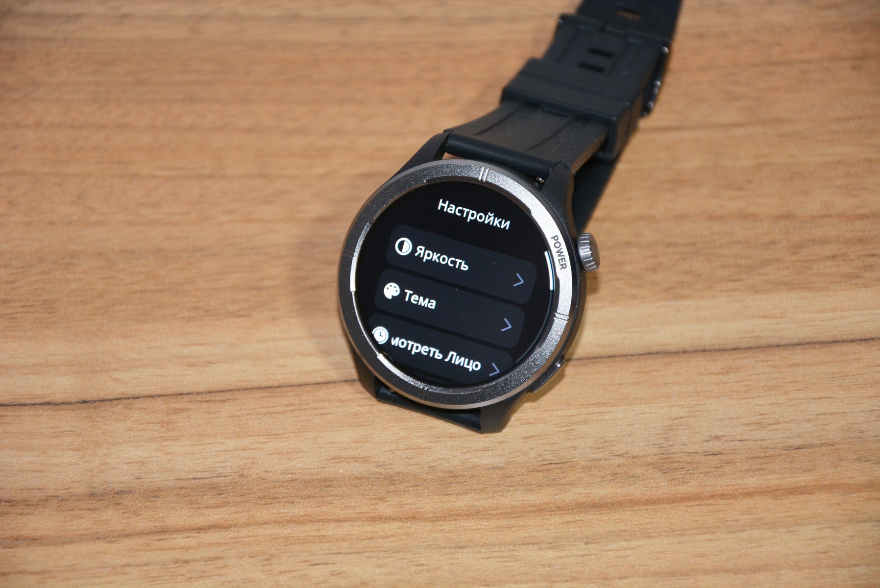 Экран практически не имеет рамки, но имеет олеофобное покрытие. Не самое лучшее, но существенно снижающее количество отпечатков пальцев. К сенсору претензий нет вообще — чуткий, без ложных срабатываний. На безеле надписи назначения кнопок, которых тут всего две. Верхняя, стилизованная под заводную головку, включает, выключает часы длительным удержанием, кратким возвращает в предыдущий пункт интерфейса, при нажатии открывает меню всех функций часов. Работает как энкодер — вращая ее можно быстро найти требуемую функцию, что несомненно удобно. Нижняя кнопка открывает меню спортивных режимов. На левой стороне пусто.