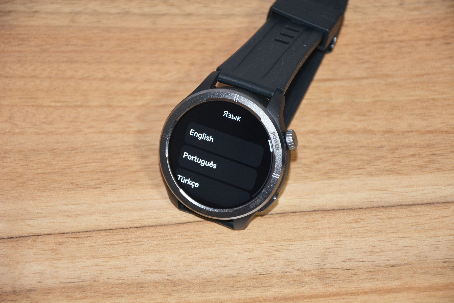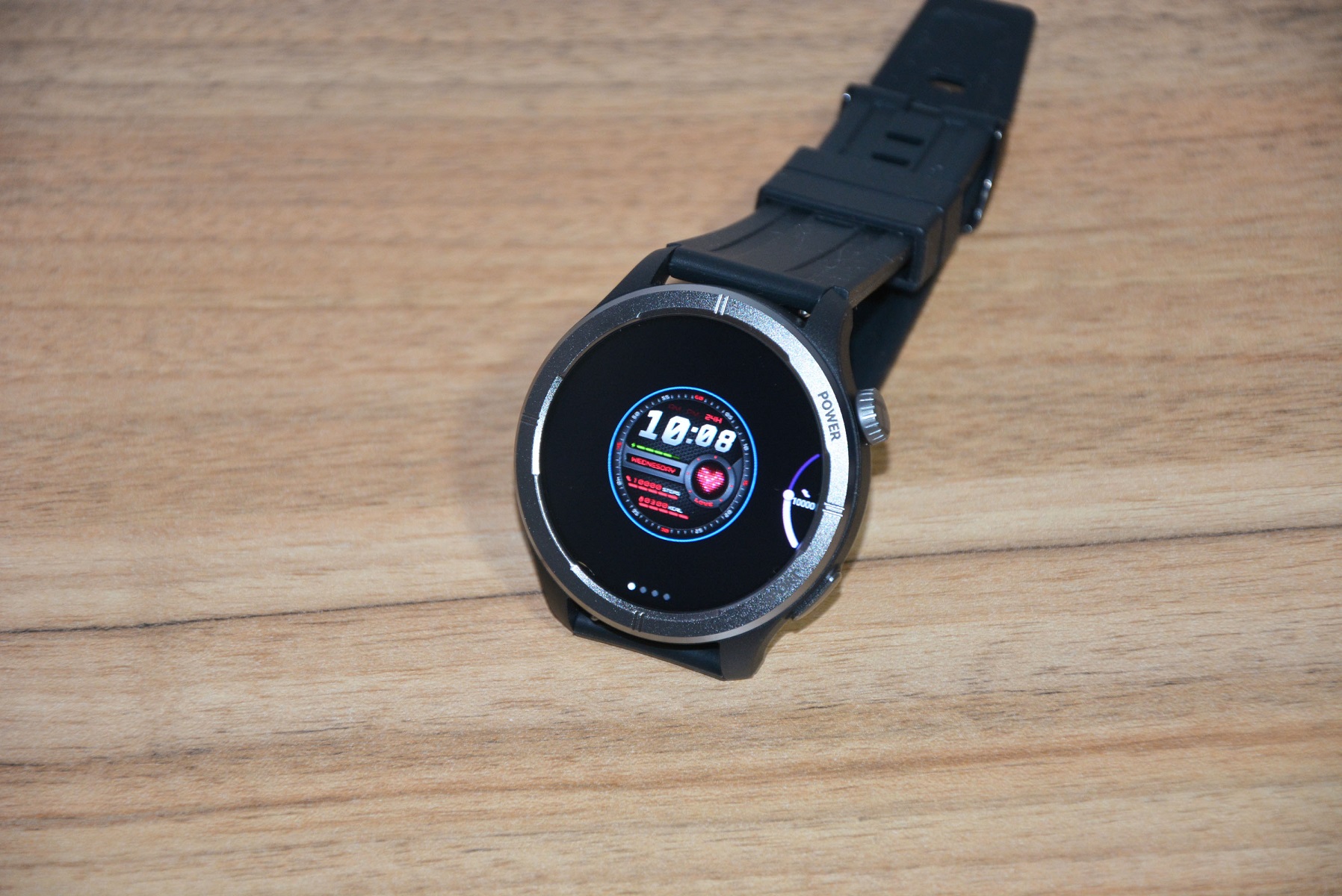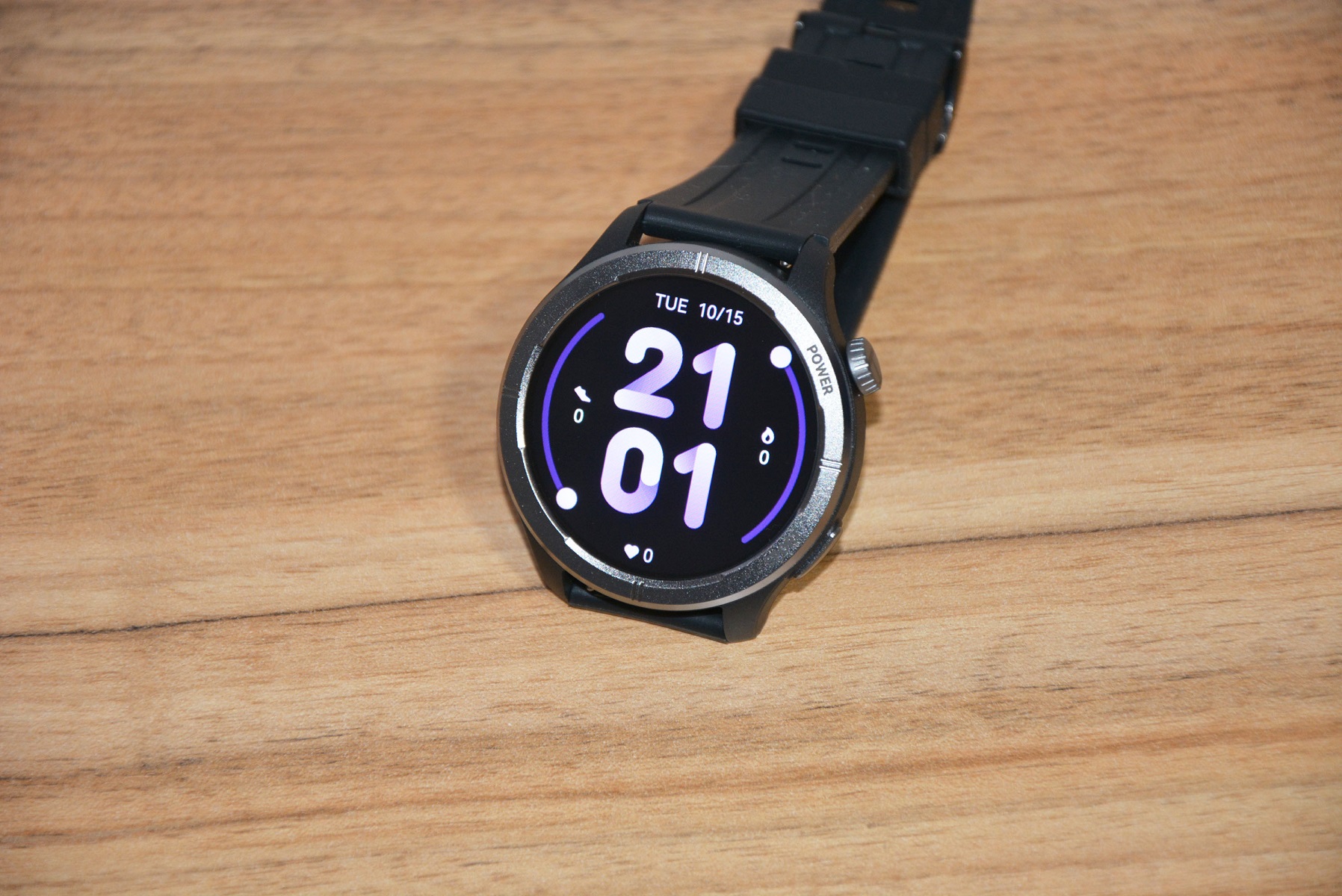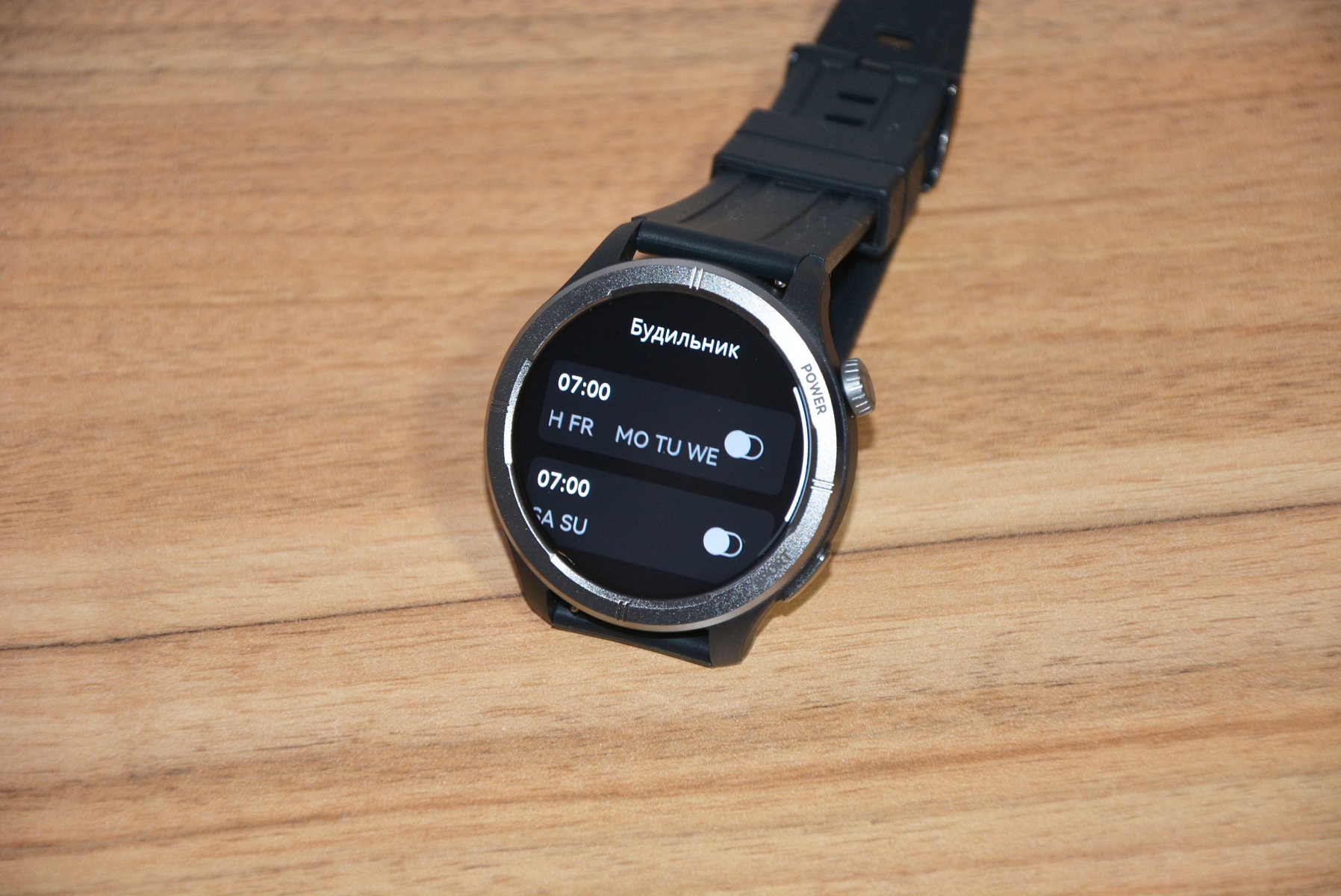 Экран практически не имеет рамки, но имеет олеофобное покрытие. Не самое лучшее, но существенно снижающее количество отпечатков пальцев. К сенсору претензий нет вообще — чуткий, без ложных срабатываний. На безеле надписи назначения кнопок, которых тут всего две. Верхняя, стилизованная под заводную головку, включает, выключает часы длительным удержанием, кратким возвращает в предыдущий пункт интерфейса, при нажатии открывает меню всех функций часов. Работает как энкодер — вращая ее можно быстро найти требуемую функцию, что несомненно удобно. Нижняя кнопка открывает меню спортивных режимов. На левой стороне пусто.