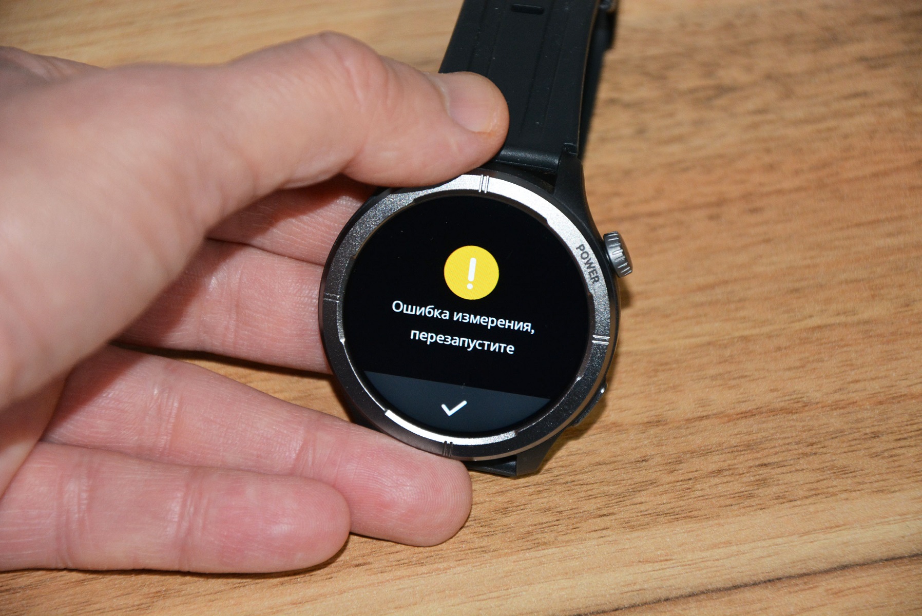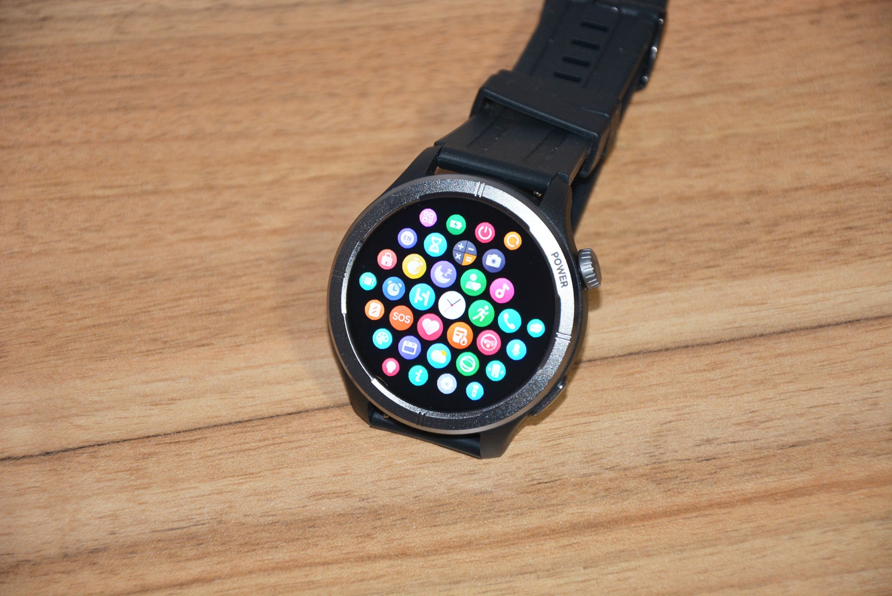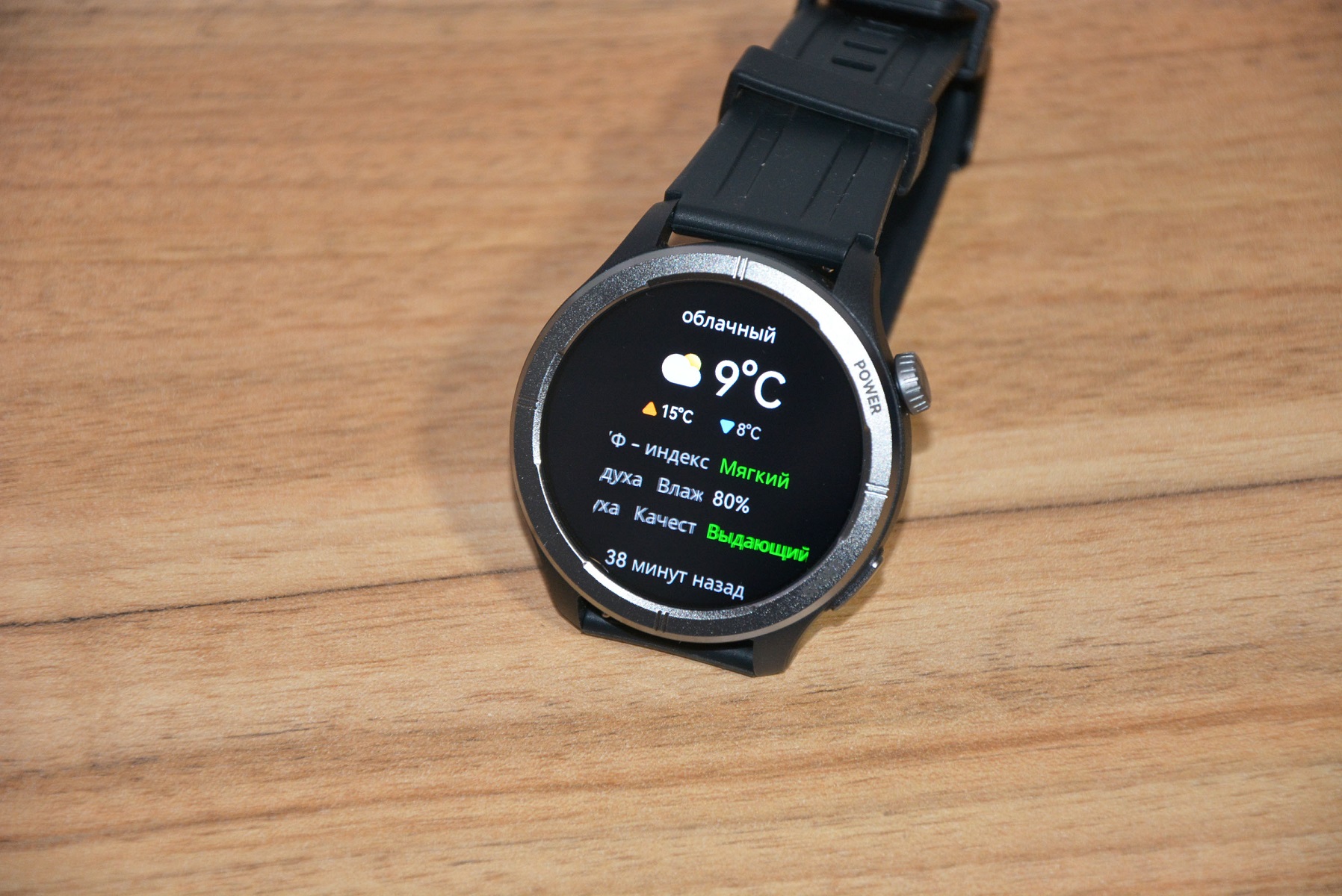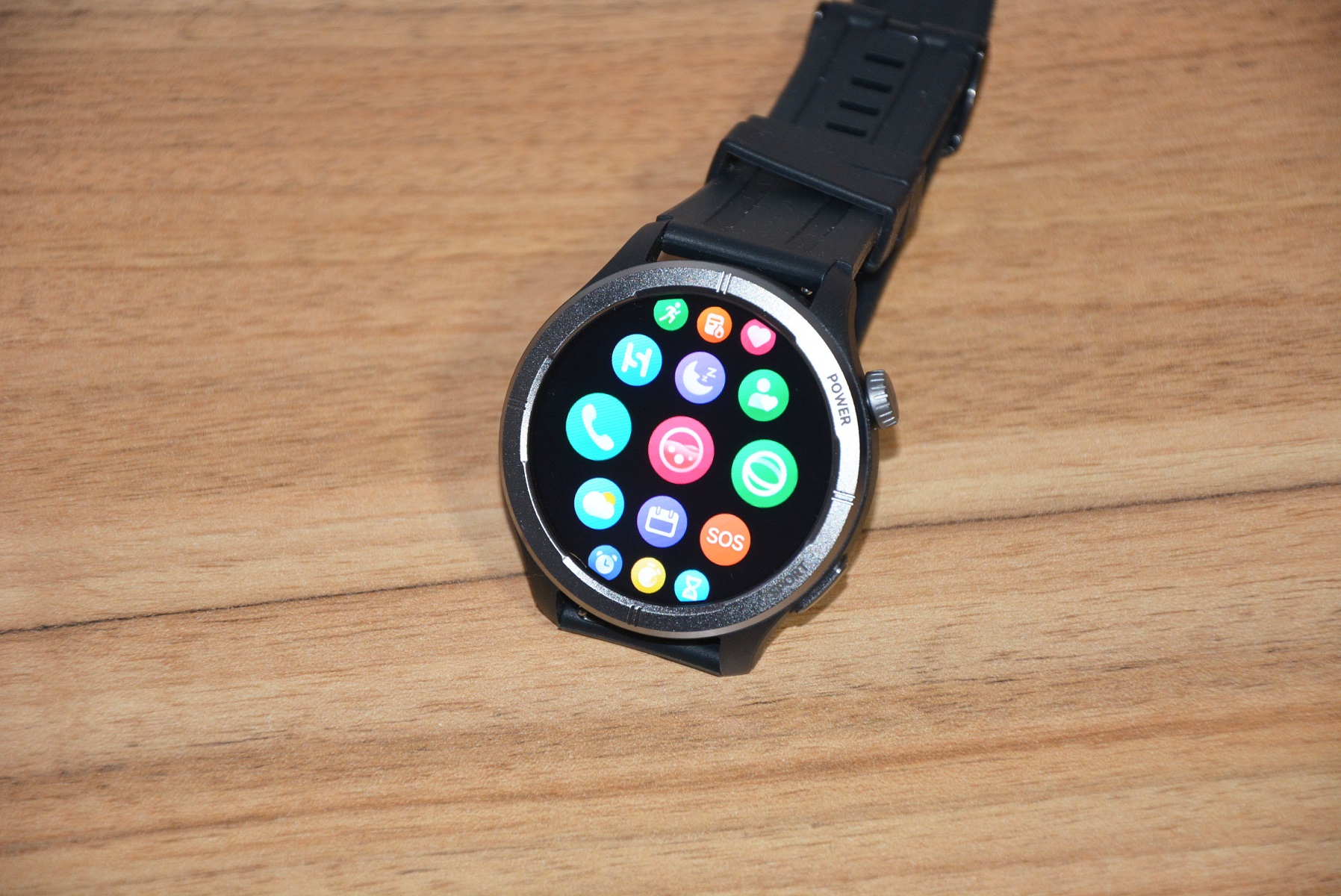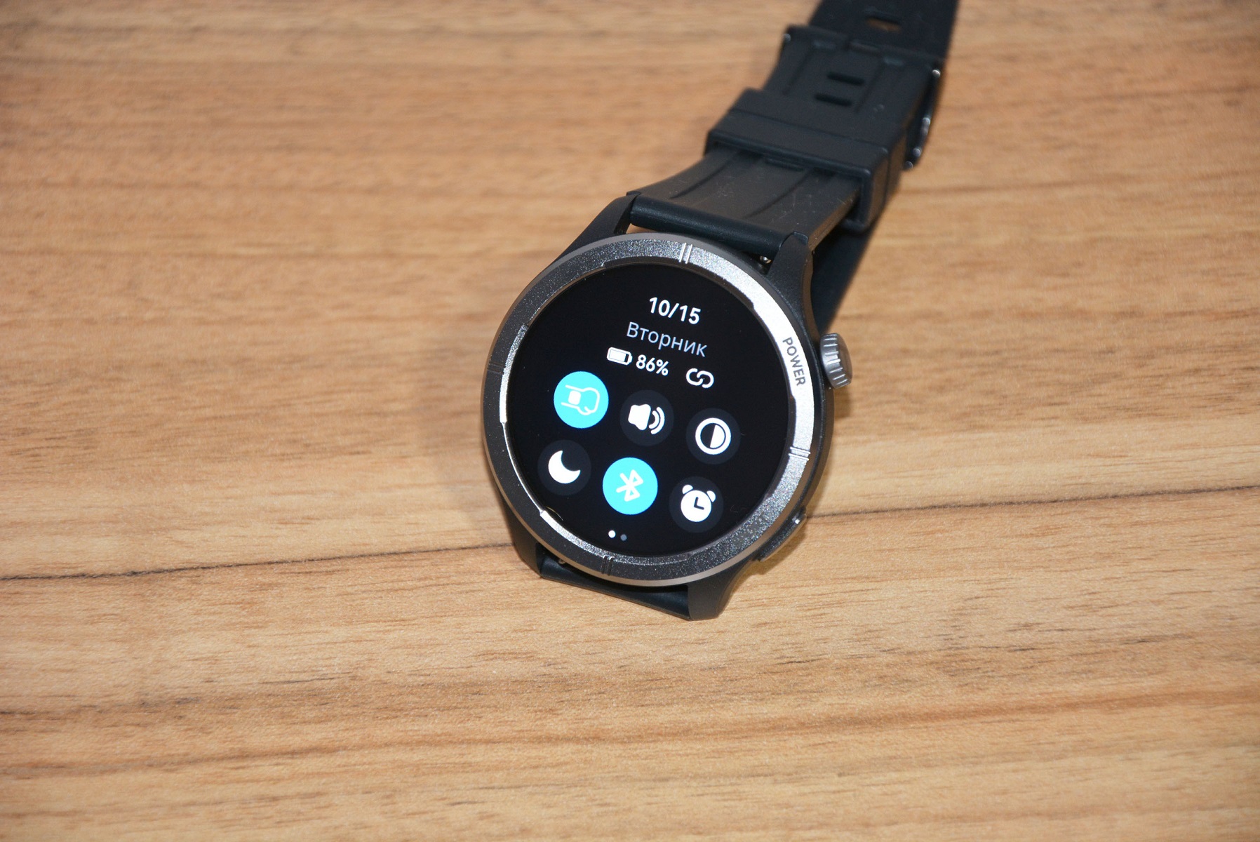 Экран практически не имеет рамки, но имеет олеофобное покрытие. Не самое лучшее, но существенно снижающее количество отпечатков пальцев. К сенсору претензий нет вообще — чуткий, без ложных срабатываний. На безеле надписи назначения кнопок, которых тут всего две. Верхняя, стилизованная под заводную головку, включает, выключает часы длительным удержанием, кратким возвращает в предыдущий пункт интерфейса, при нажатии открывает меню всех функций часов. Работает как энкодер — вращая ее можно быстро найти требуемую функцию, что несомненно удобно. Нижняя кнопка открывает меню спортивных режимов. На левой стороне пусто.