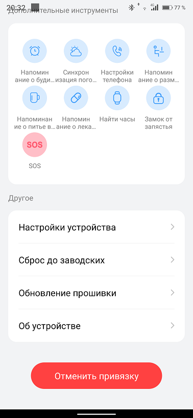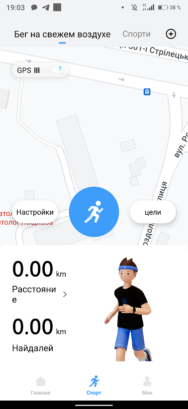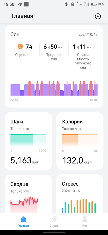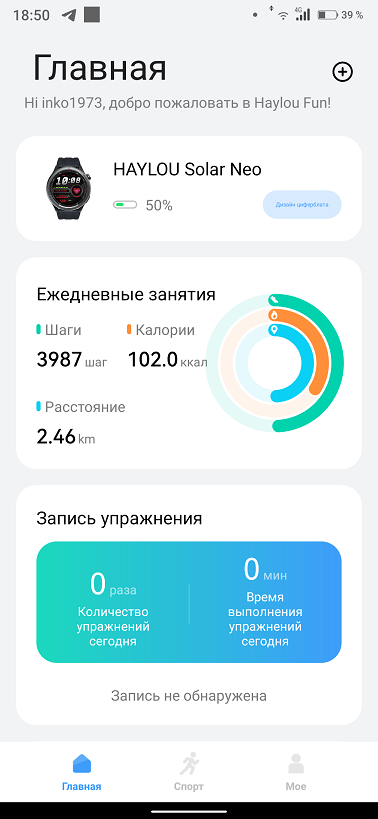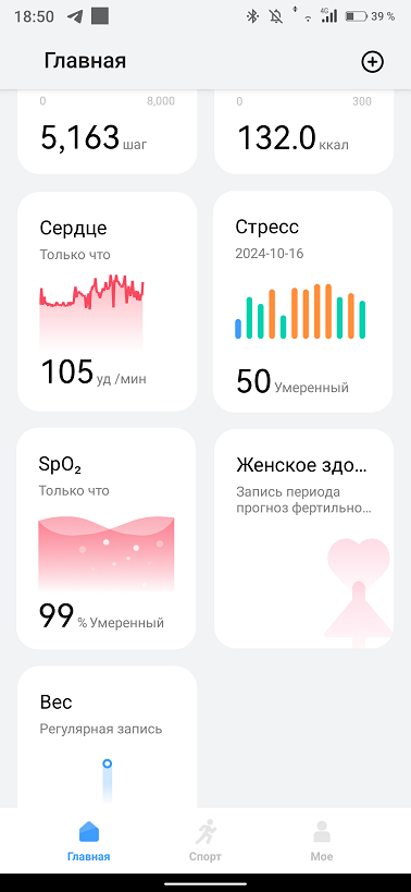 На главном экране приложения кроме вышеназванных функций добавляется функция женского здоровья и вес пользователя. Запустить измерения можно только с самих часов и приложение тут выступает в роли регистратора для сбора данных и удобного их отображения. Своего GPS модуля в часах нет, используется модуль смартфона.